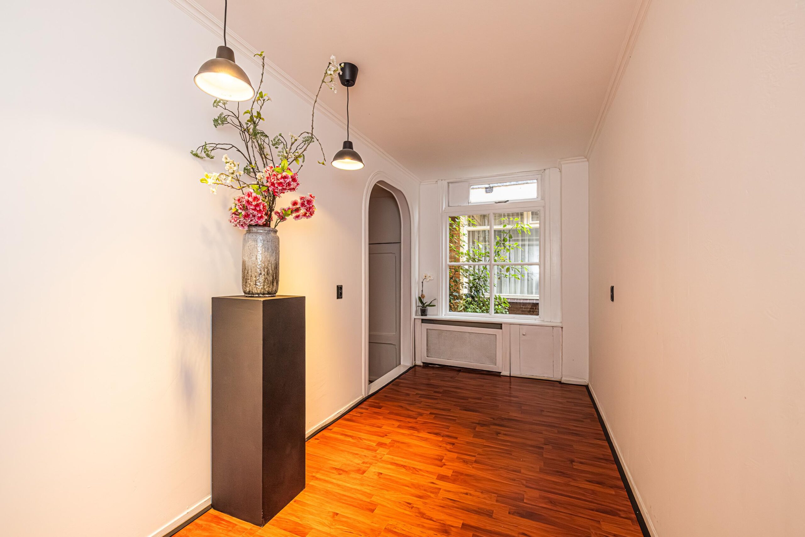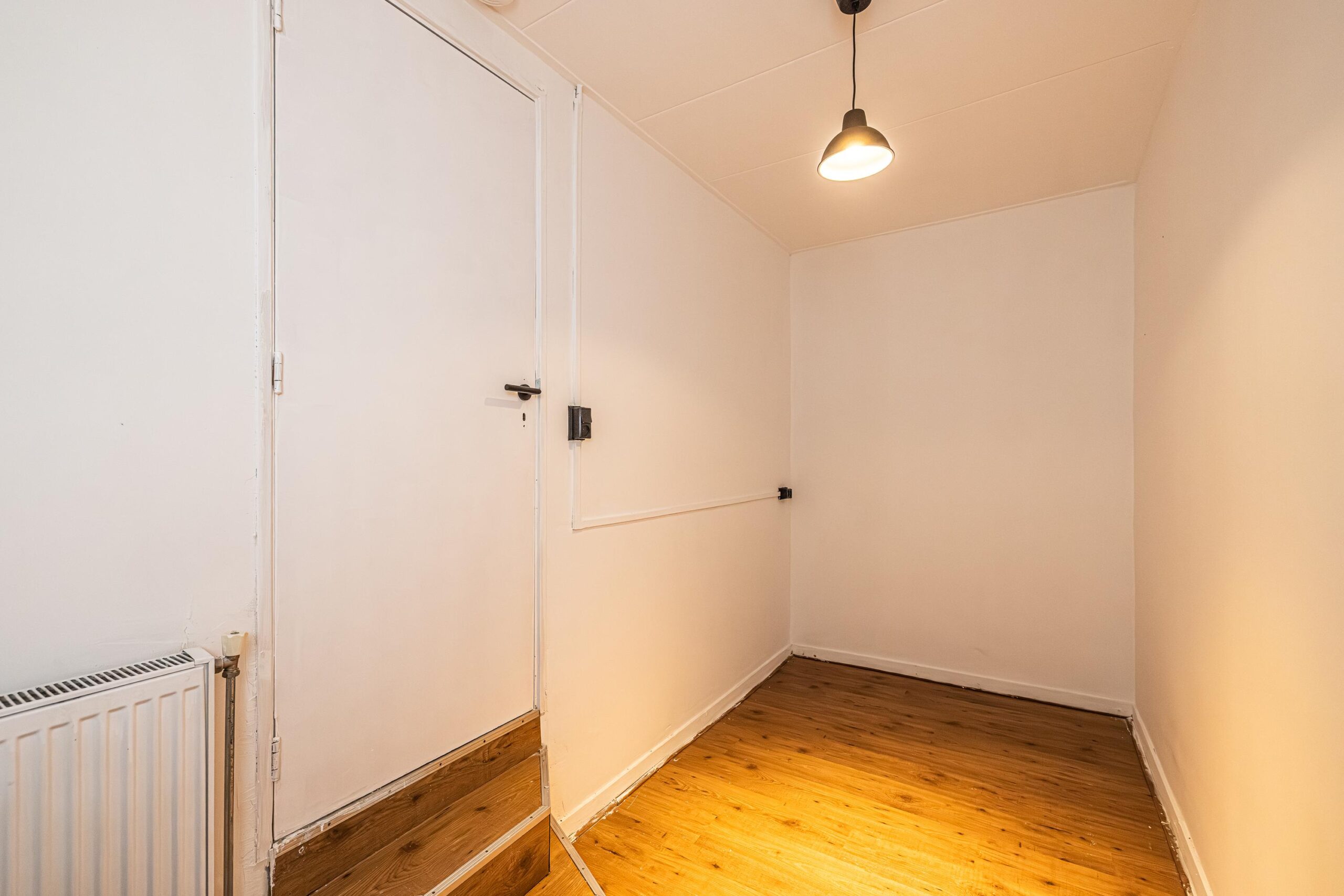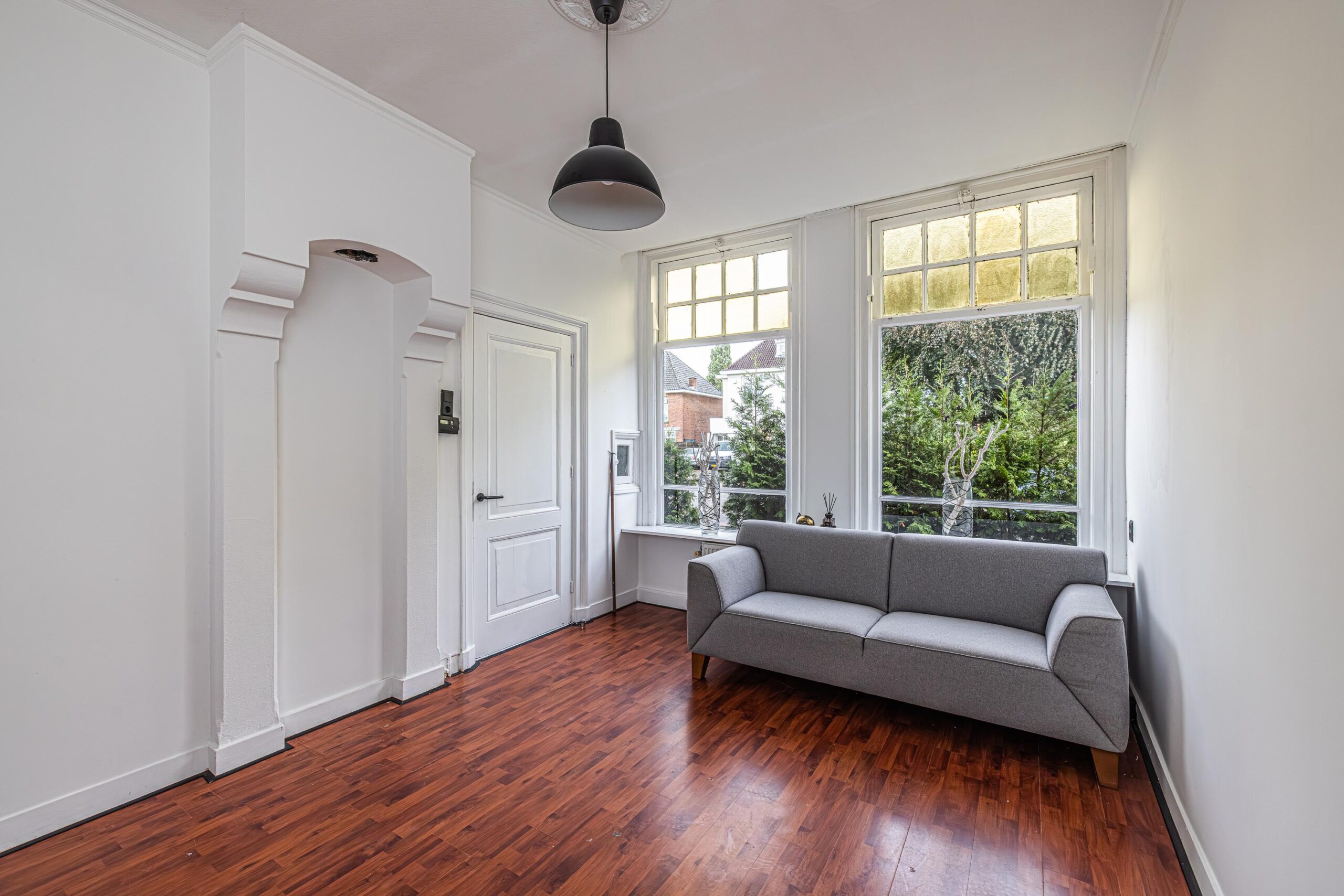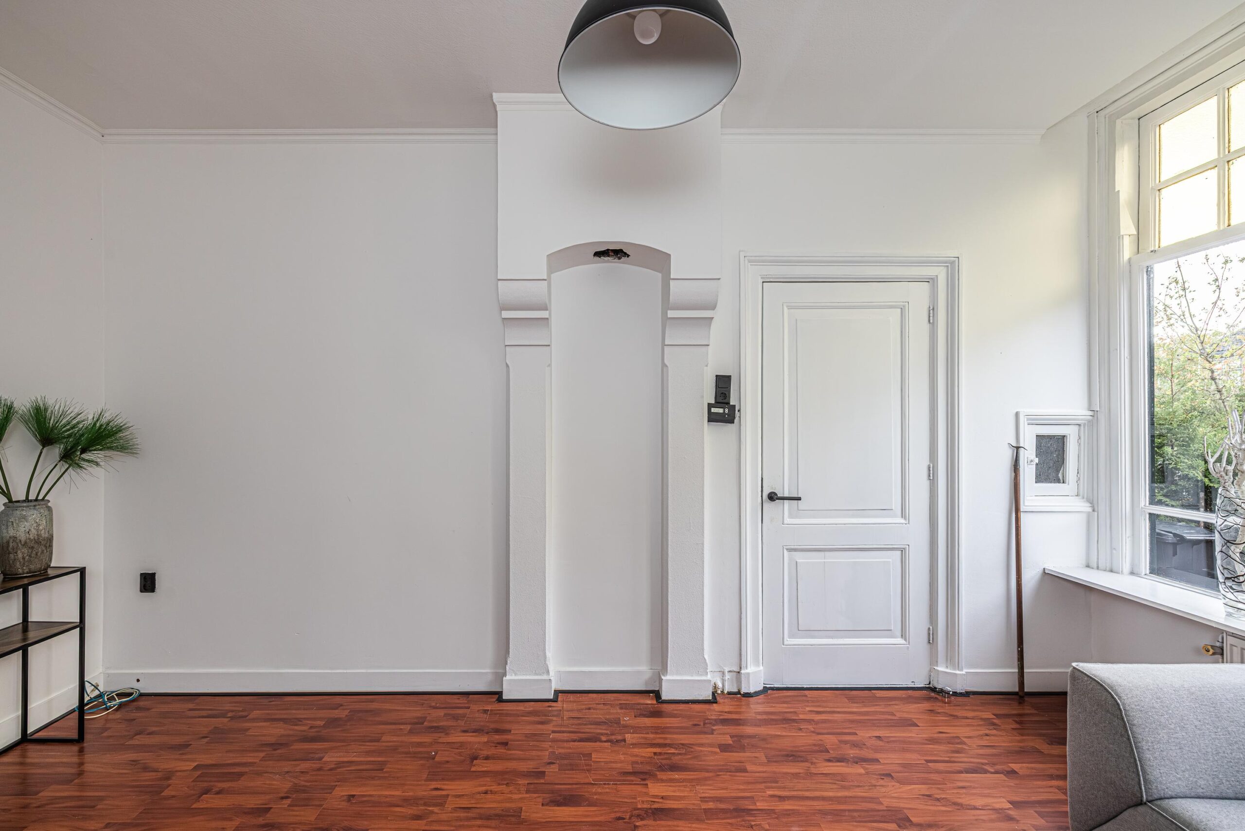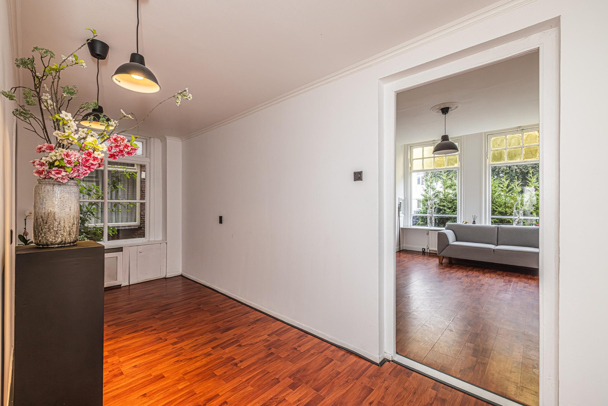 De hal met garderobe en een vaste kast waarin de opstelplaats voor de CV-combiketel. Vanuit de hal toegang tot een zijkamer (ca. 6 m2) met zijraam en hoog plafond, die te gebruiken is als slaapkamer of werkkamer. De woonkamer (18m2) heeft een sfeervolle schouw, een hoog plafond en originele hoge ramen aan de straatzijde waardoor deze heerlijk licht is. Aansluitend aan de woonkamer een "tussenkamer" van ca. 10 m2, die uitstekend gebruikt kan worden als eetkamer en/of werkkamer.