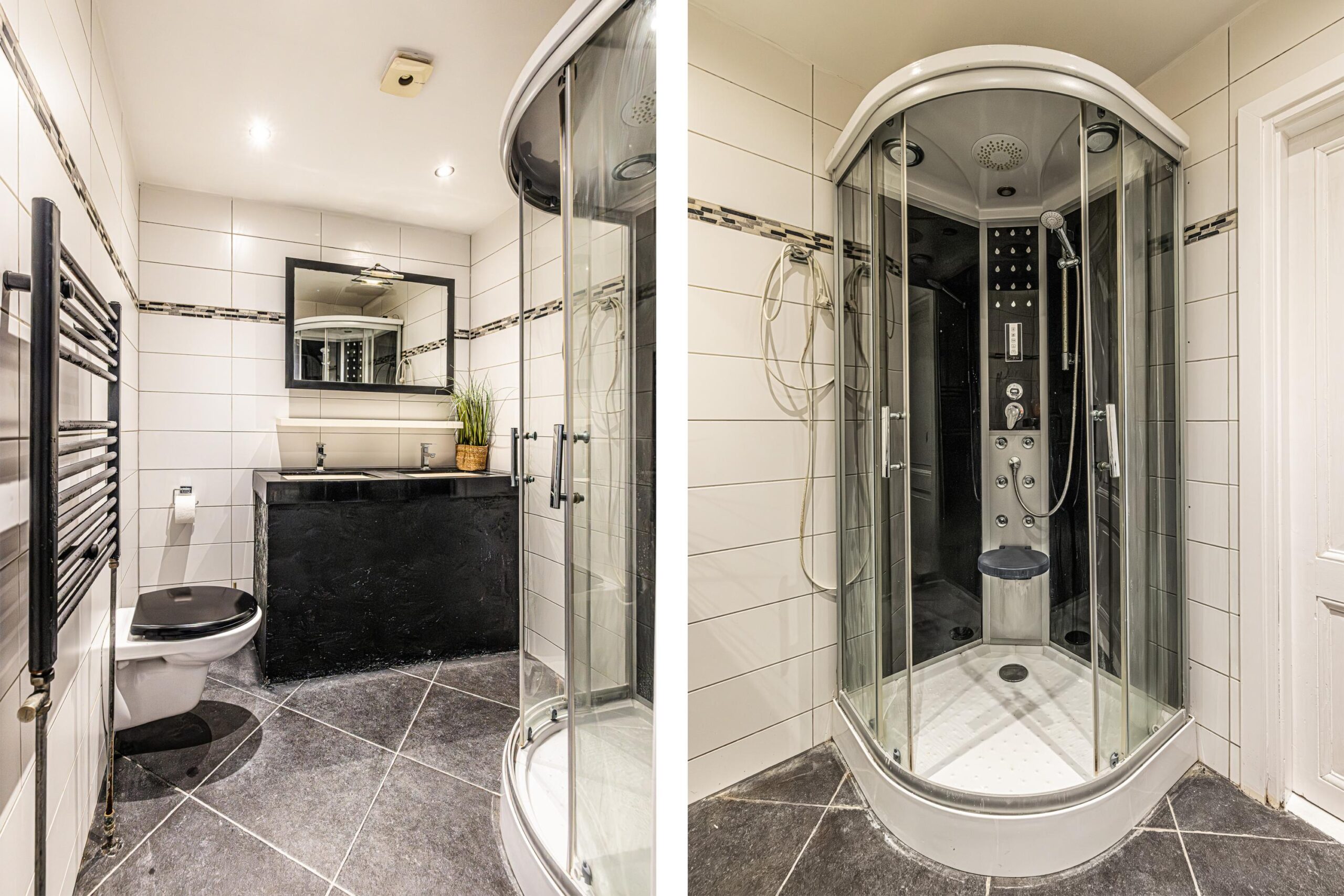 Verder de moderne badkamer welke is uitgevoerd met een toilet met vrijhangend closet, douchegelegenheid en dubbele vaste wastafel. De badkamer is volledig betegeld, is voorzien van modern wit sanitair en een combinatie van licht en antraciet gekleurde vloertegels, compleet met een designradiator.