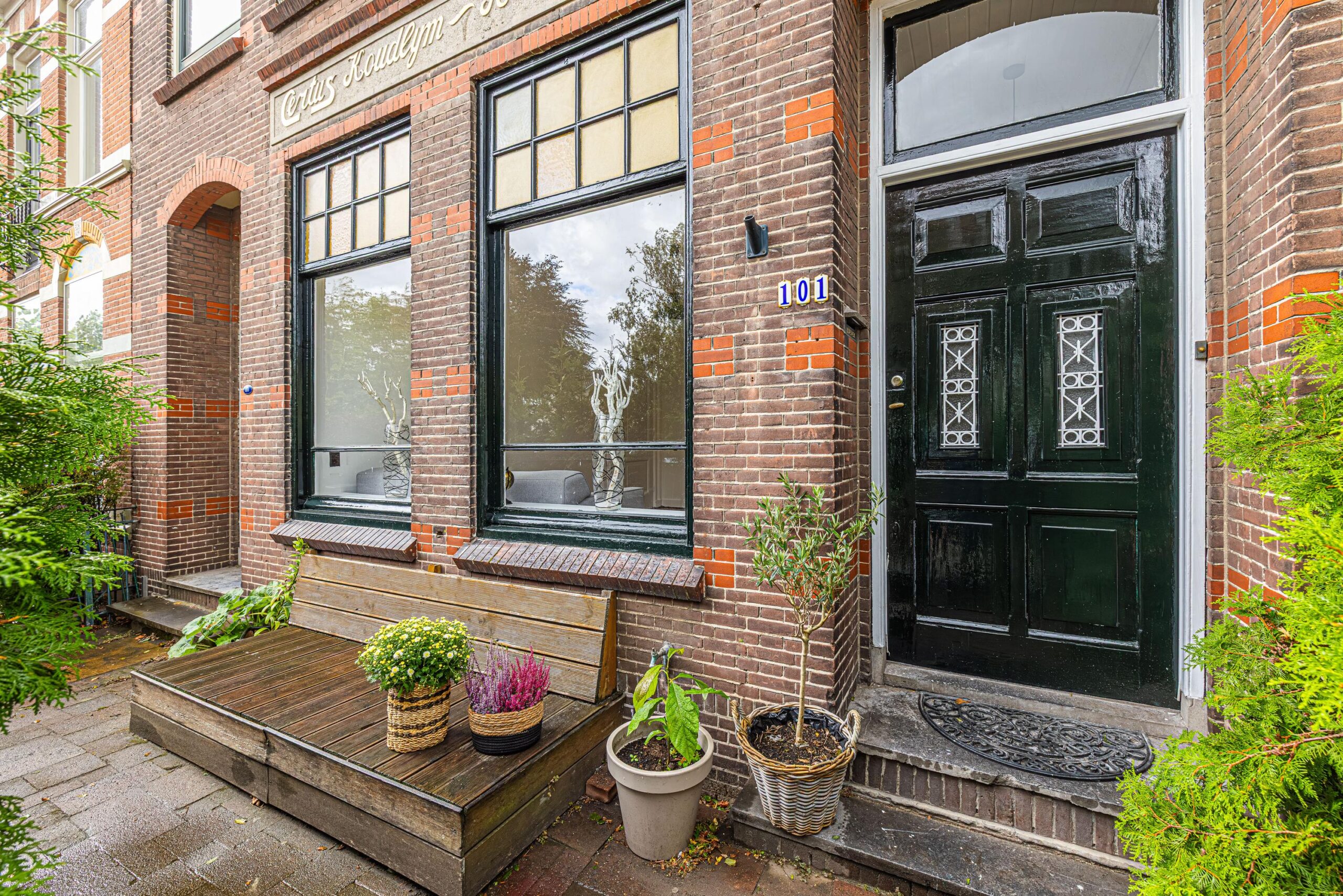 Entree aan voorzijde, middels een brede trap en brede en authentieke voordeur toegang tot de hal.