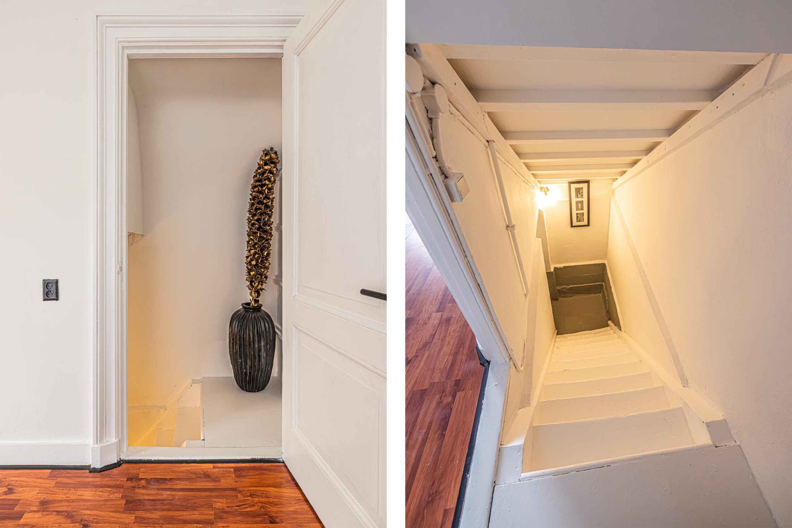 Vanuit de woonkamer een trap naar het onder de woonkamer gelegen souterrain.