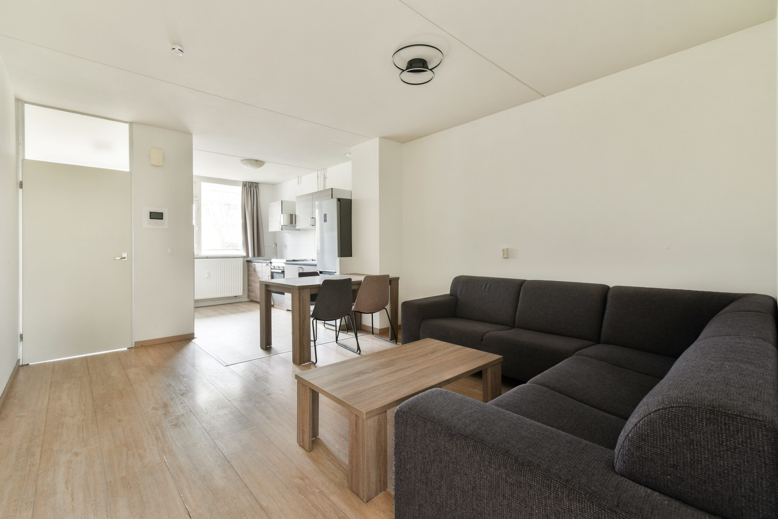 Het gehele appartement is afgewerkt met een licht grijze laminaat vloer en de wanden zijn wit gestuct.