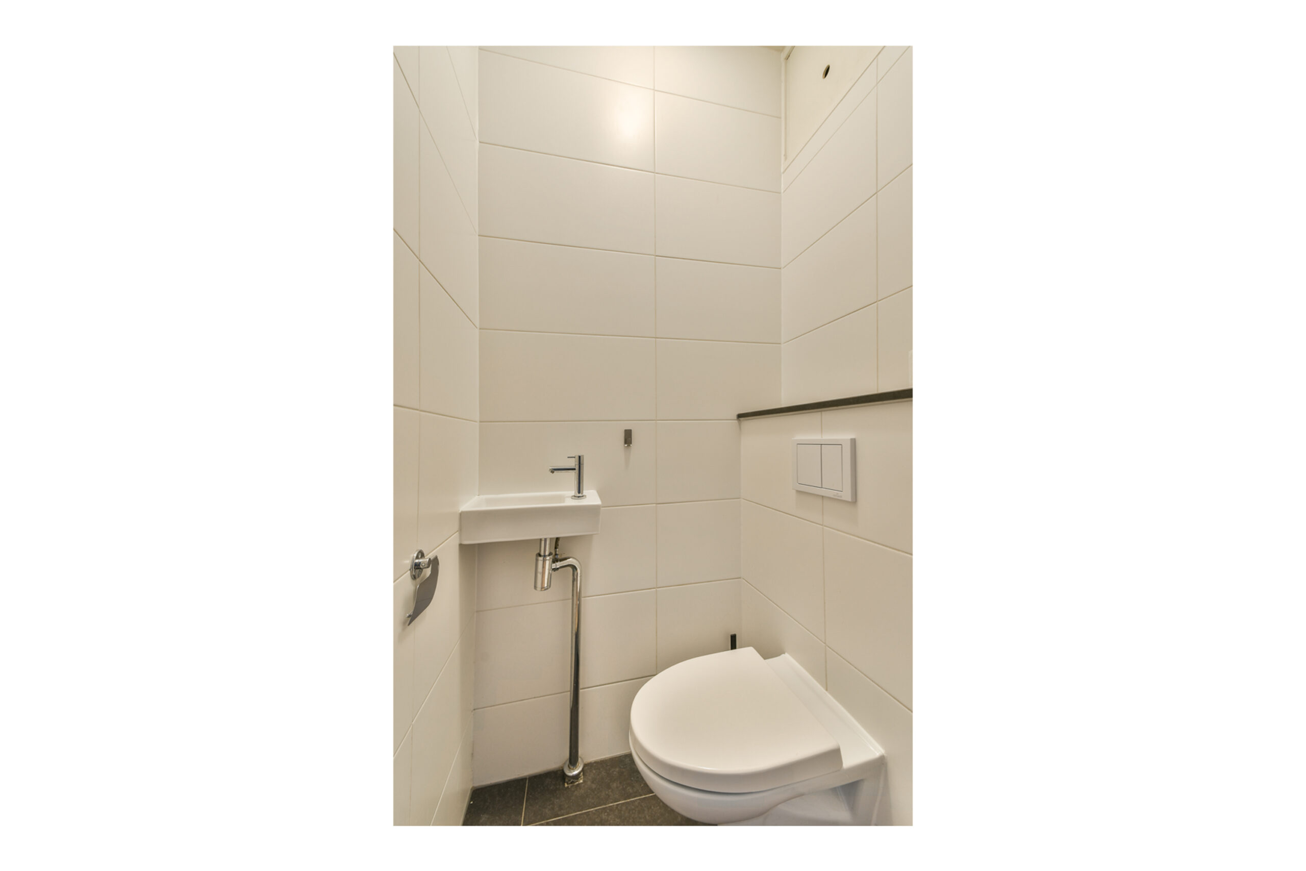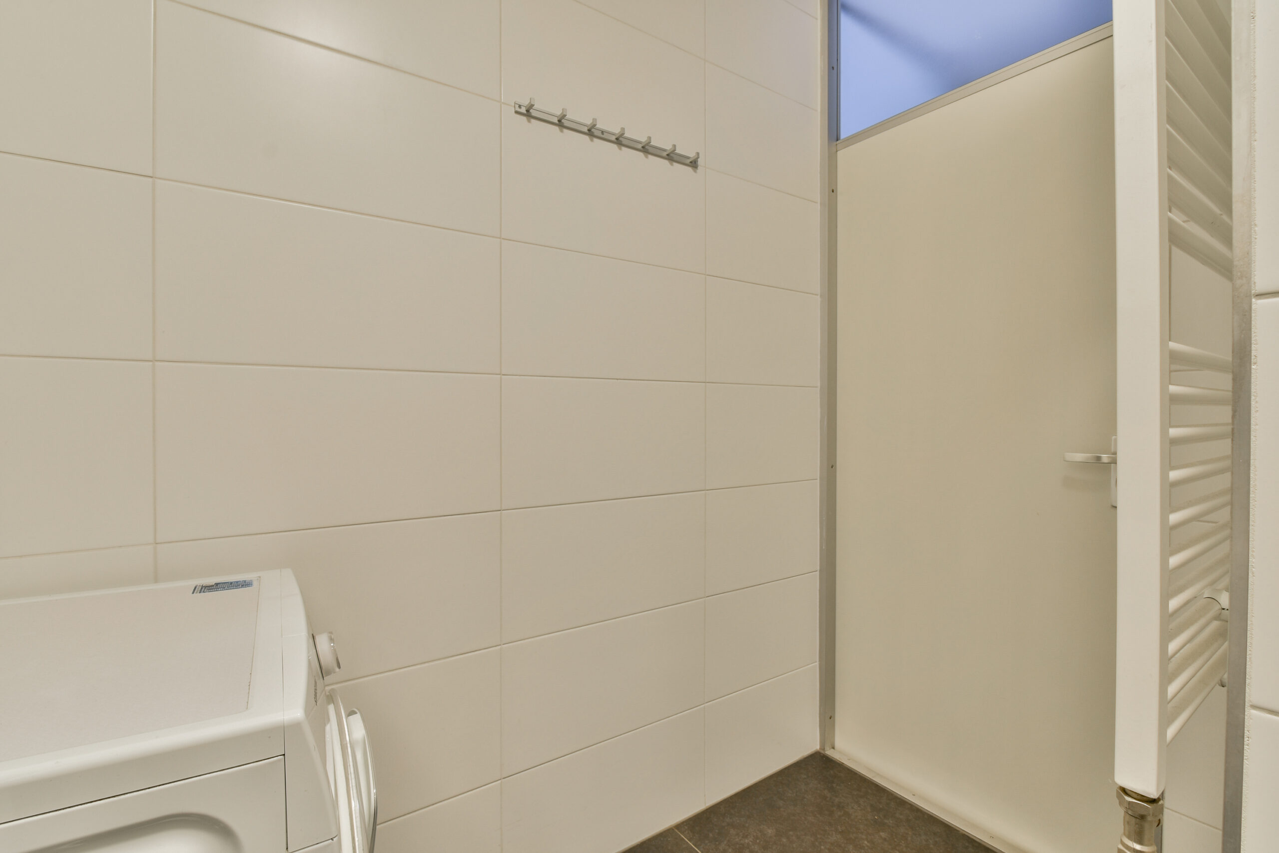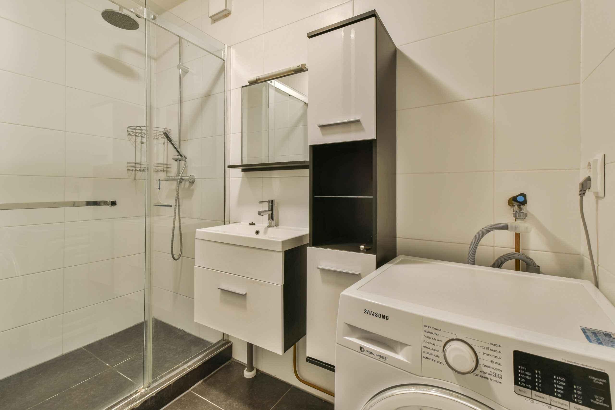 De badkamer is in het zwart-wit uitgevoerd (2016). In deze badkamer is een douche, wastafelmeubel en aansluiting voor de wasmachine te vinden.