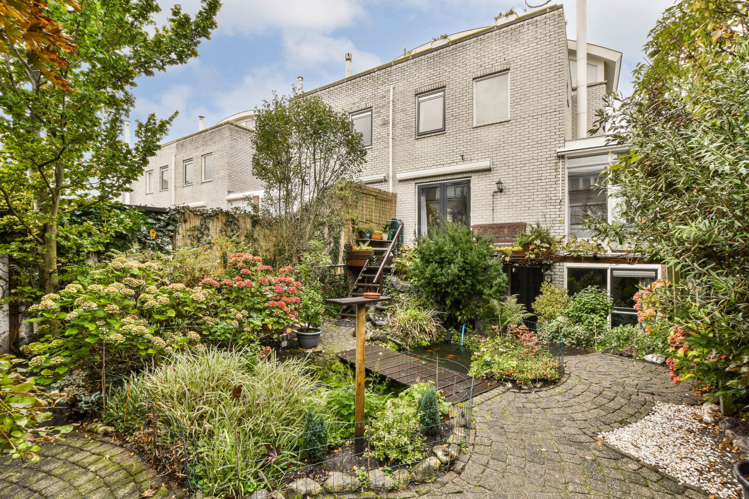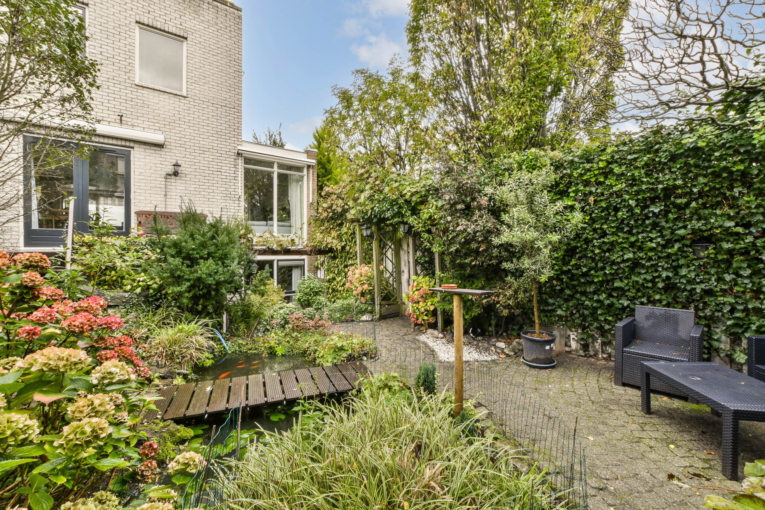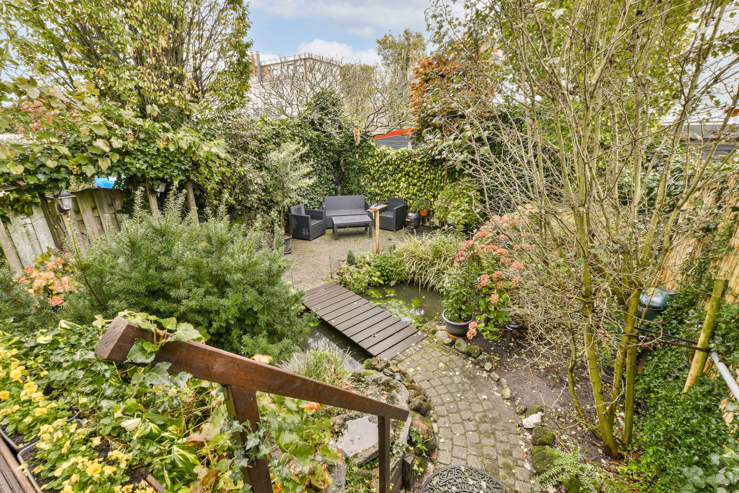 De speels ingerichte achtertuin is verdeeld over verschillende niveaus en er is diverse beplanting aanwezig, een vijver en terrassen zodat er altijd wel een heerlijke plek is om te genieten van de tuin. Tevens is er veel privacy en een achterom.