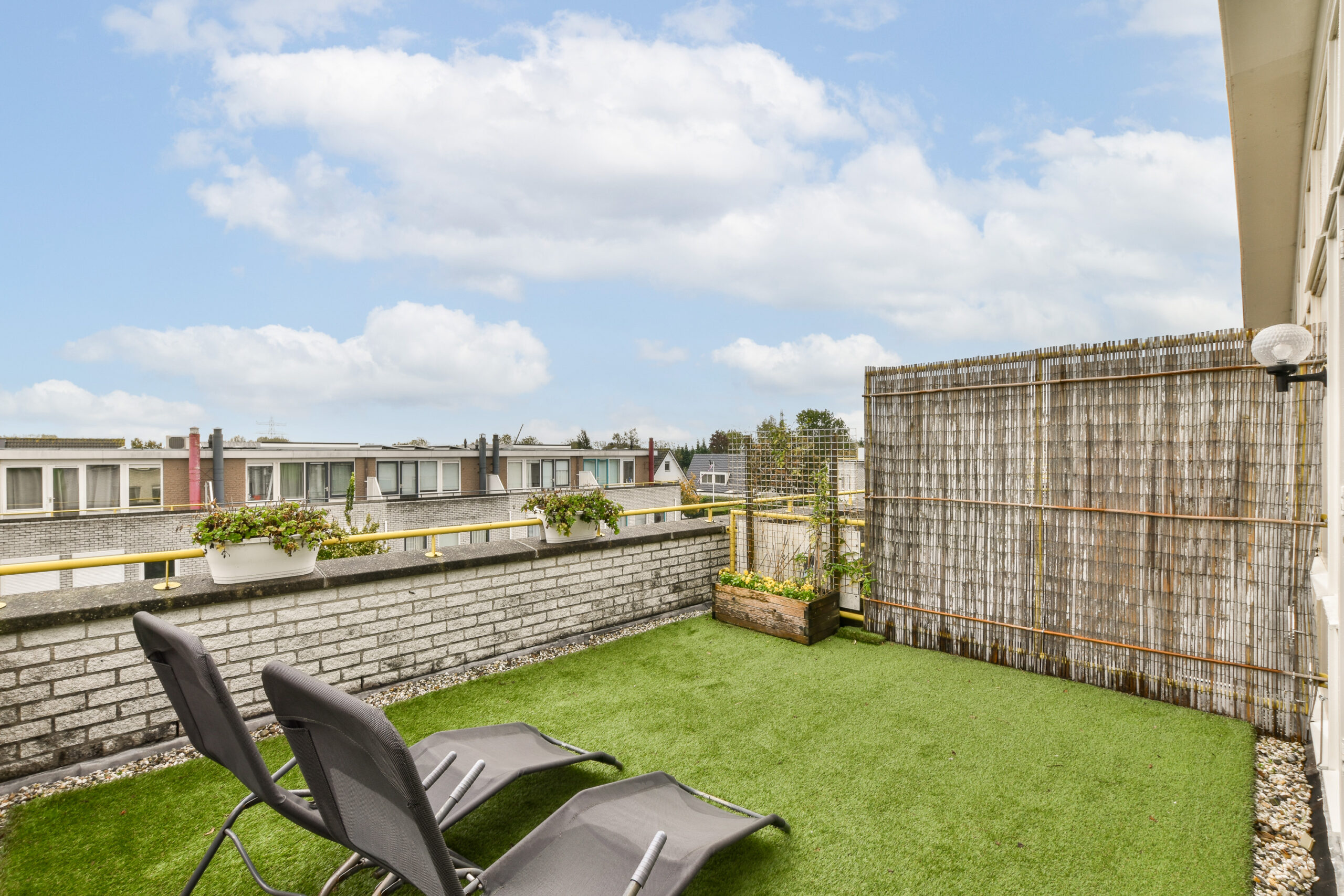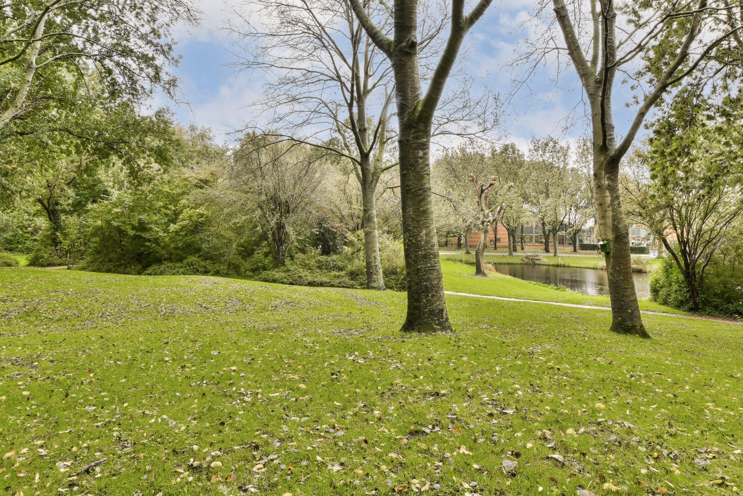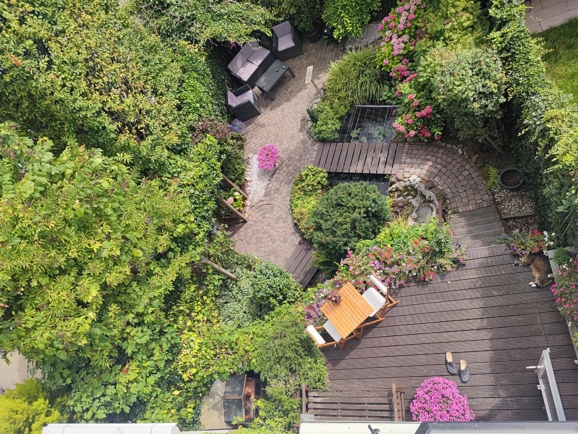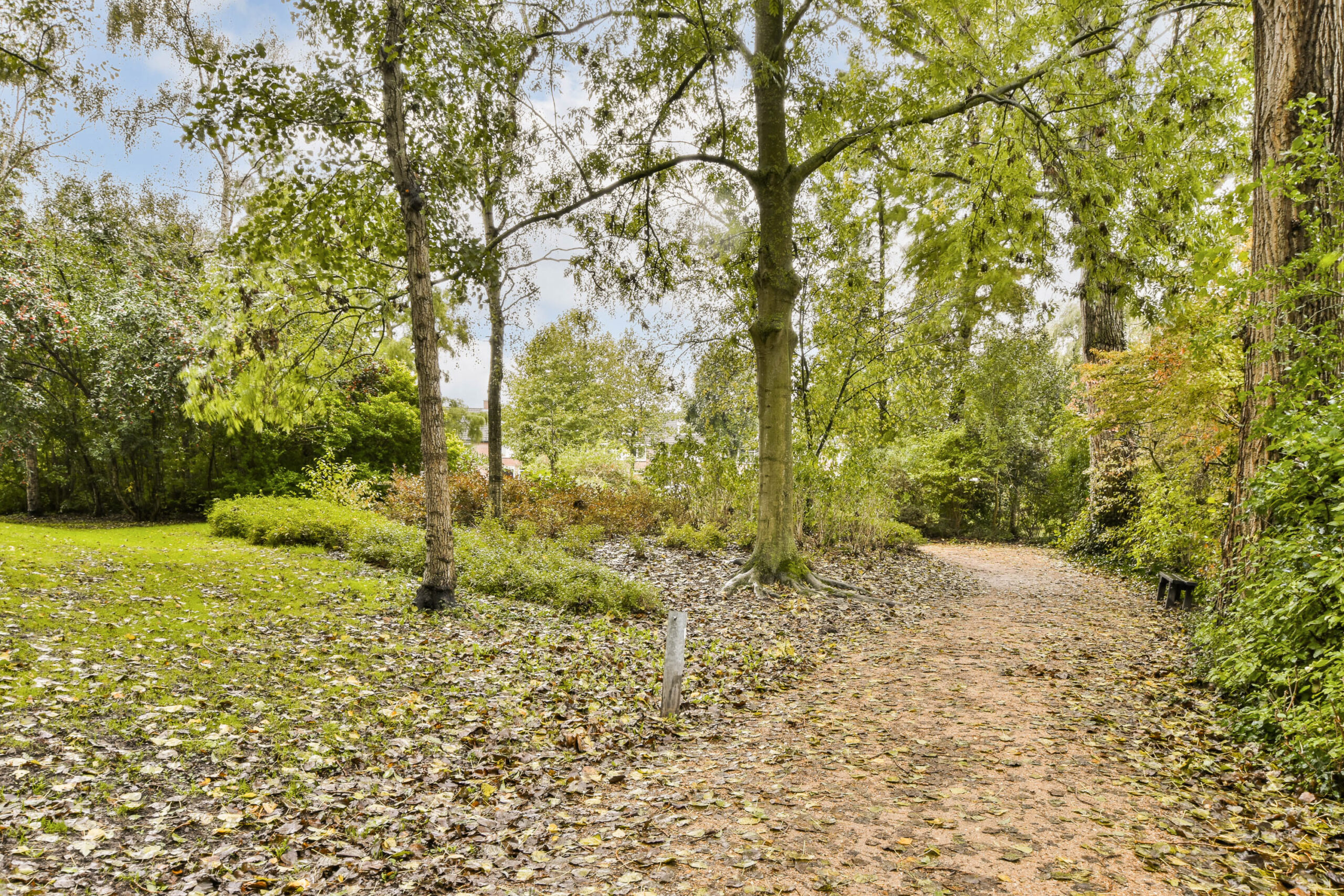 De speels ingerichte achtertuin is verdeeld over verschillende niveaus en er is diverse beplanting aanwezig, een vijver en terrassen zodat er altijd wel een heerlijke plek is om te genieten van de tuin. Tevens is er veel privacy en een achterom.