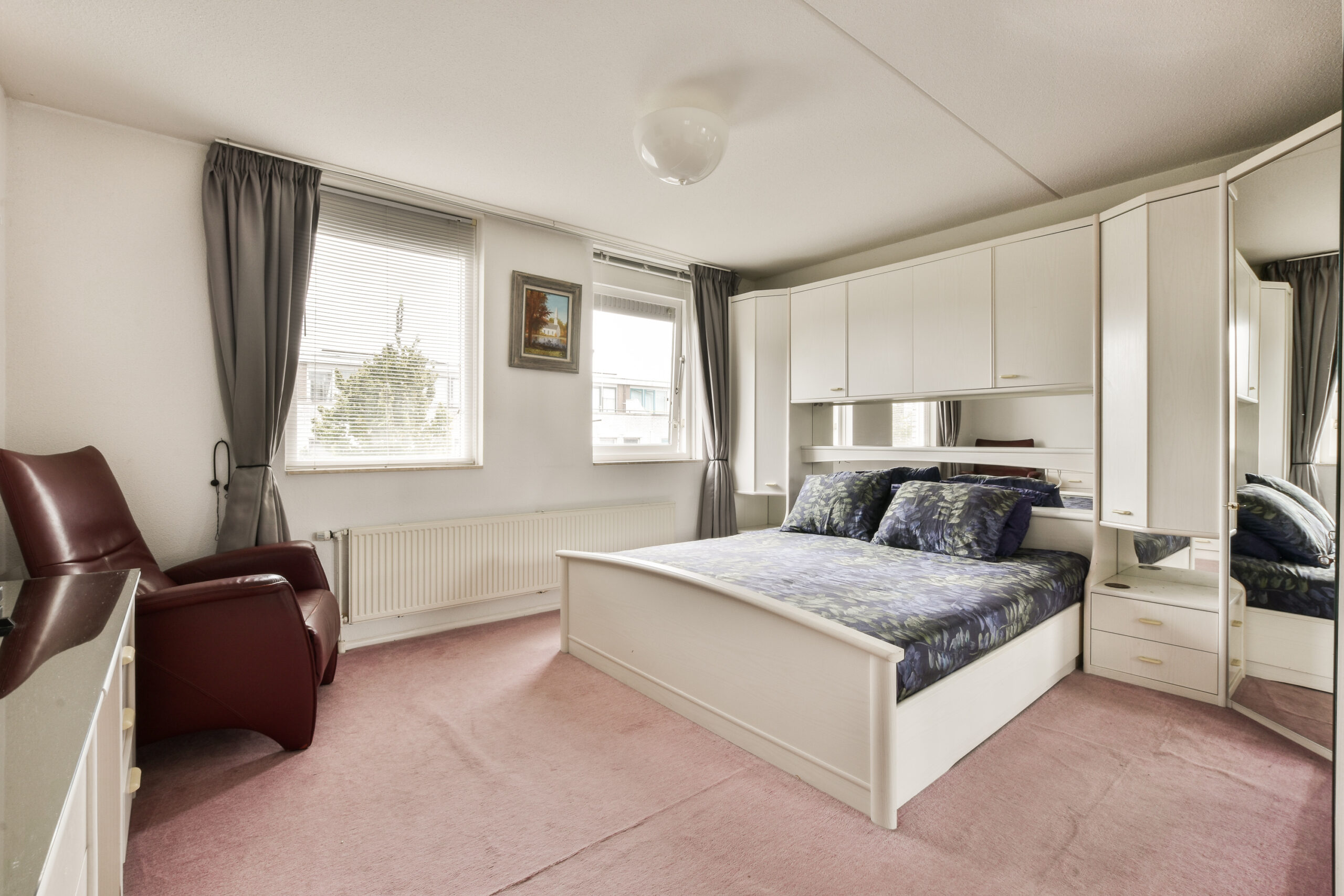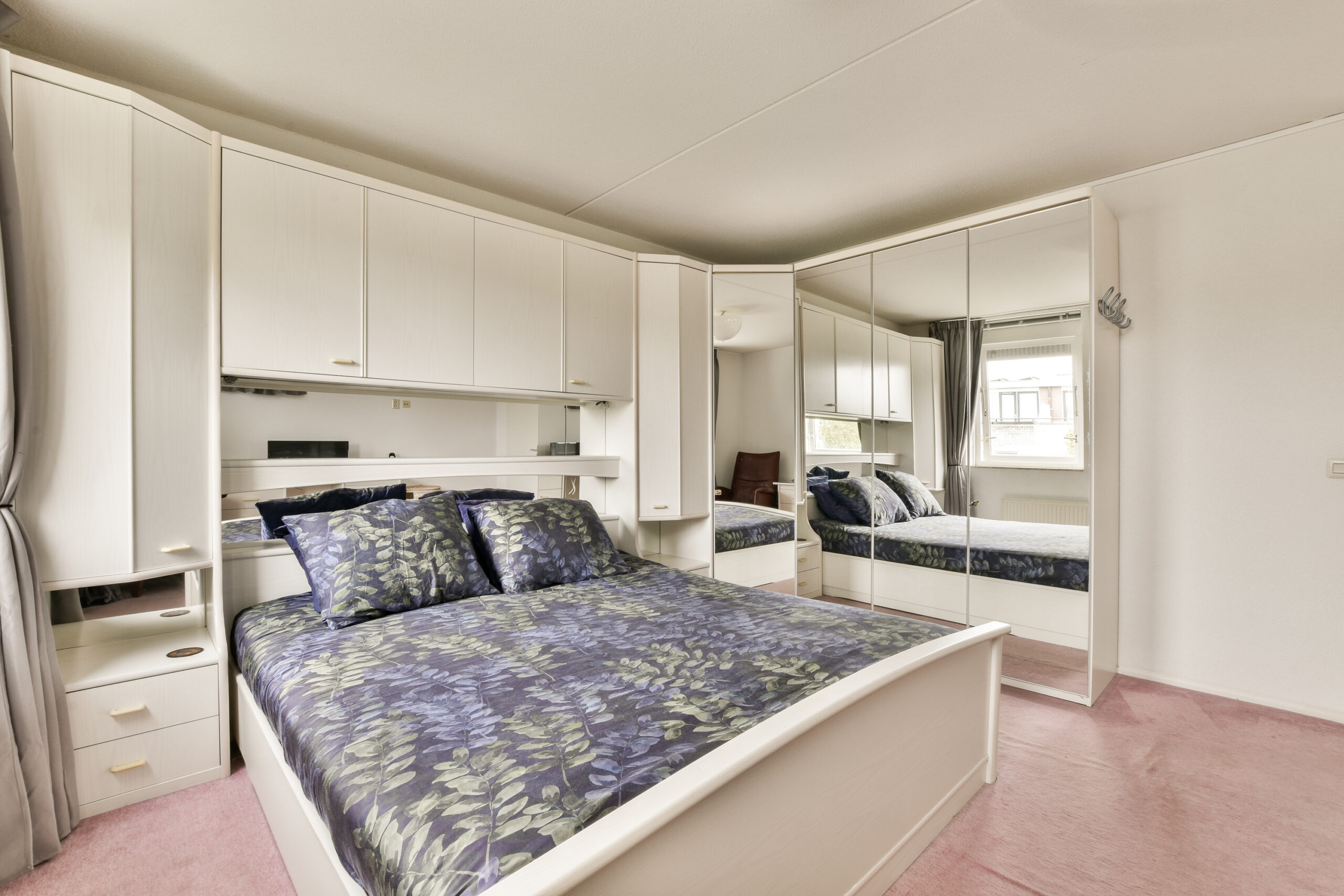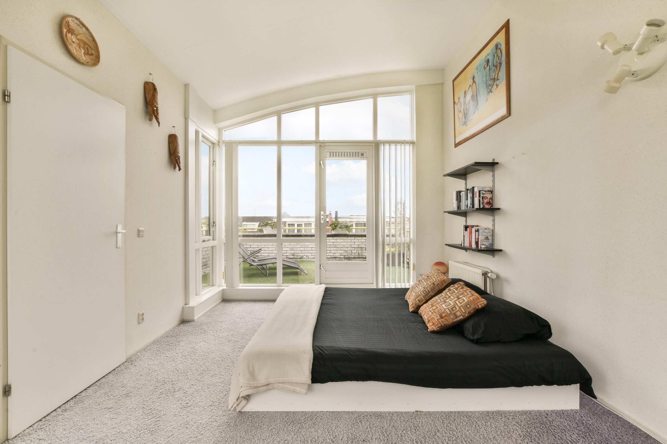 aan de zijkant. Deze slaapkamer heeft bijzonder veel lichtinval omdat er veel raampartijen aanwezig zijn.