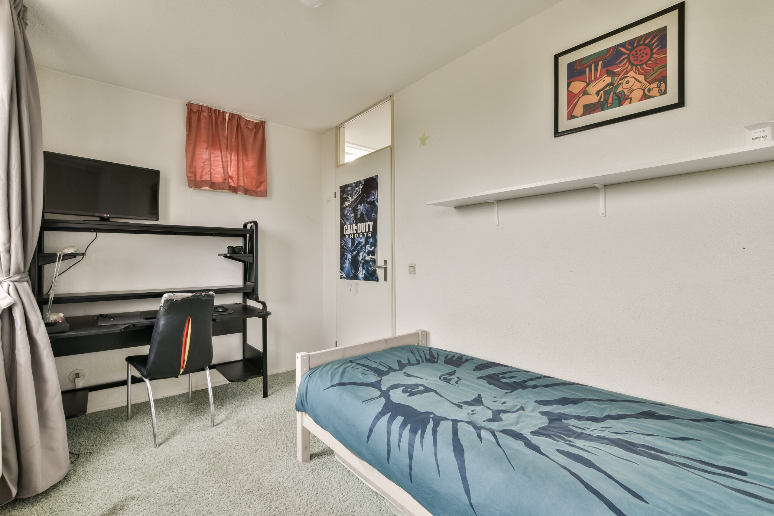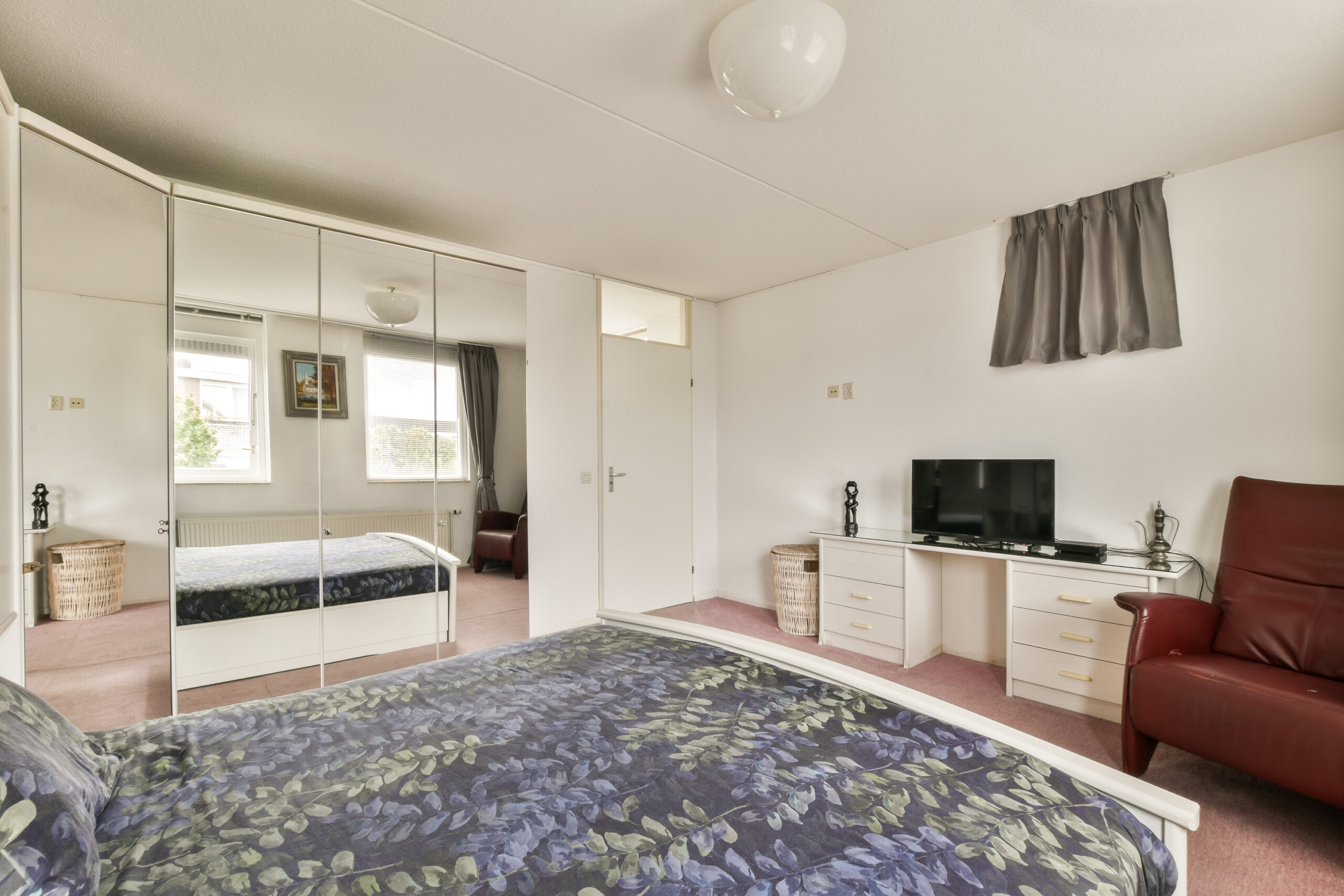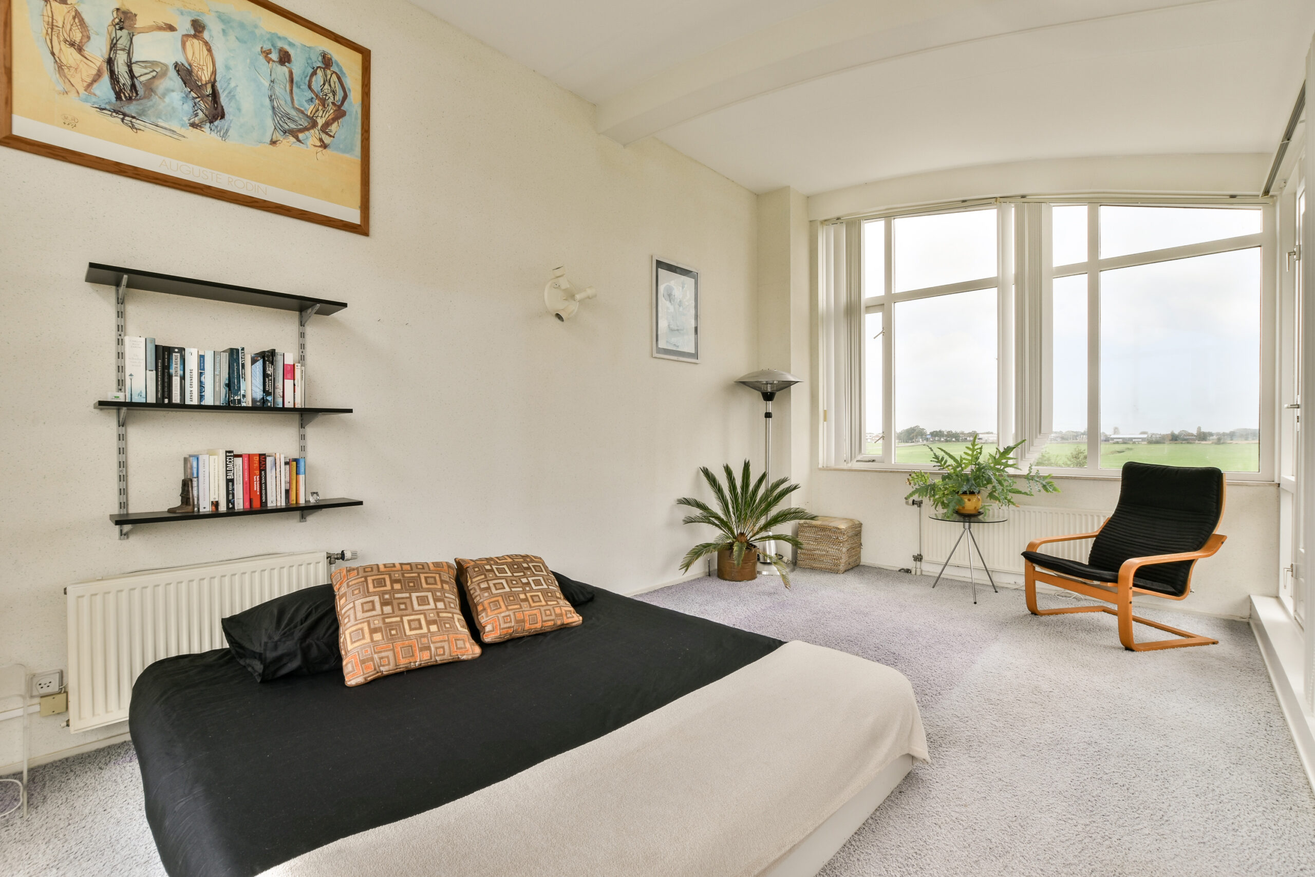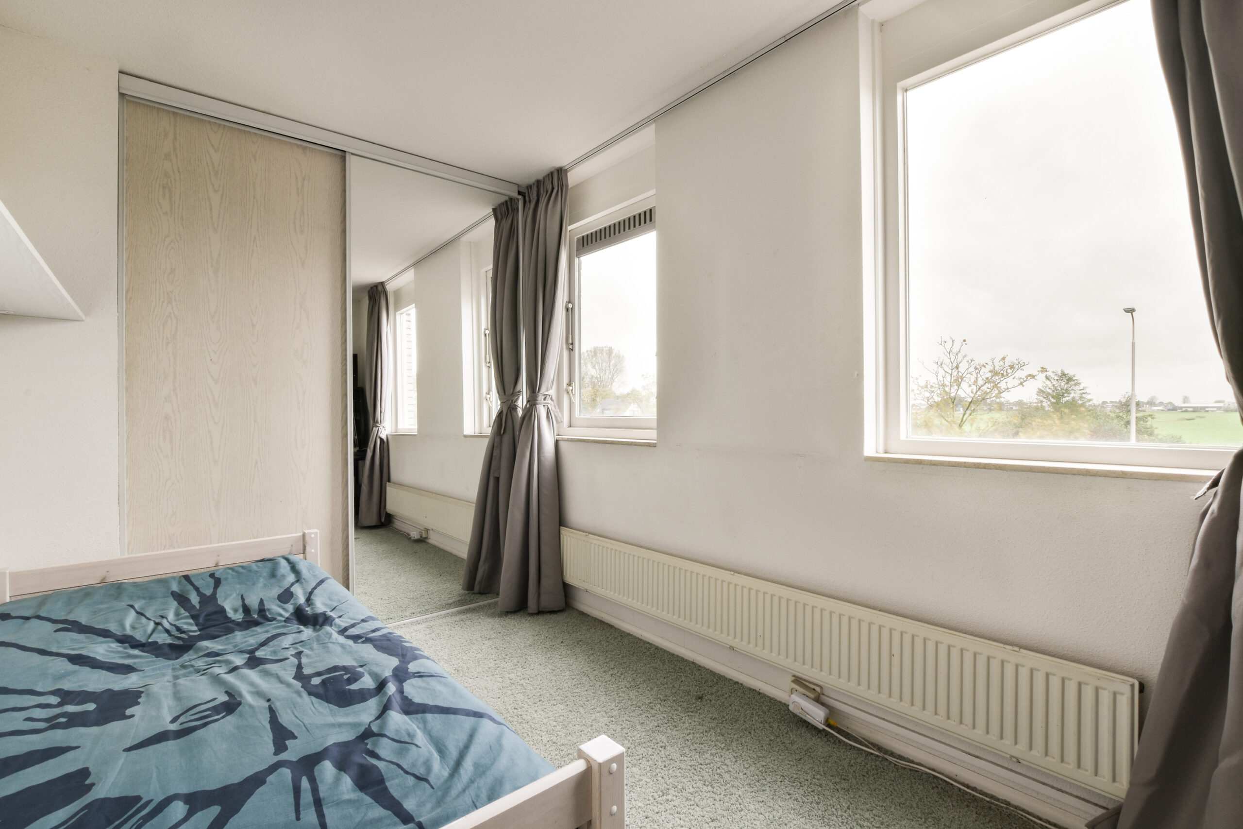 aan de zijkant. Deze slaapkamer heeft bijzonder veel lichtinval omdat er veel raampartijen aanwezig zijn.