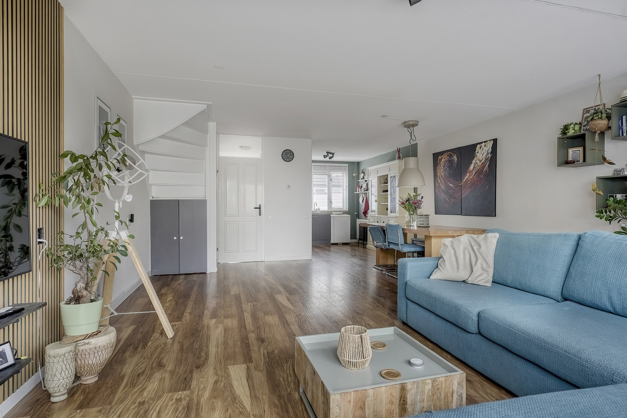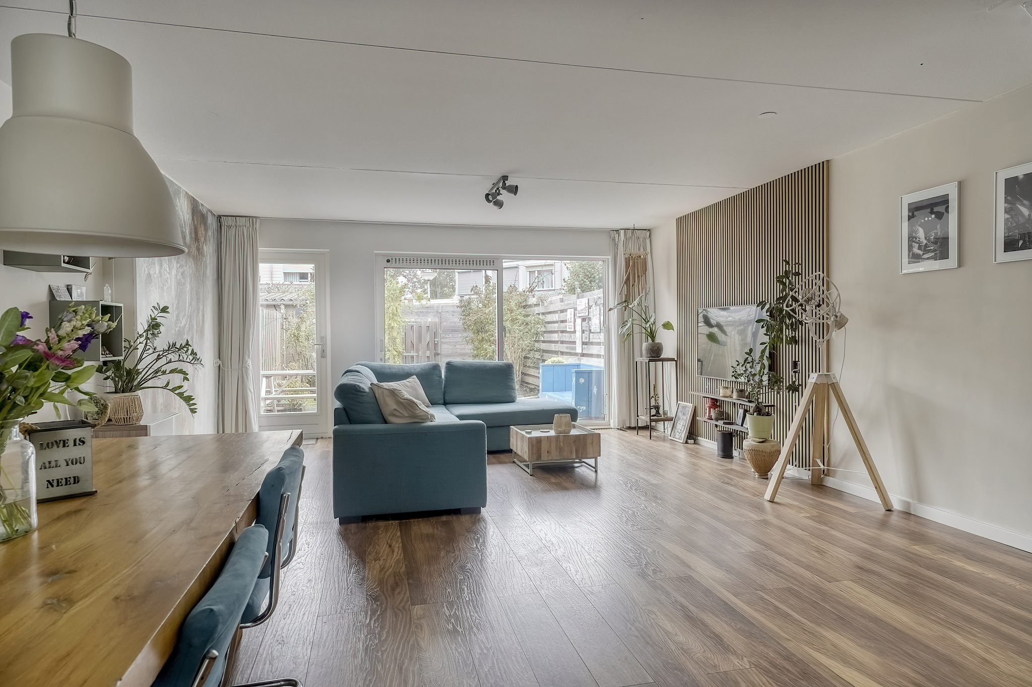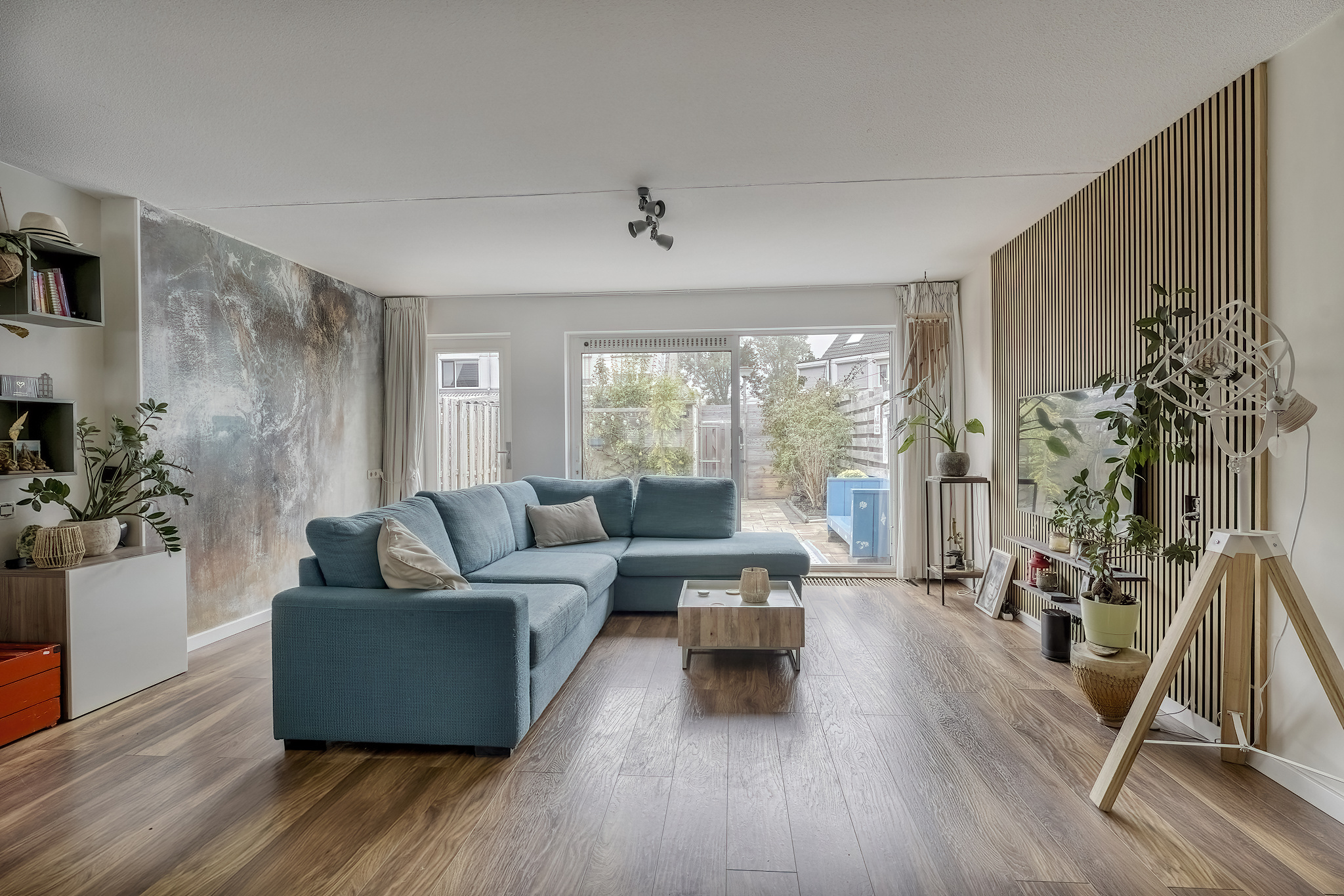 De uitgebouwde woonkamer aan de achterzijde is heerlijk licht dankzij de brede schuifpui en aparte loopdeur naar de tuin. De muurschildering en decoratieve wandpanelen geven de ruimte extra sfeer. De achterpui is voorzien van een zonnescherm,