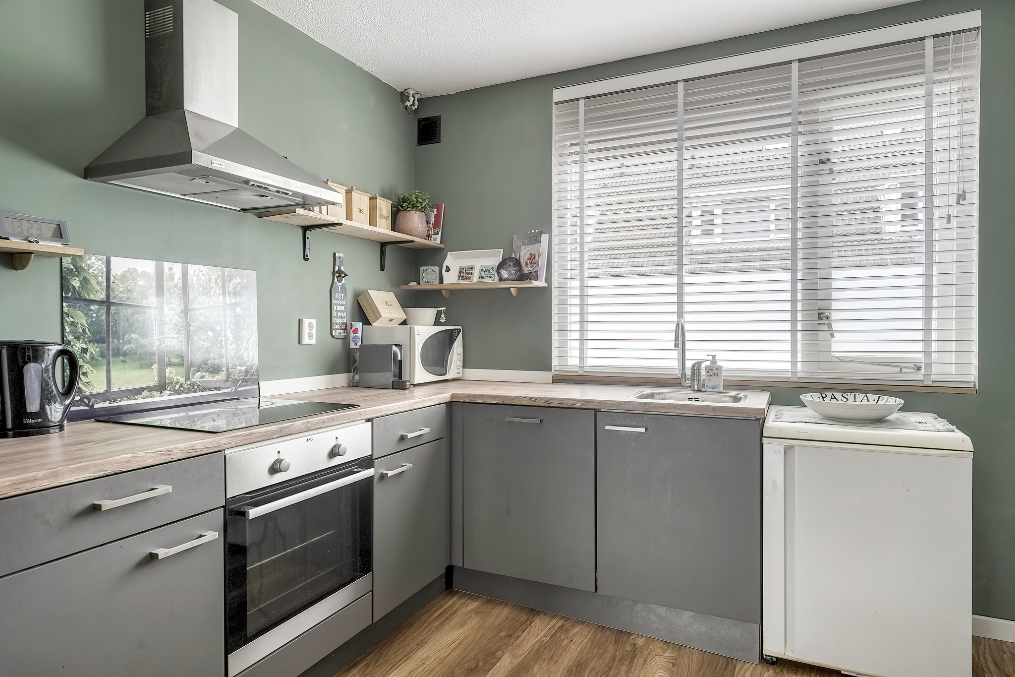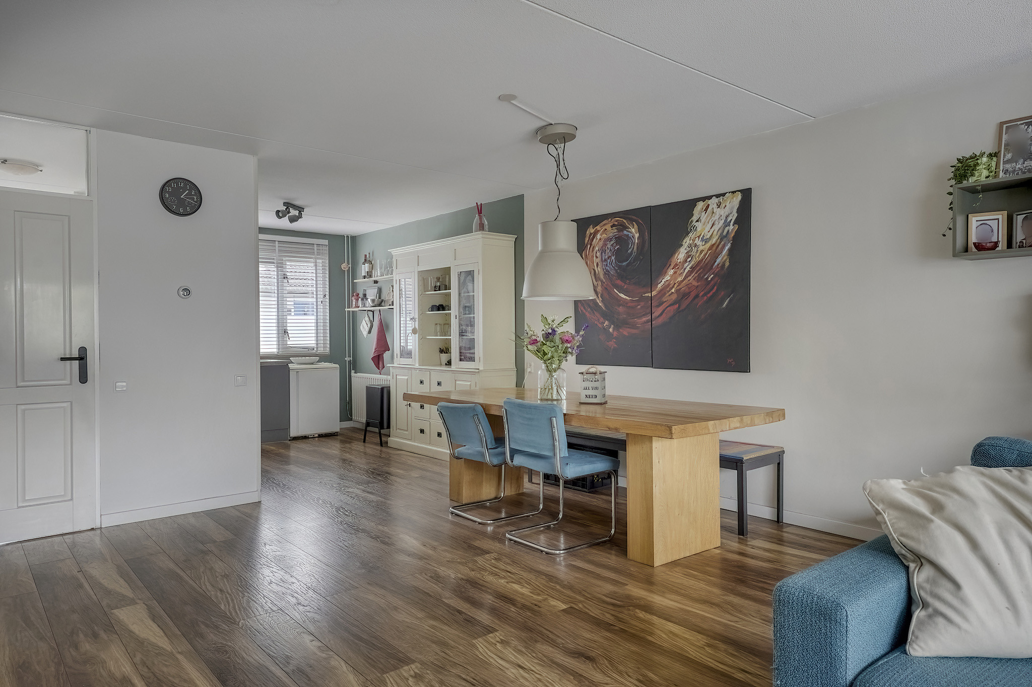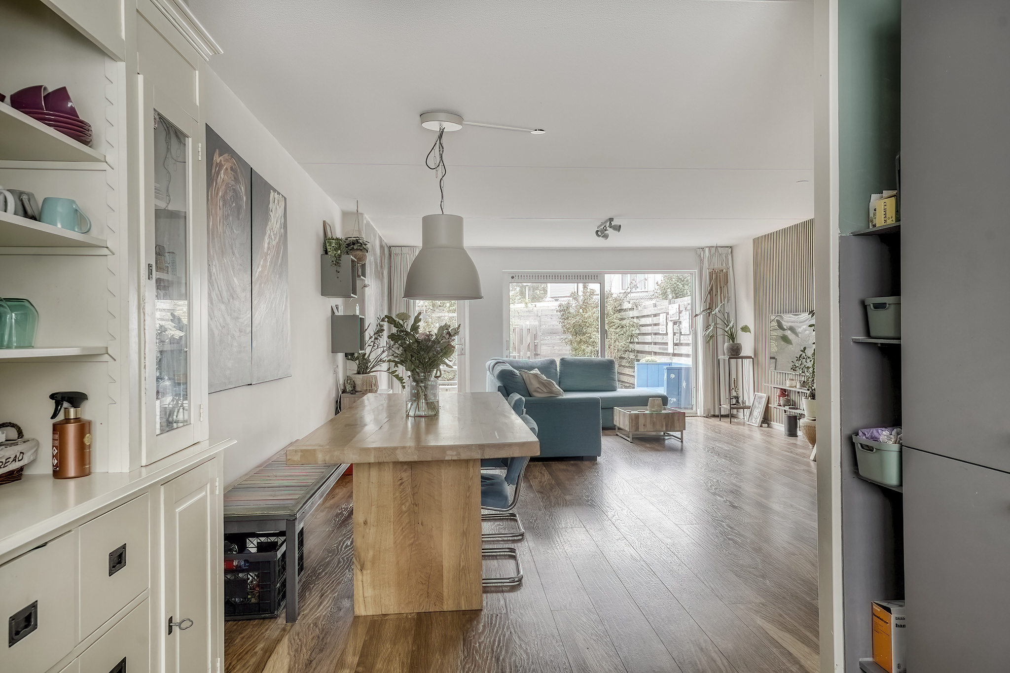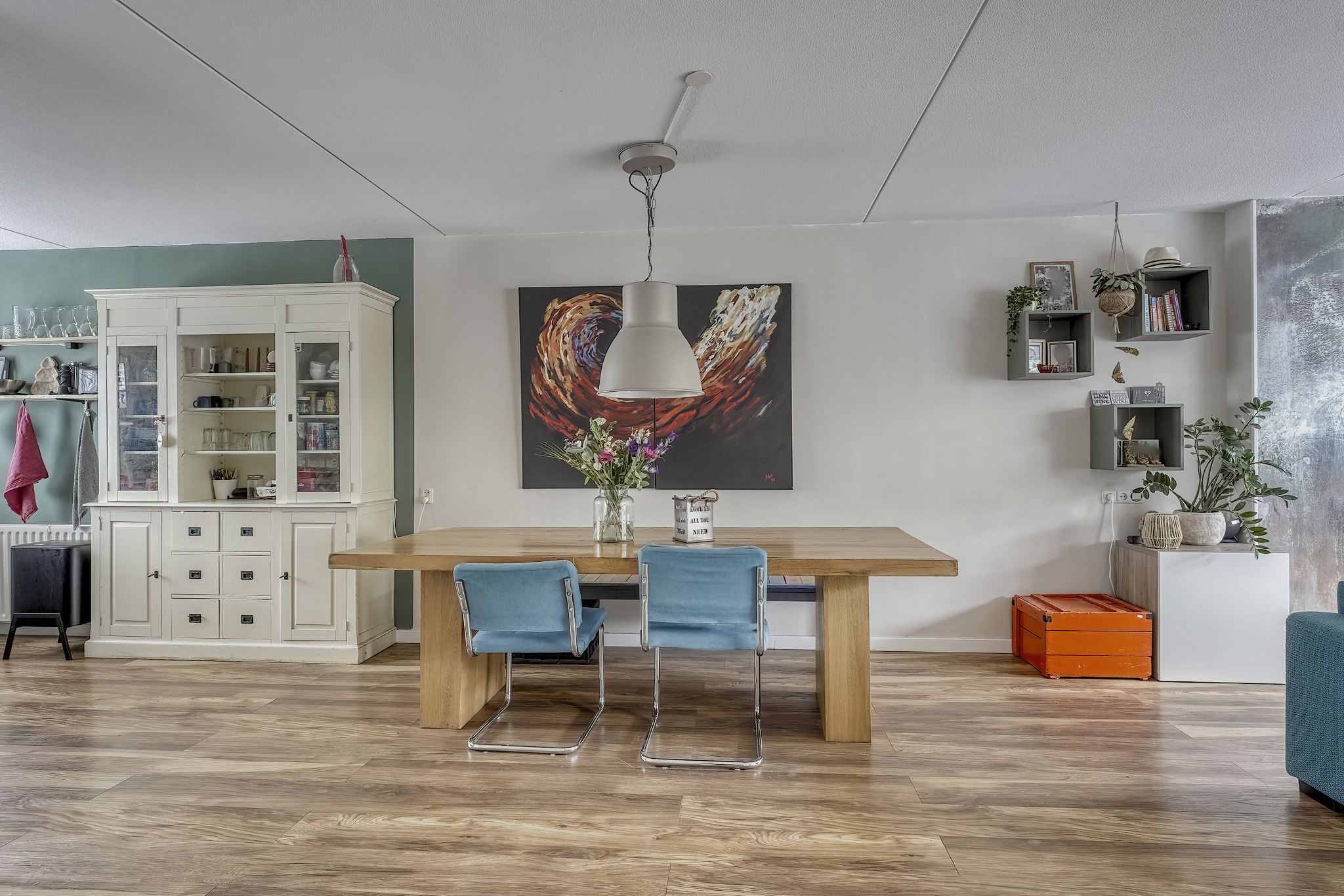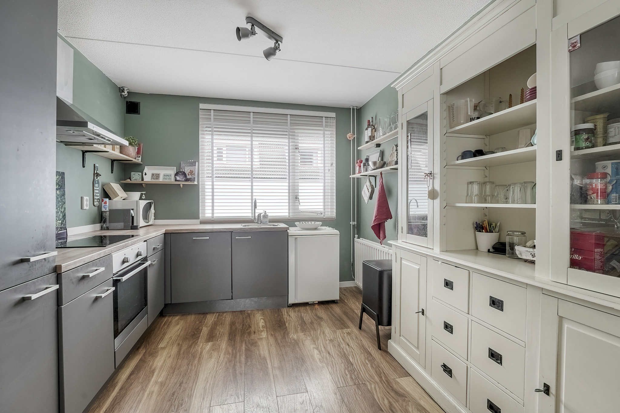 Aan de voorzijde ligt de open keuken, voorzien van diverse inbouwapparatuur zoals een inductiekookplaat, afzuigkap, oven, vaatwasser, koelkast en vriezer. De keuken heeft prettig lichtinval door het grote raam en biedt volop kastruimte. Direct aansluitend is er ruimte voor een gezellige eethoek.