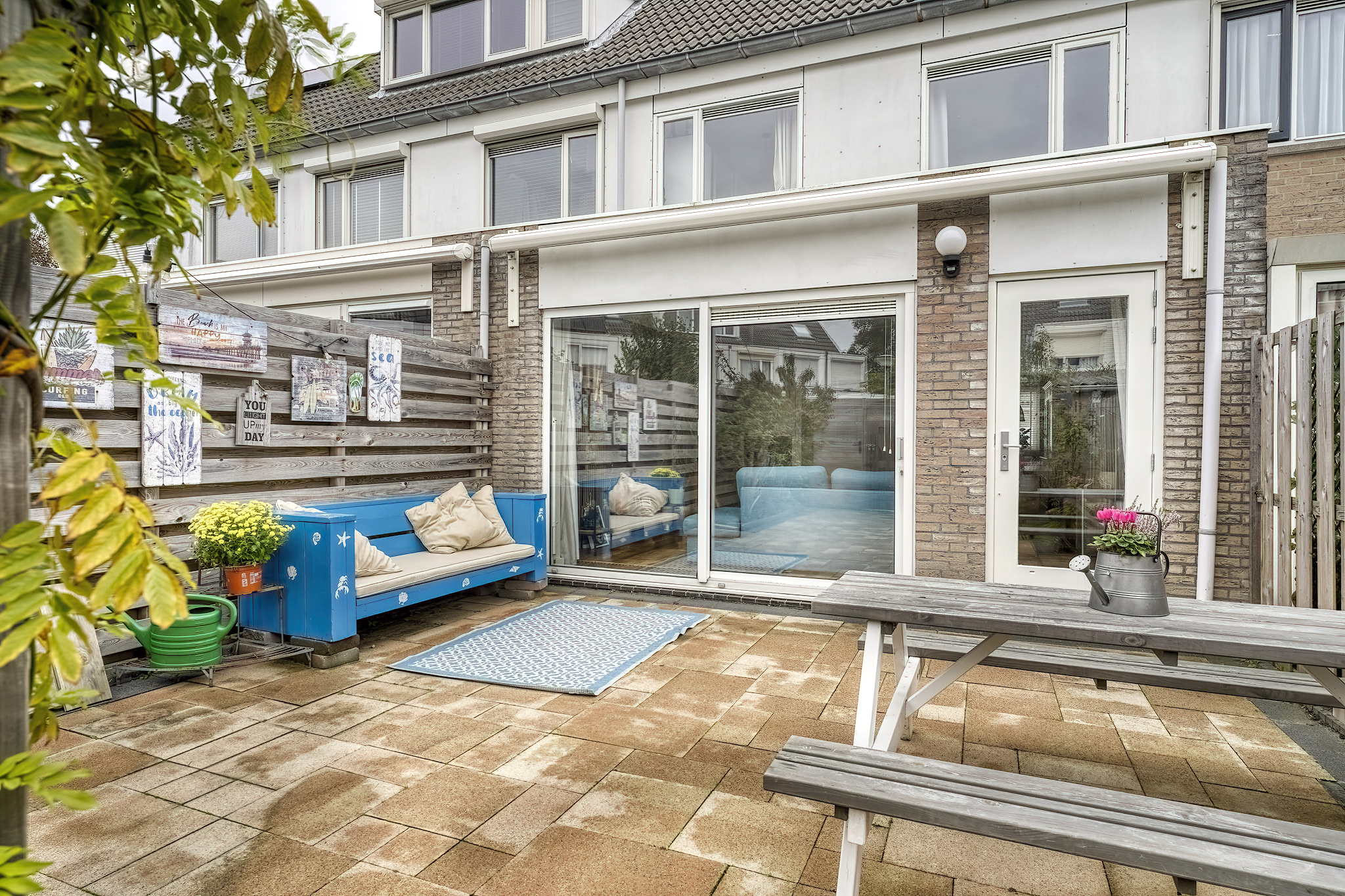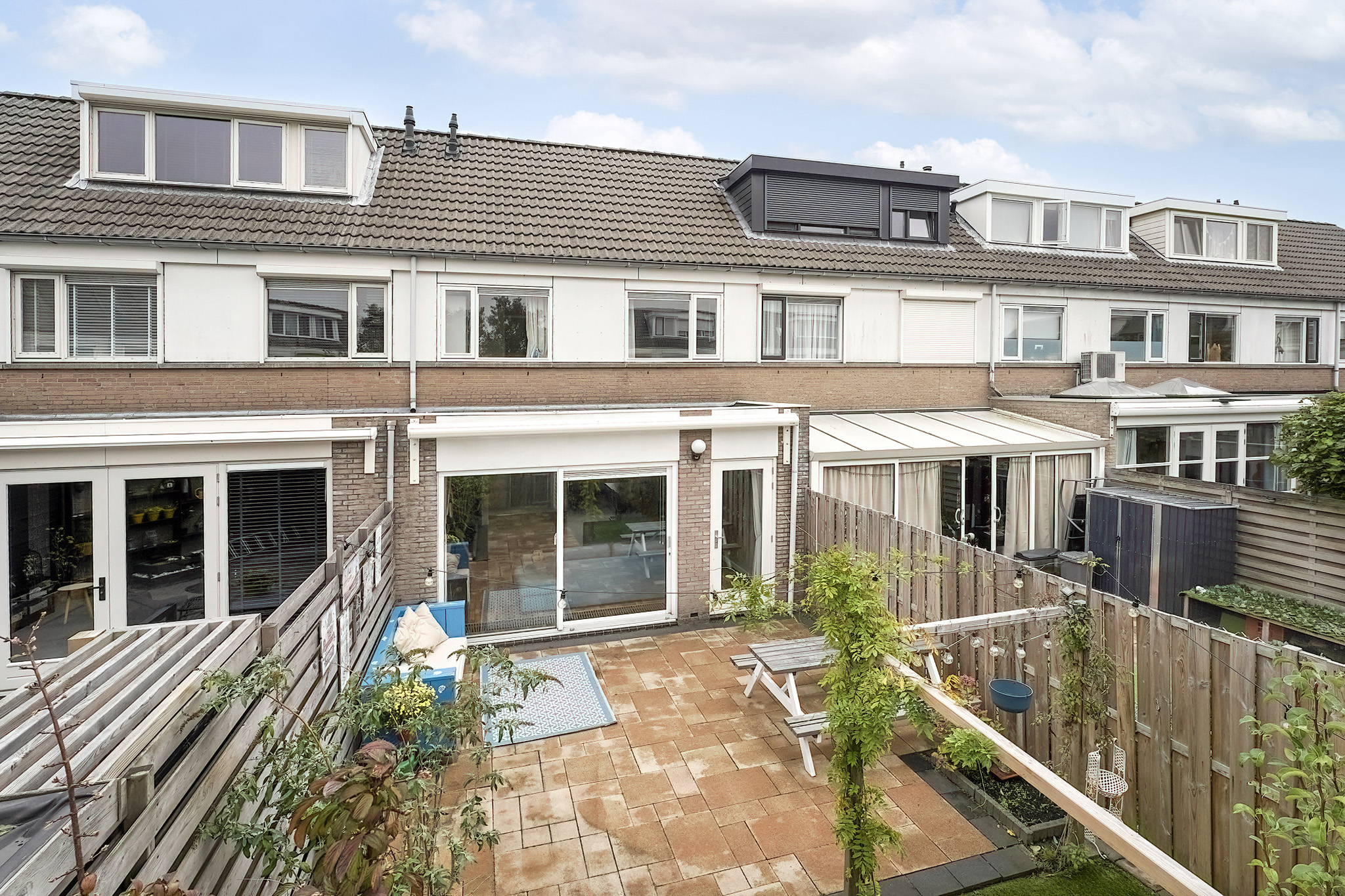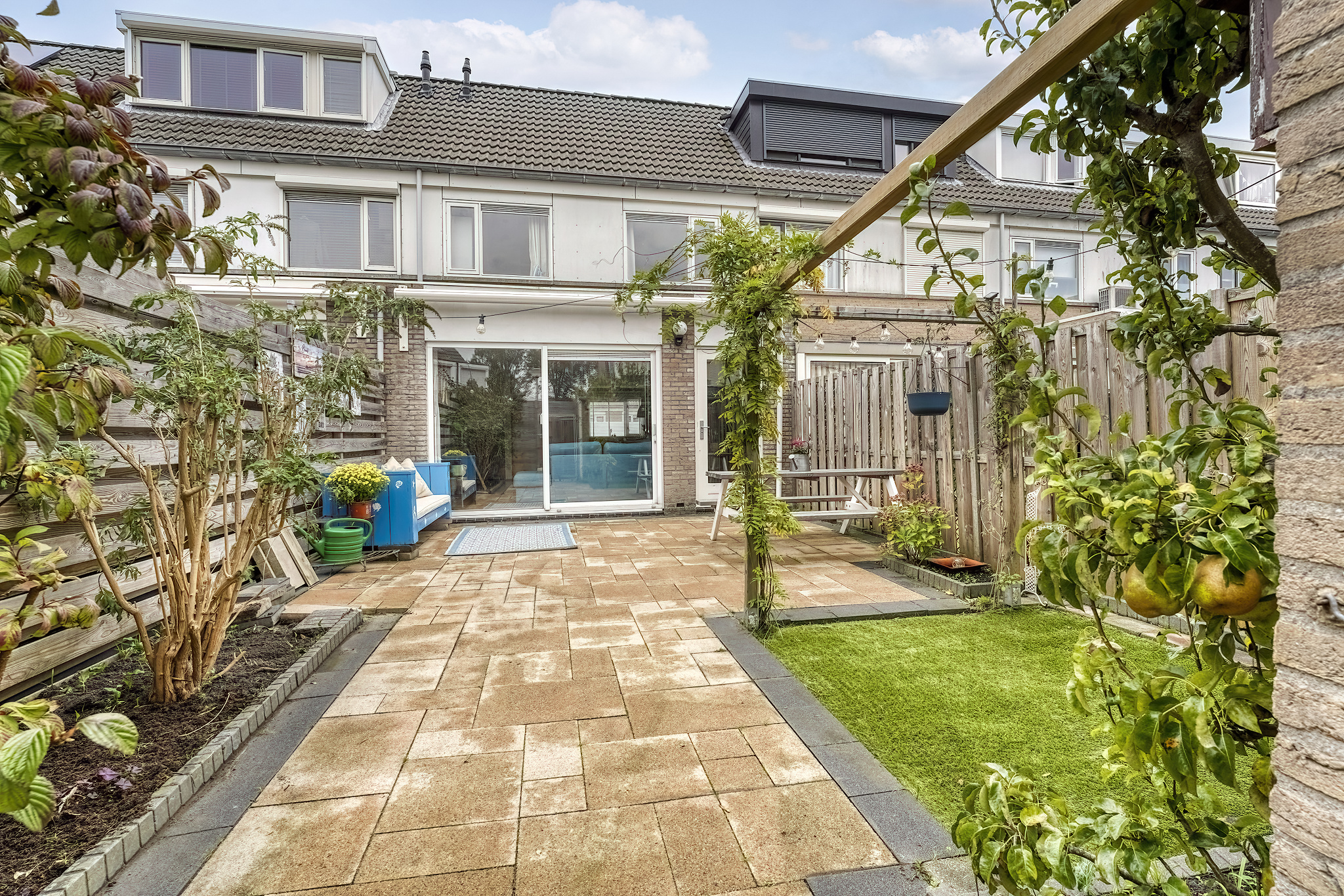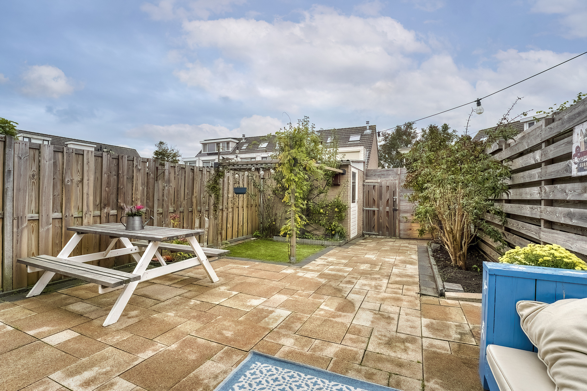 De netjes aangelegde achtertuin ligt op het noordwesten en is verzorgd aangelegd met bestrating, vaste plantenborders en veel groen. Achterin de tuin staat een praktische berging, ideaal voor fietsen en tuingereedschap, en er is een handige achterom aanwezig.