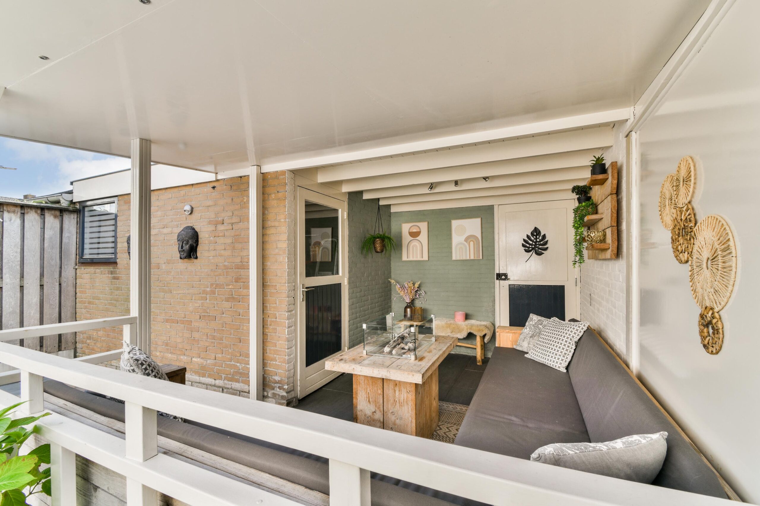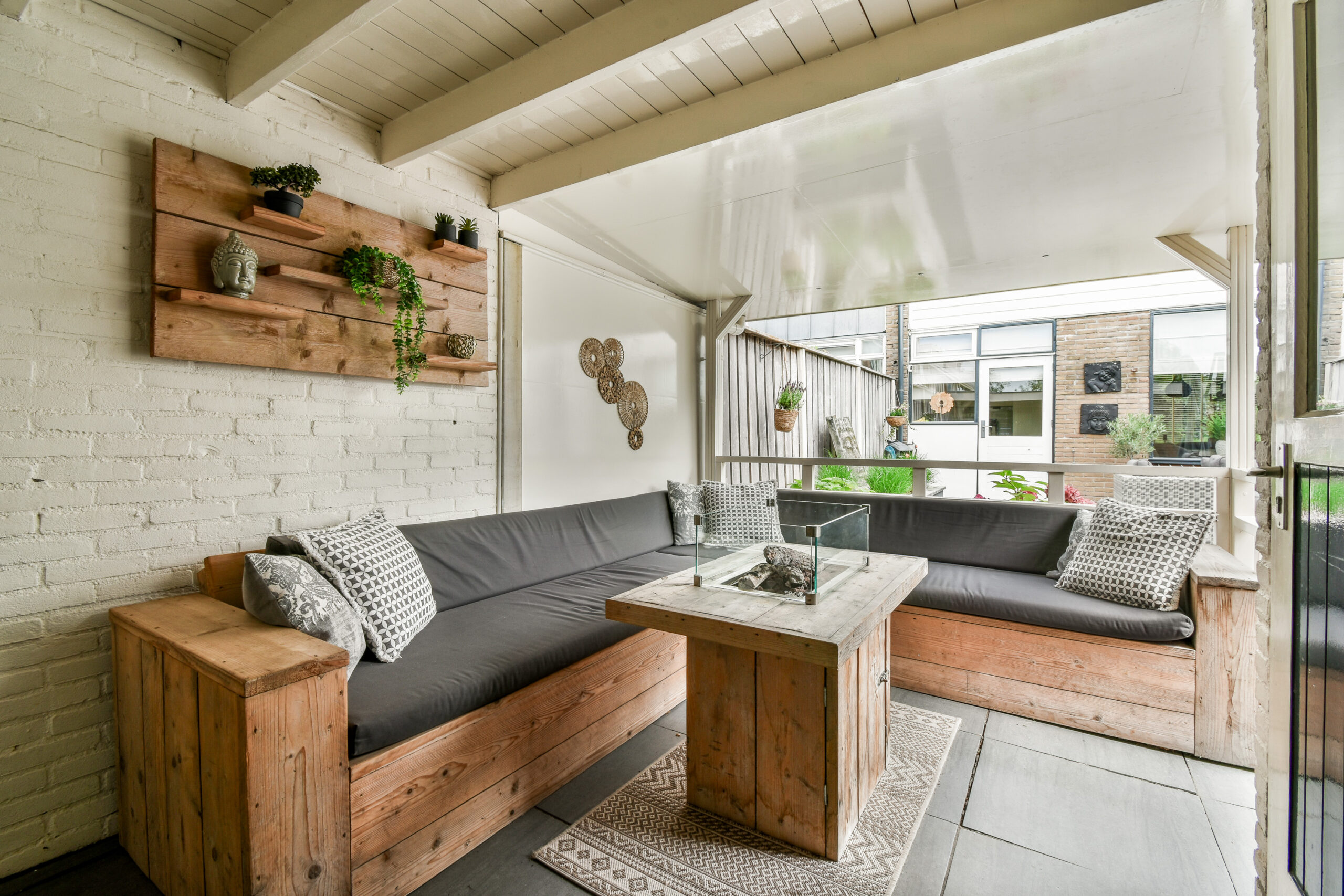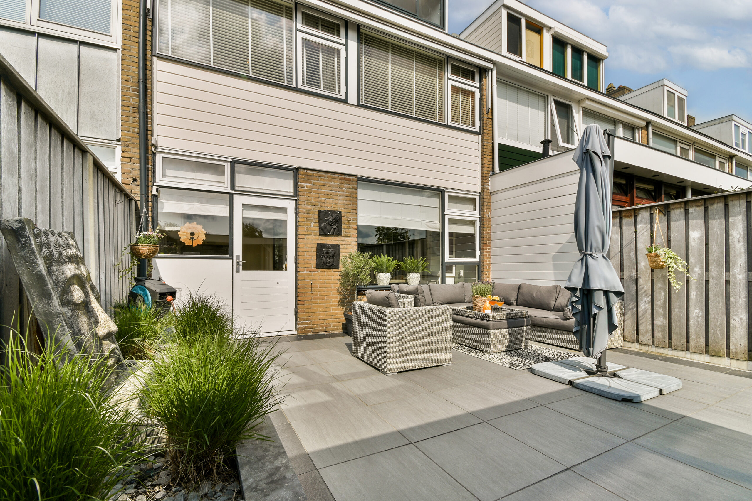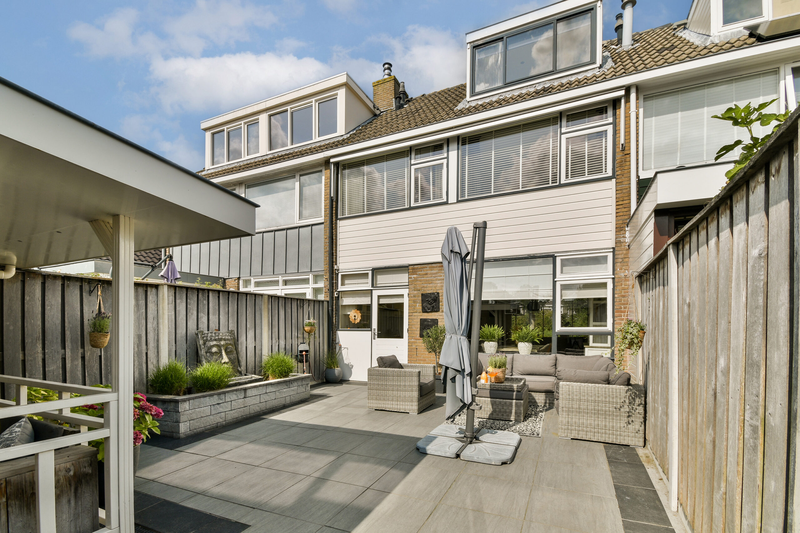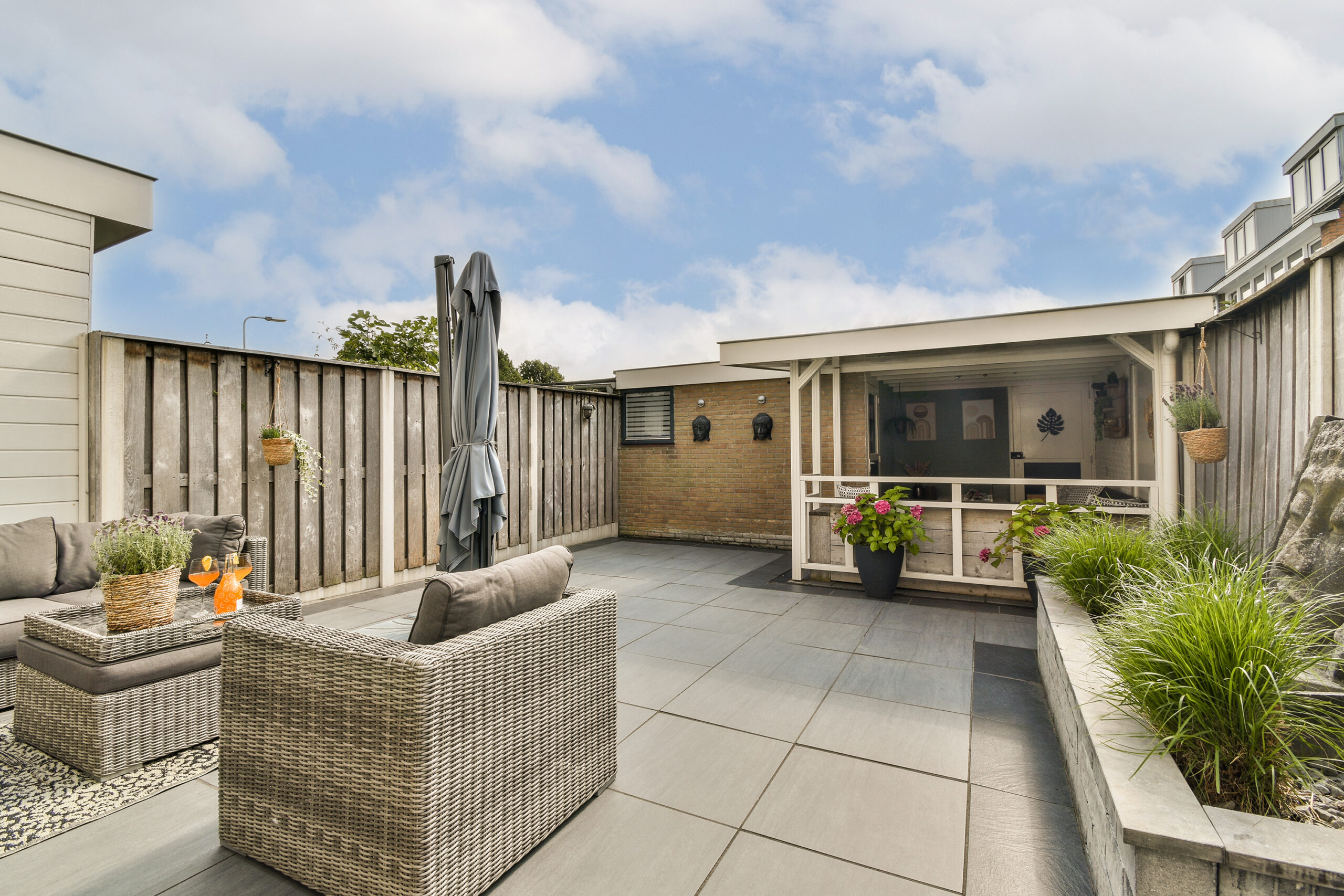 Zeer fijne achtertuin om optimaal van het buitenleven te profiteren. Een sfeervolle veranda welke achter in de tuin is geplaatst. Dit is de ideale plek om te genieten met vrienden en familie, deze tuin biedt altijd de ideale plek.