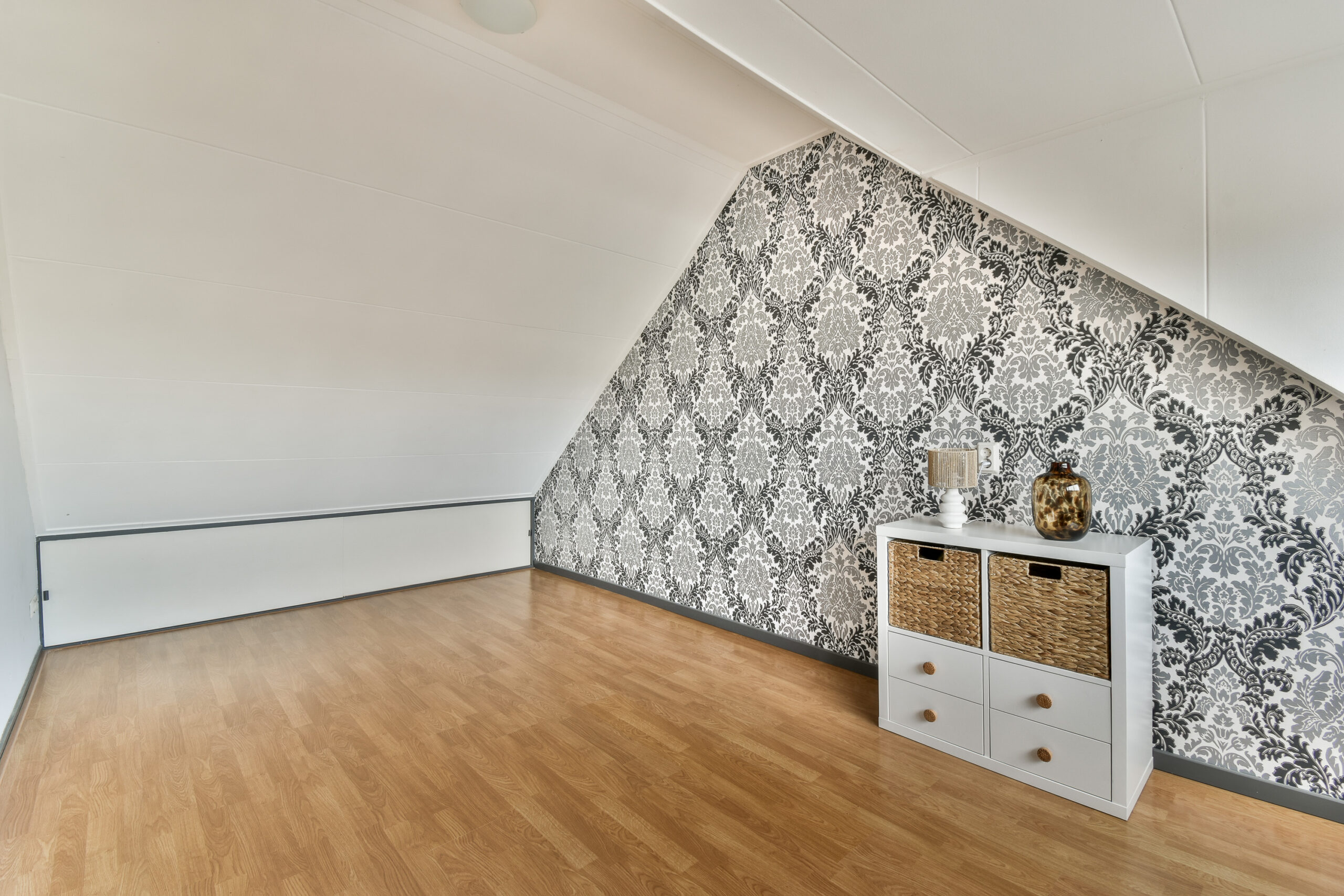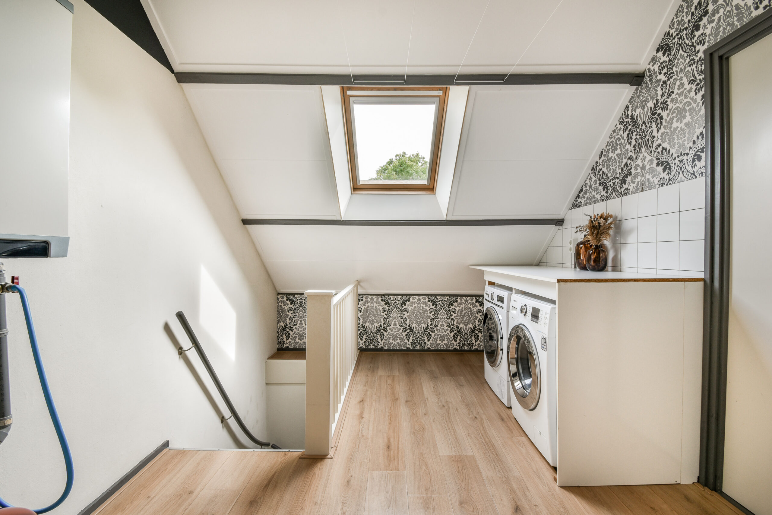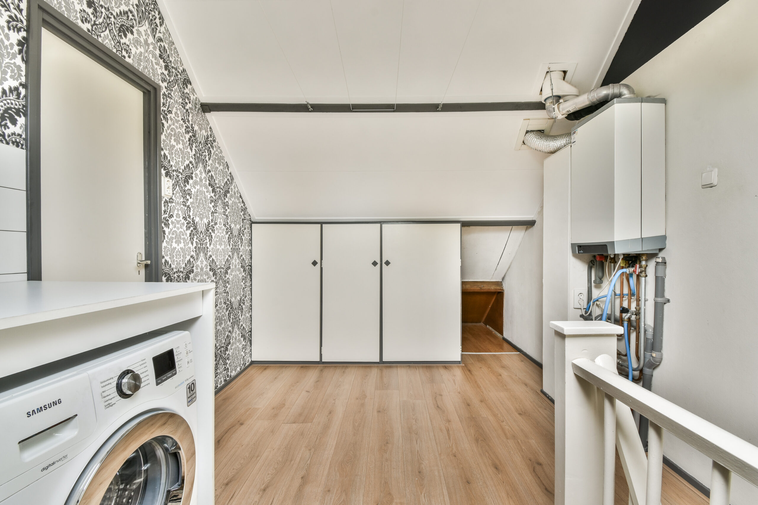 2e verdieping: voorzolder met opstelling voor de wasmachine en droger. Achter de knieschotten is veel bergruimte aanwezig. 4e ruime zolderslaapkamer met dakkapel aan de achterzijde.