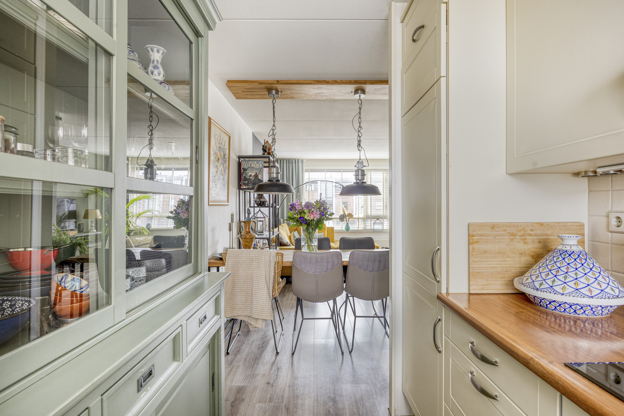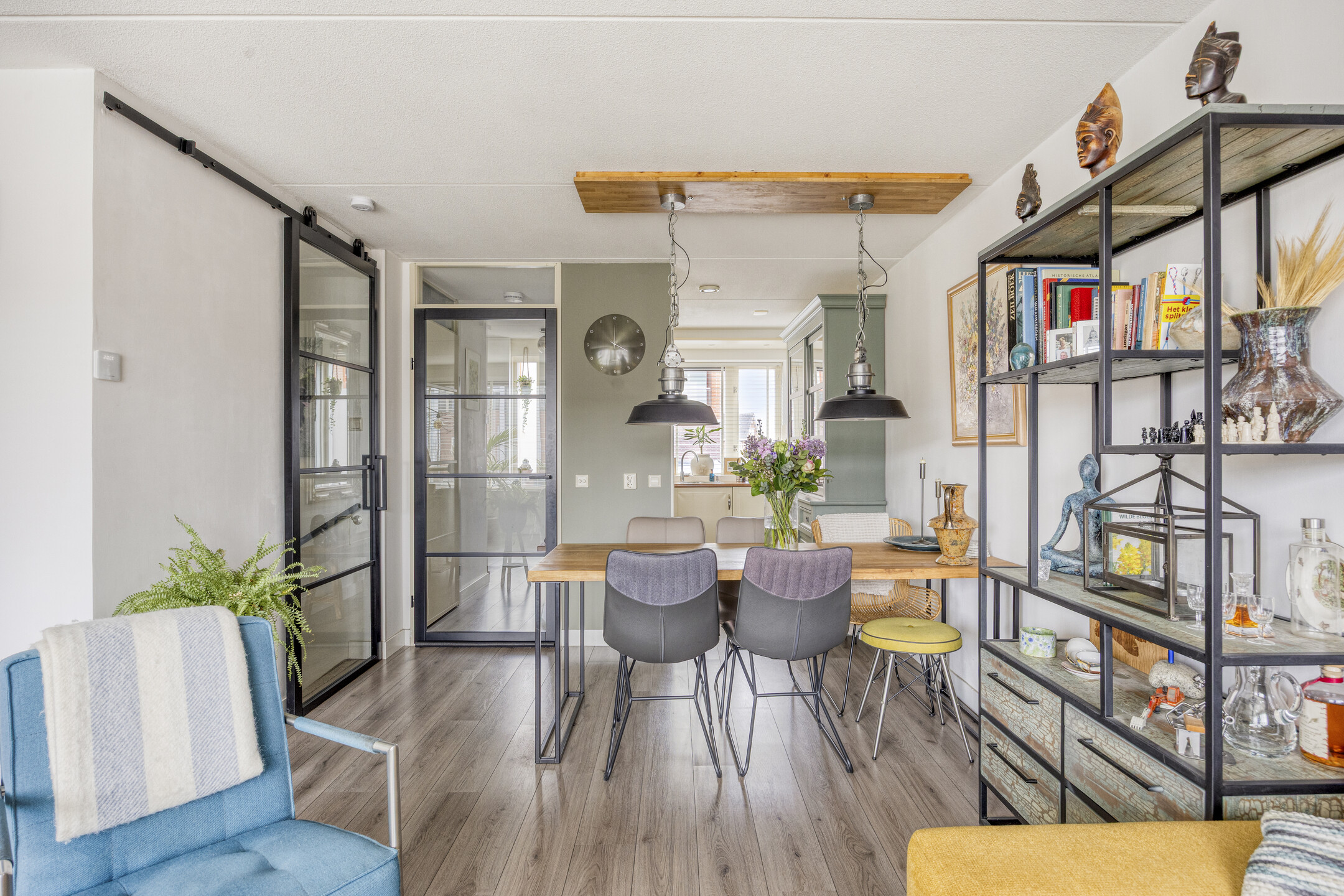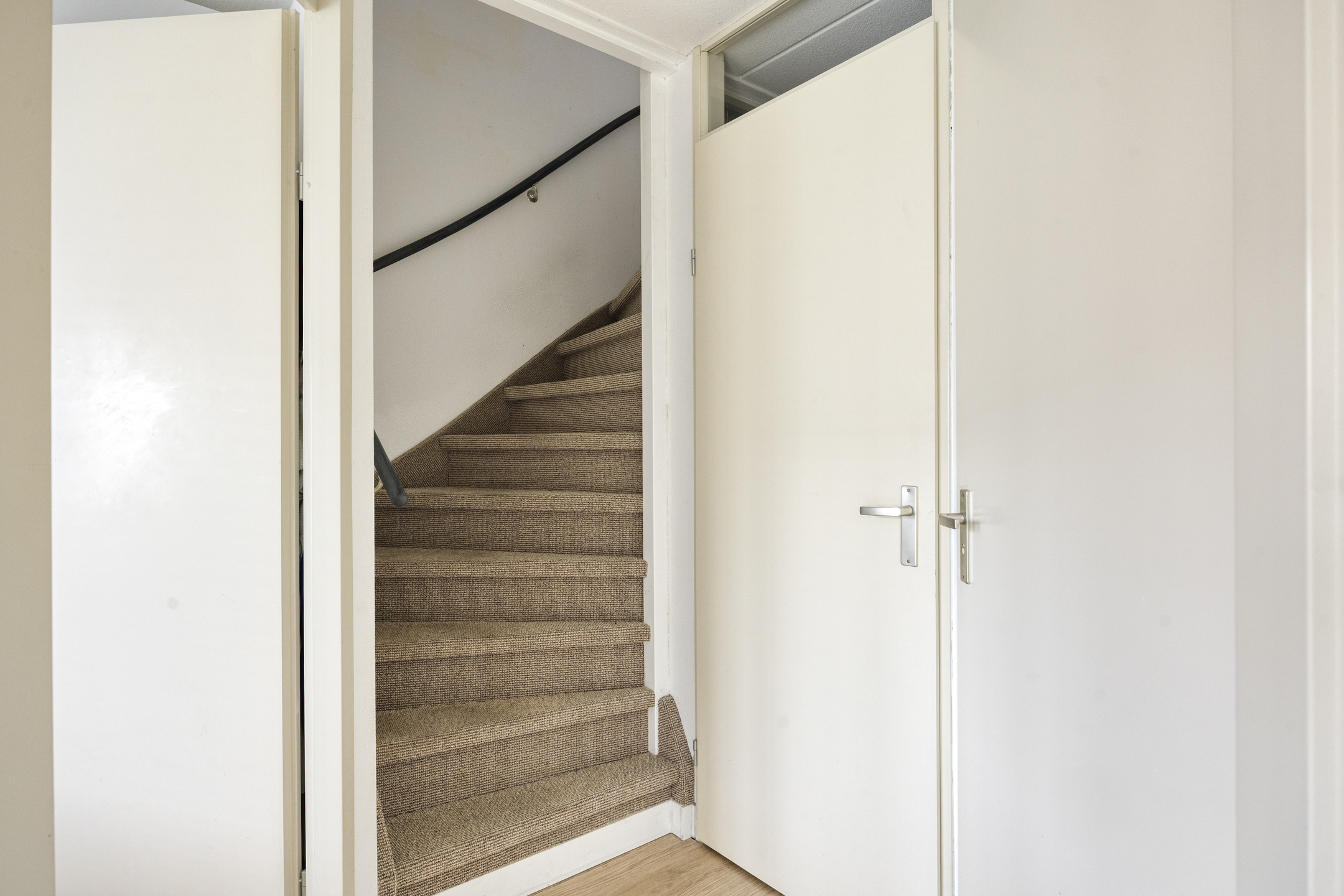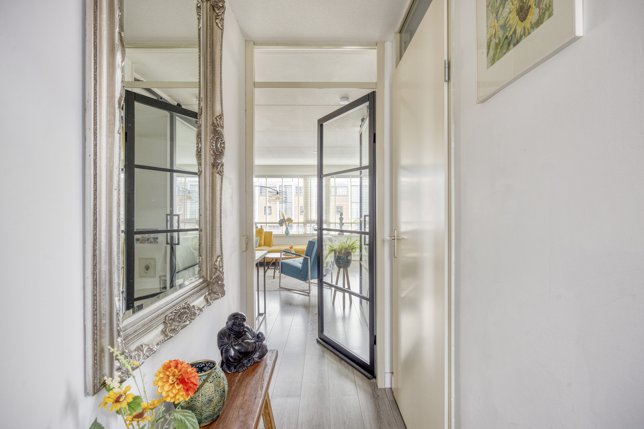 Via de trap, welke is afgesloten door een glazen deur met sfeervol profiel, bereik je het souterrain. Hier vind je twee ruime slaapkamers, beide met directe toegang tot de tuin. ’s Ochtends de deur openzetten, frisse lucht naar binnen, blote voeten op het terras.