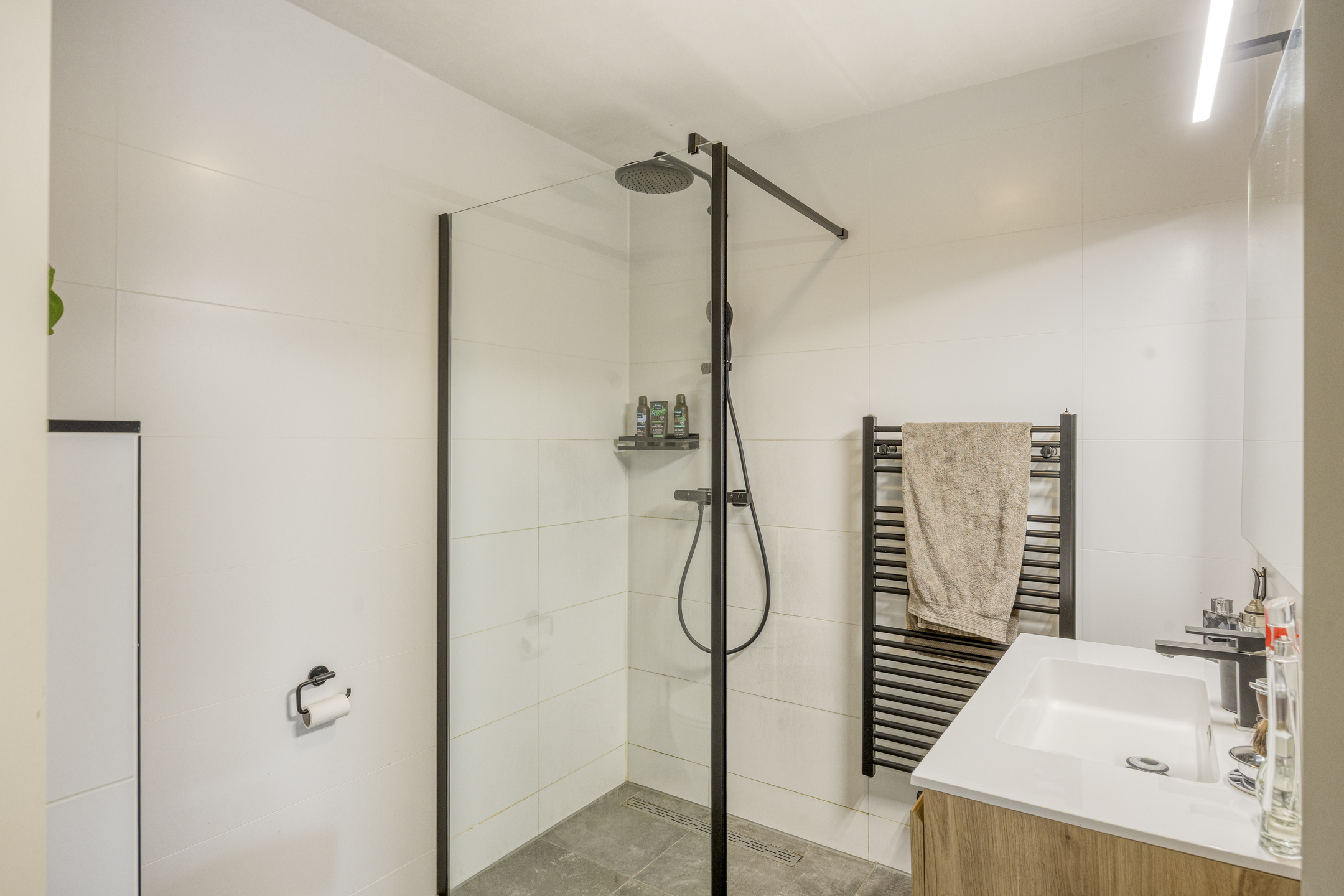 De recent vernieuwde badkamer (2021) is strak en comfortabel: een royale inloopdouche met regendouche, modern wastafelmeubel en tweede toilet. Alles fris, licht en tot in de puntjes verzorgd.