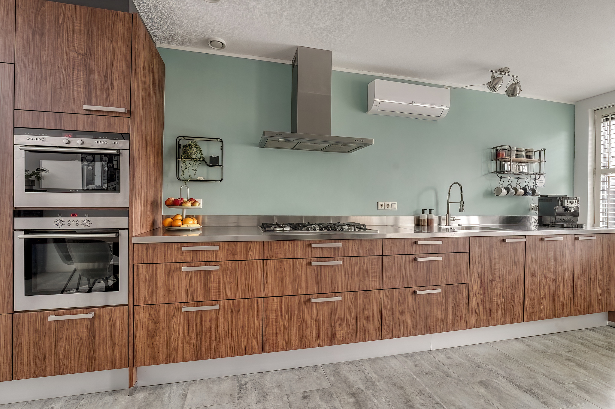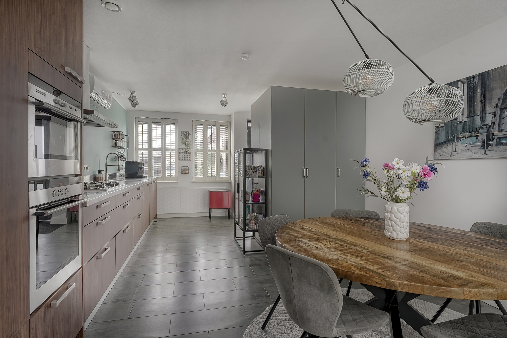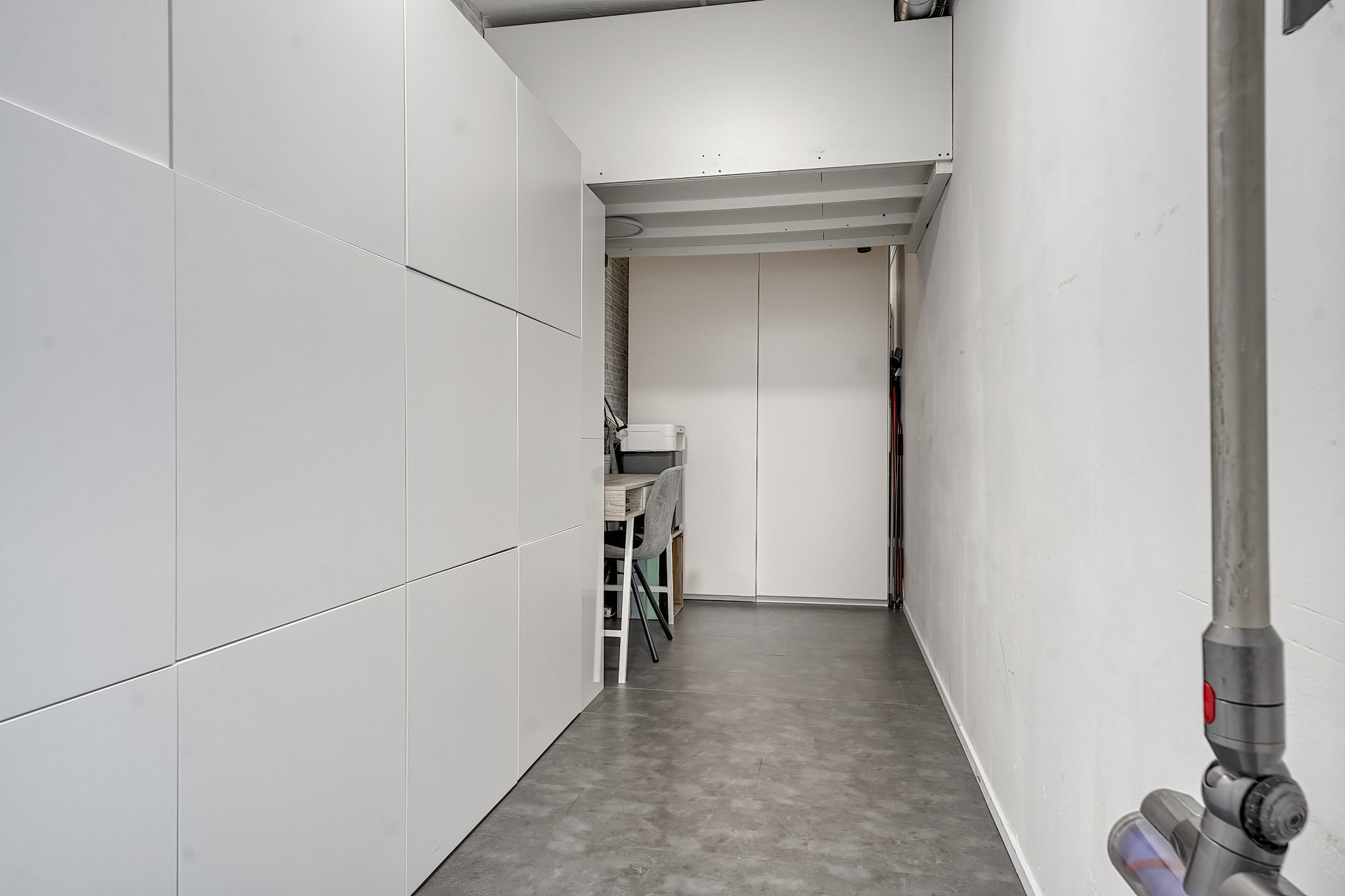 Achter de lange keukenwand bevindt zich de inpandige berging, met veel kastruimte en de meterkast.