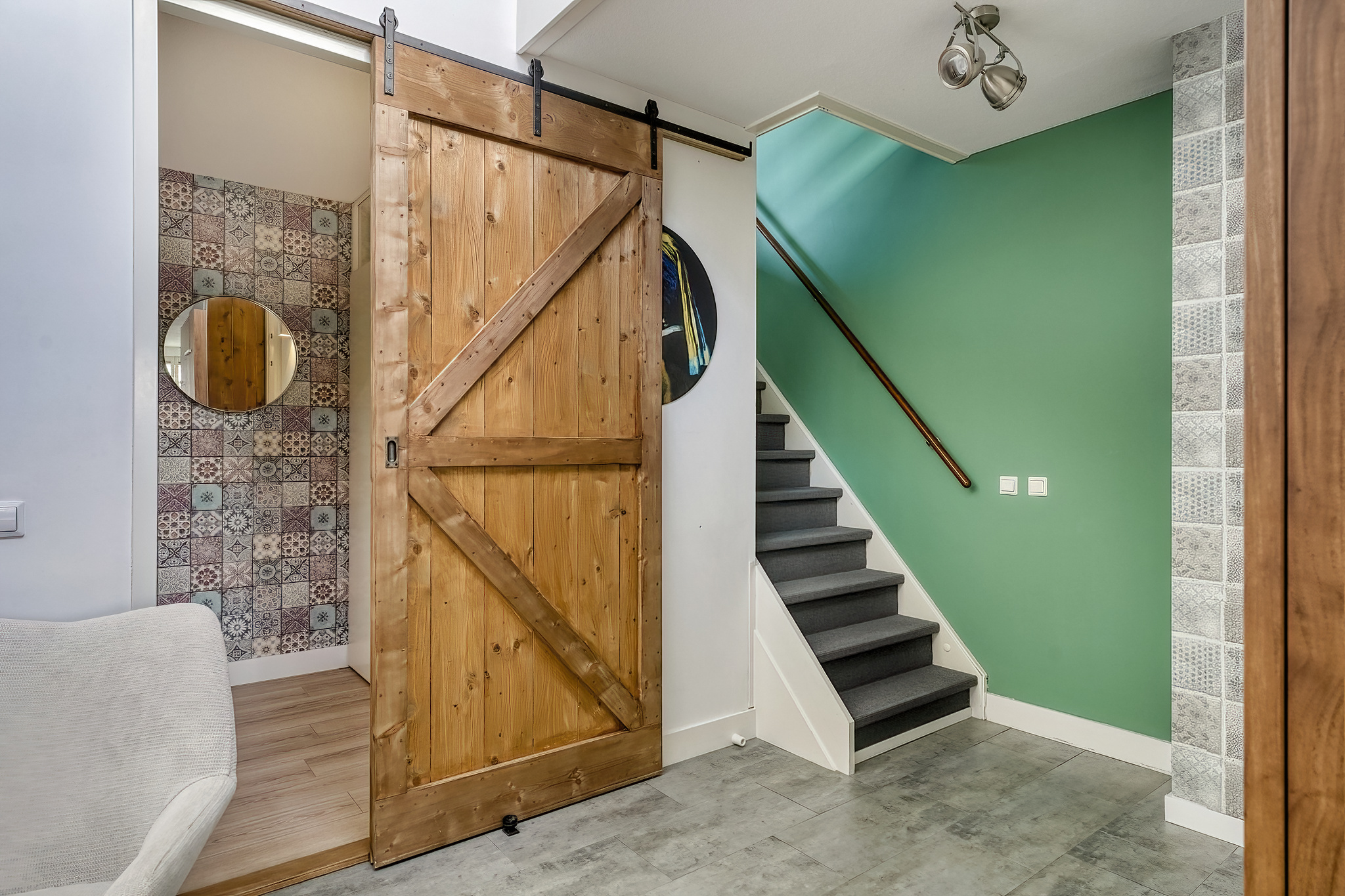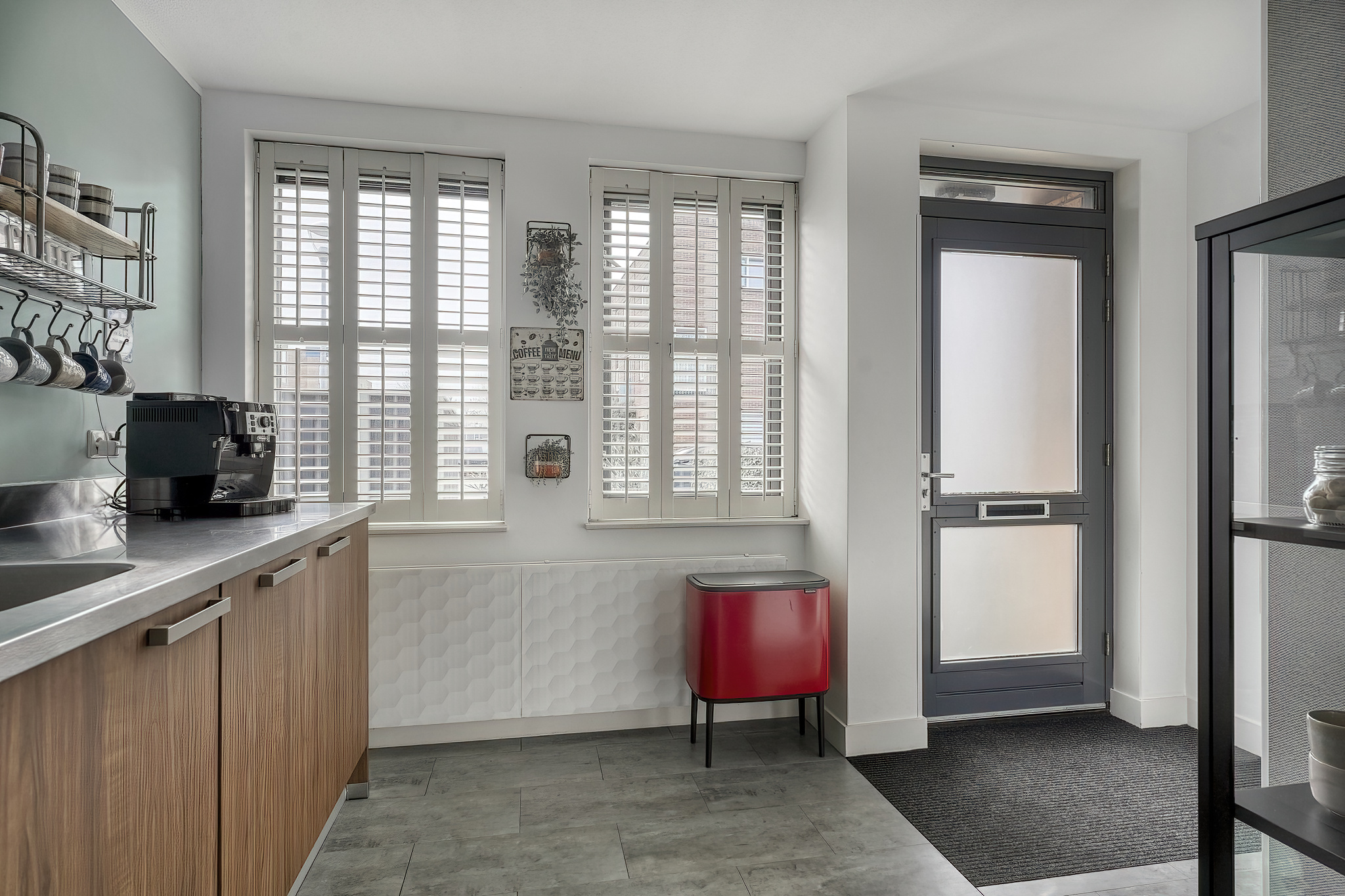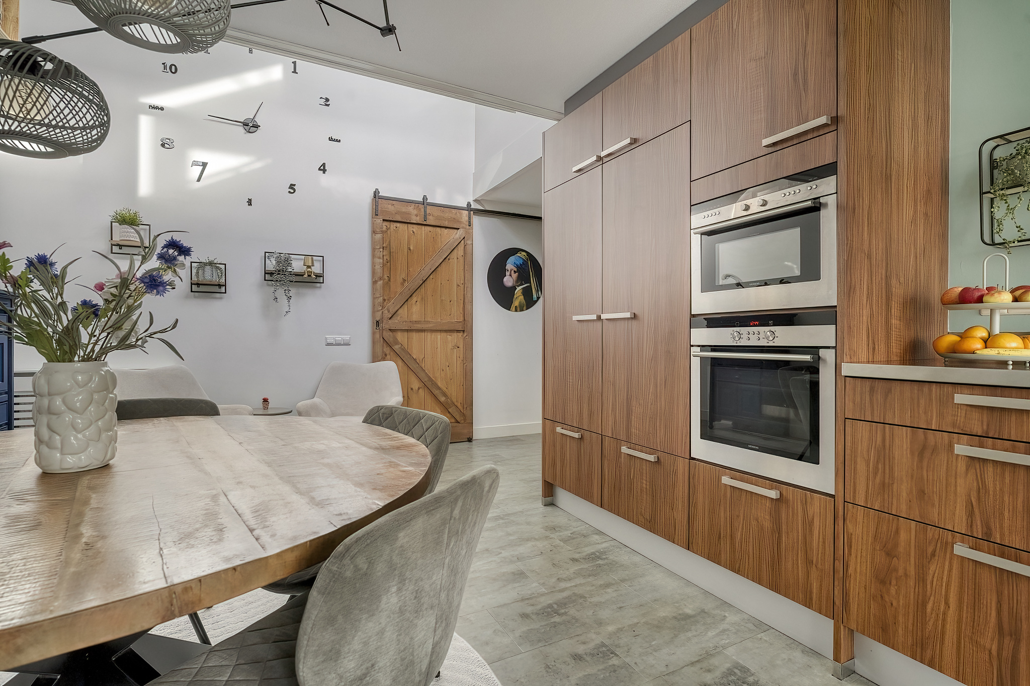 Achter de lange keukenwand bevindt zich de inpandige berging, met veel kastruimte en de meterkast.