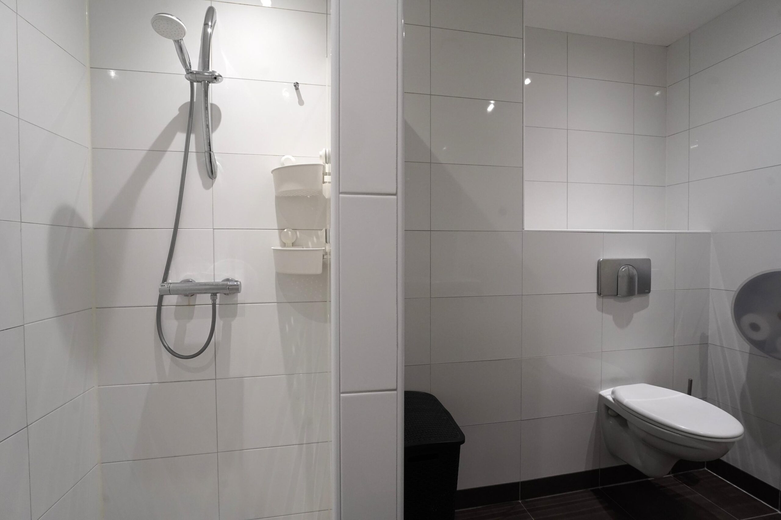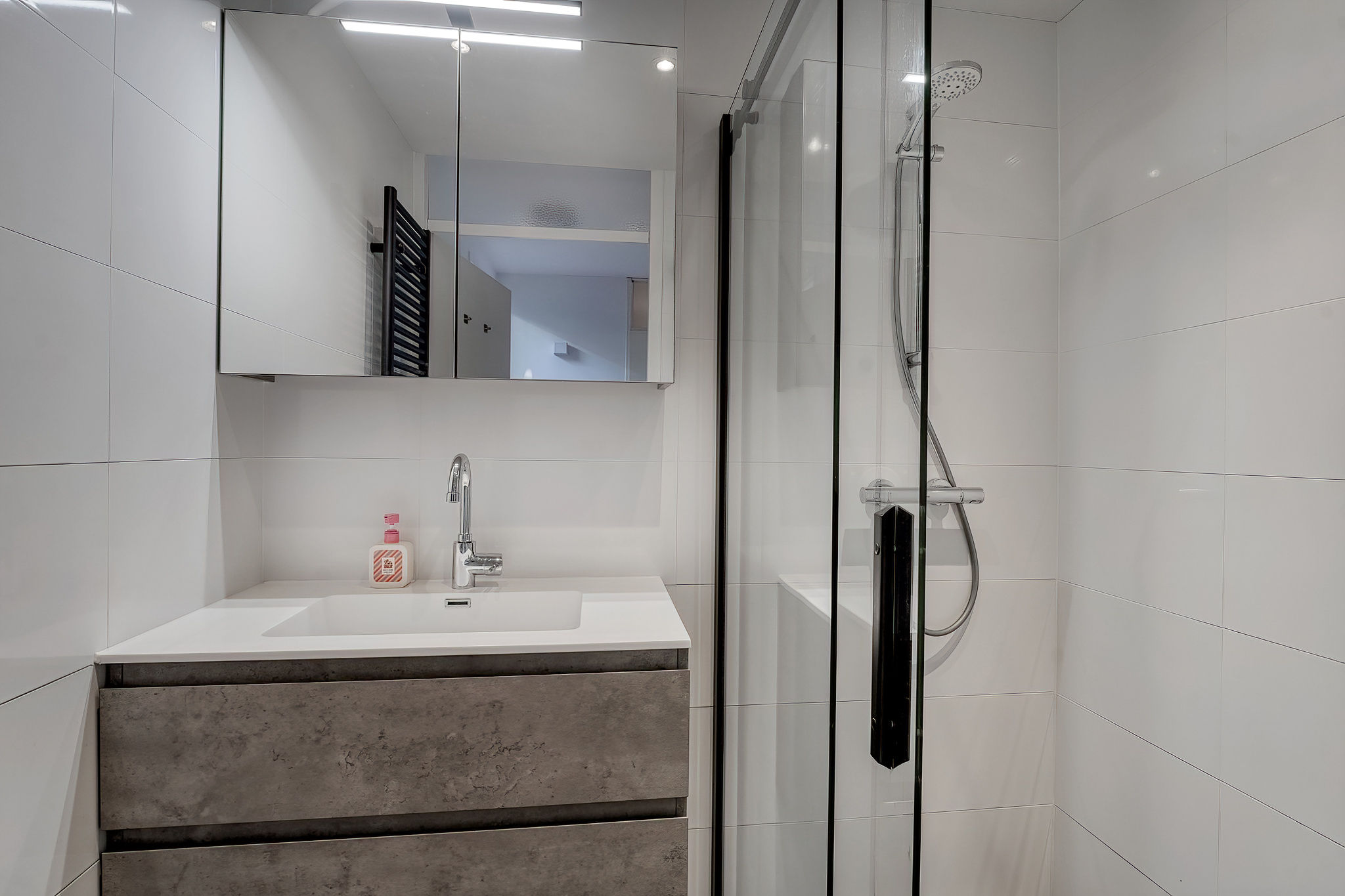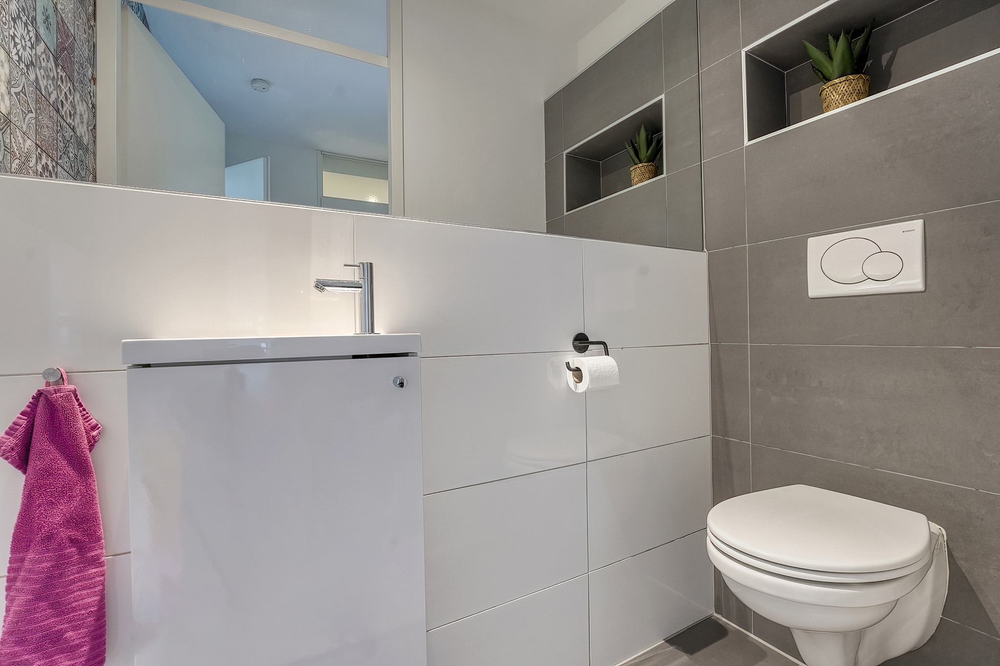 Aan de achterzijde ligt de derde ruime slaapkamer met vaste kastenwand. De tweede badkamer is compleet uitgerust met een inloopdouche, toilet en dubbele wastafel met meubel.