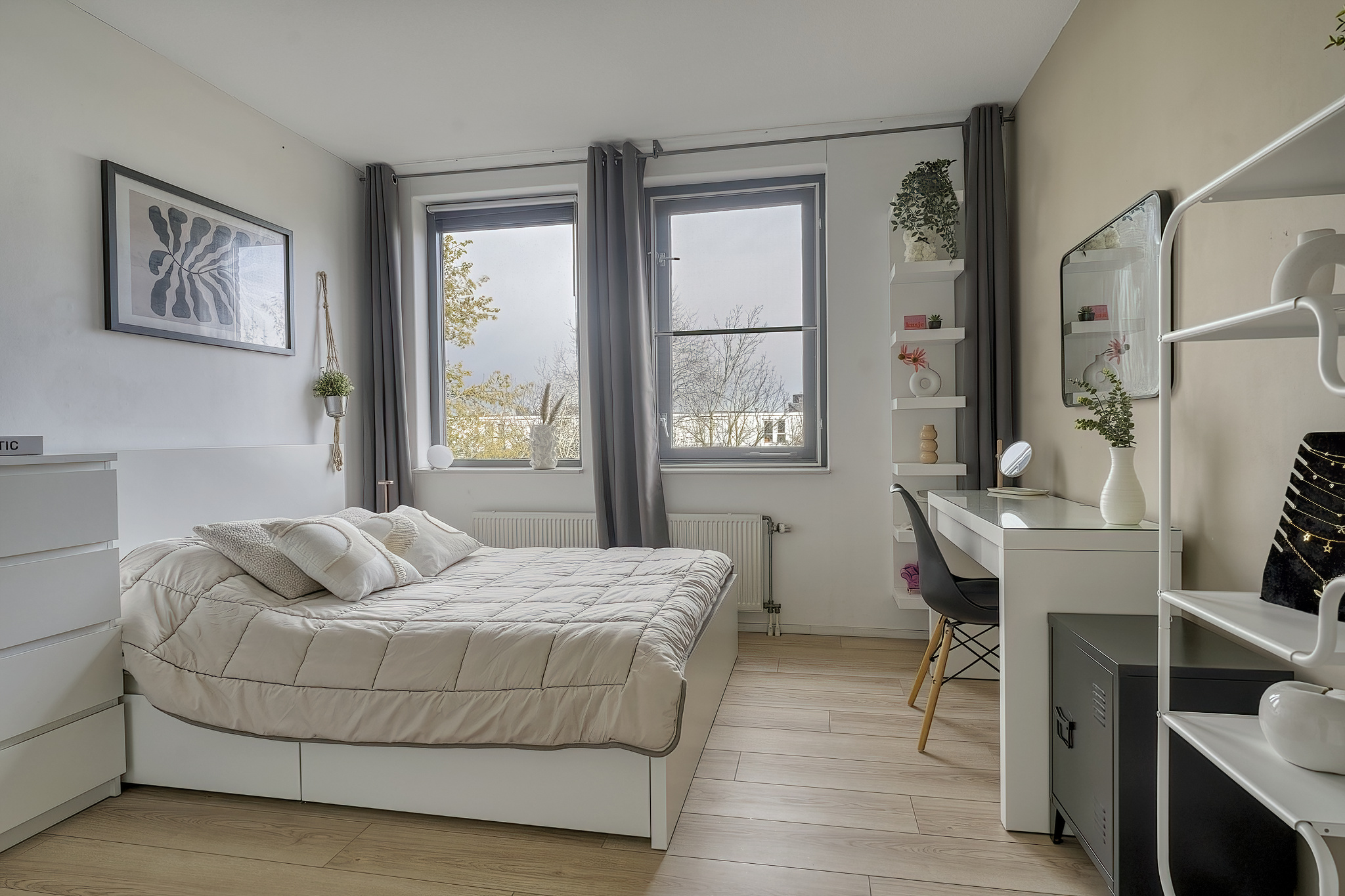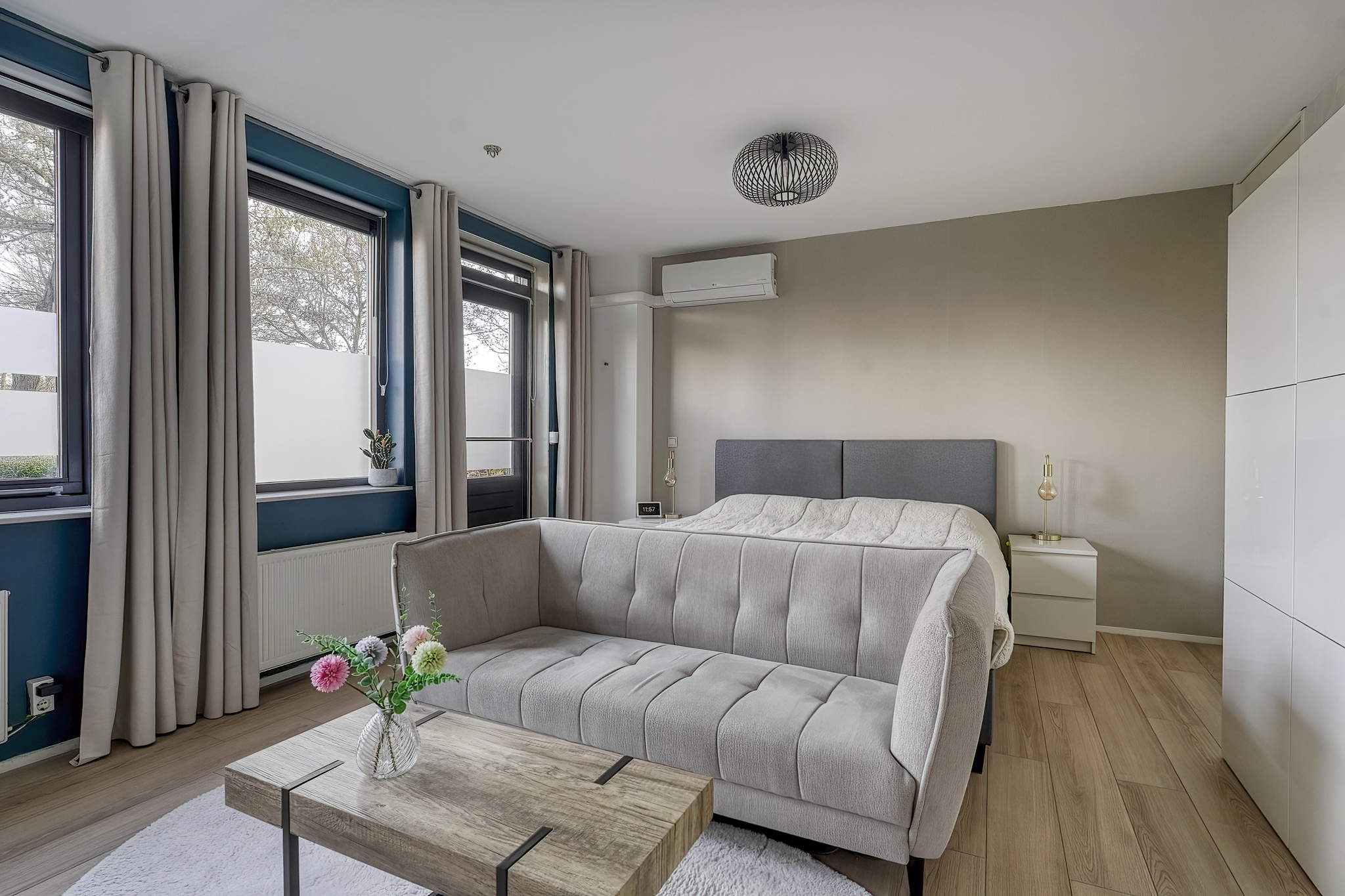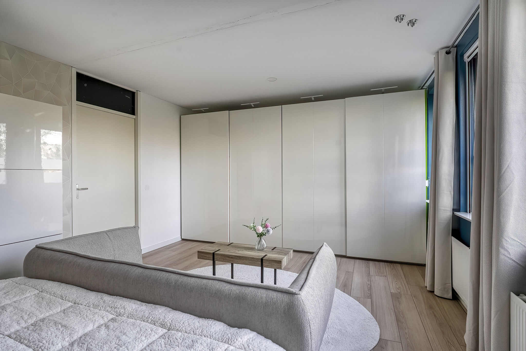 is voorzien van een grote kastenwand, airconditioning en rolluiken. Extra fijn is de trapkast voor bergruimte én de deur naar de achtertuin met uitzicht op het mooie park.