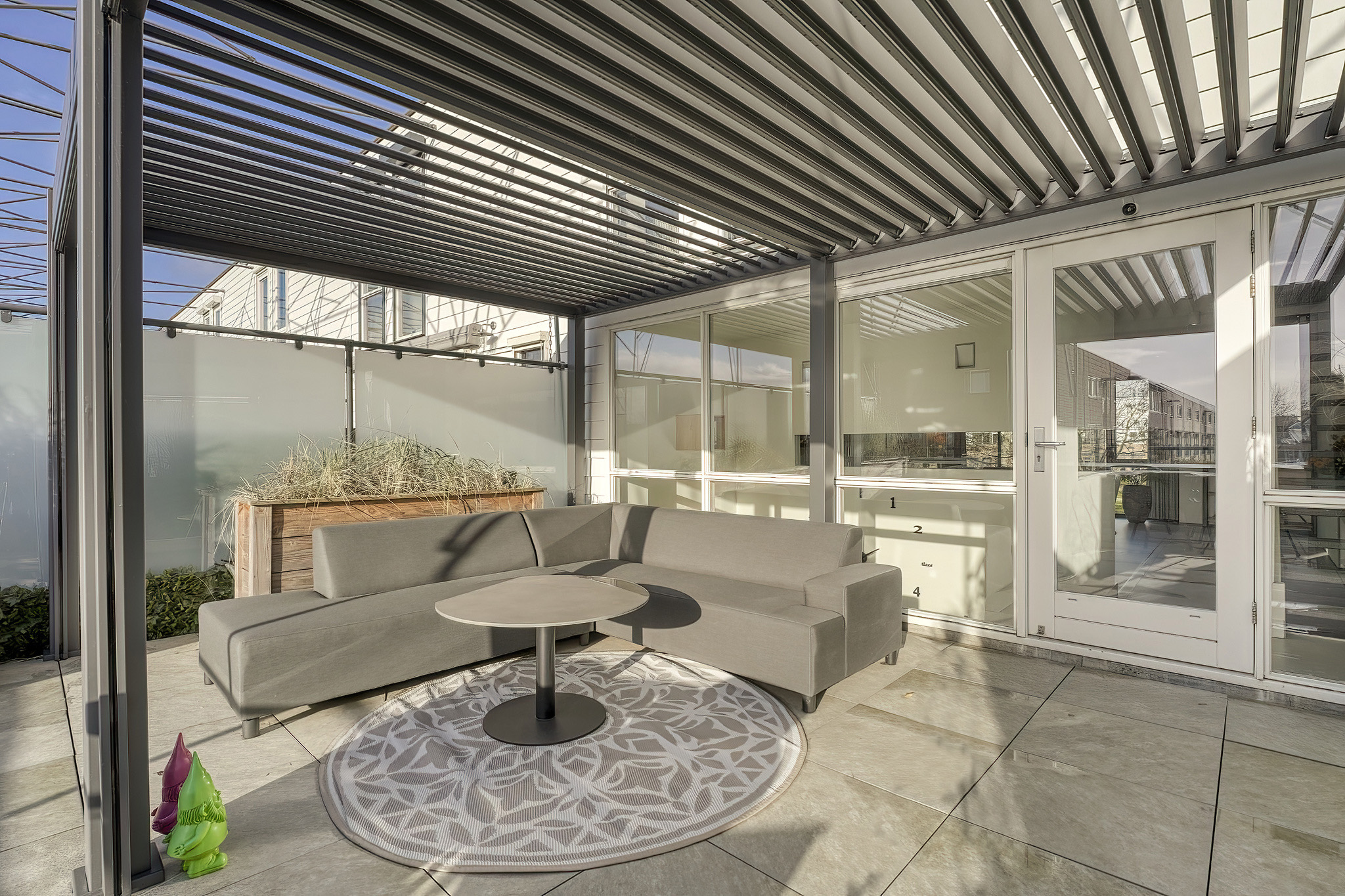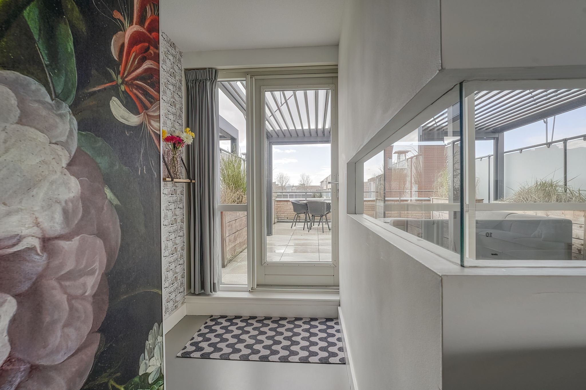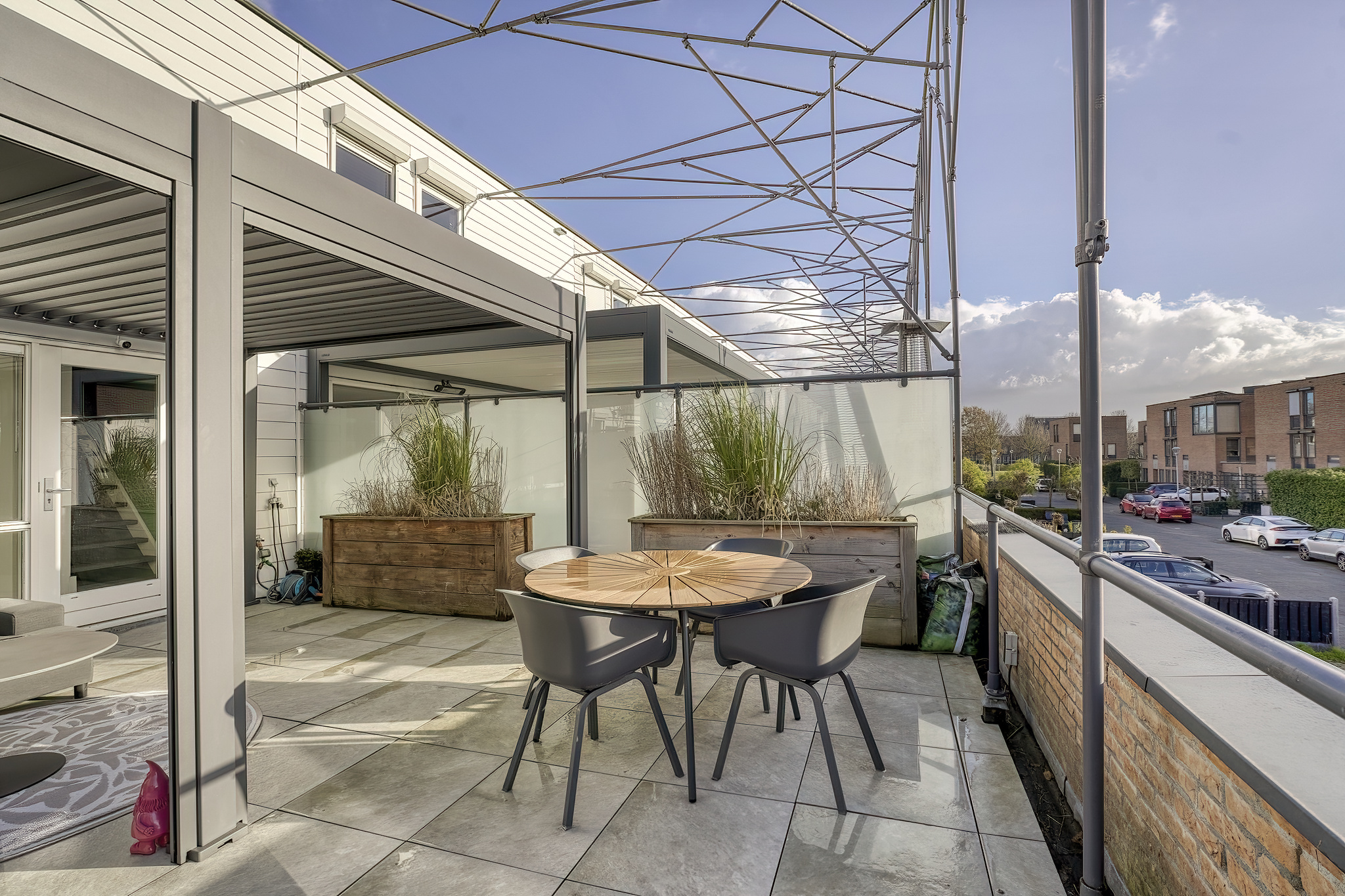 Het dakterras (circa 37 m²) is een heerlijke plek om te relaxen in de zon. De zuidwest ligging garandeert vele zonuren, terwijl de lamellenoverkapping voor verkoelende schaduw kan zorgen. Het terras is netjes betegeld en beschikt over een buitenkraan en elektra.