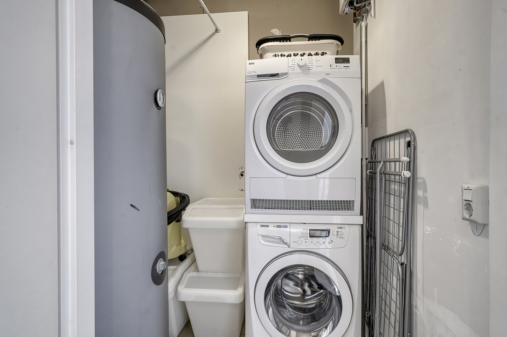 De ruime overloop geeft toegang tot een royale slaapkamer aan de voorzijde voorzien van rolluiken. Naastgelegen bevindt zich de praktische wasruimte met de cv-opstelling, wasmachine-/drogeraansluitingen en de zonneboiler voor warmwateropslag.