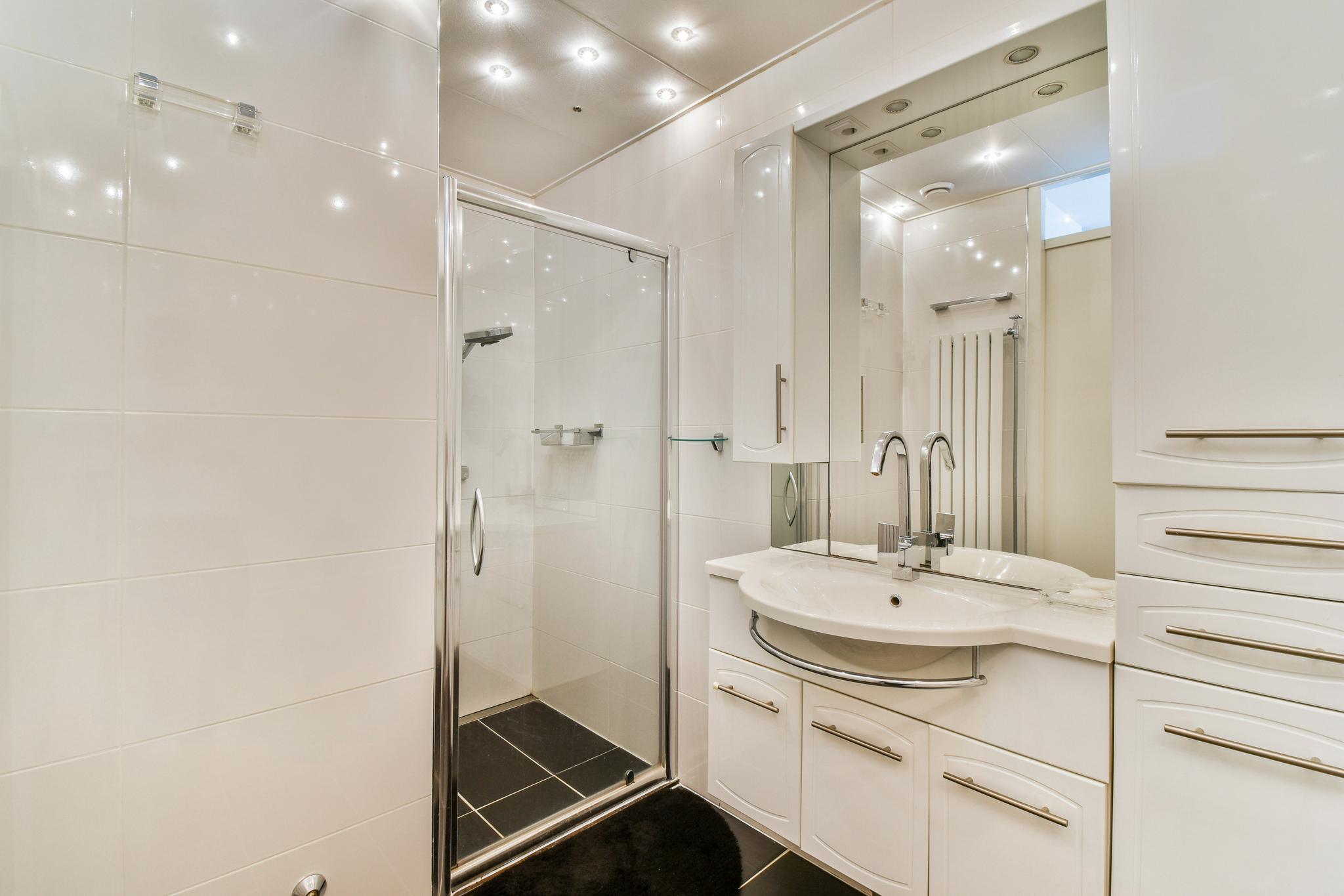 Badkamer met een wastafelmeubel, ligbad, douchecabine en een designradiator. De kleurstelling is neutraal en in het plafond is diverse inbouwverlichting geplaatst.