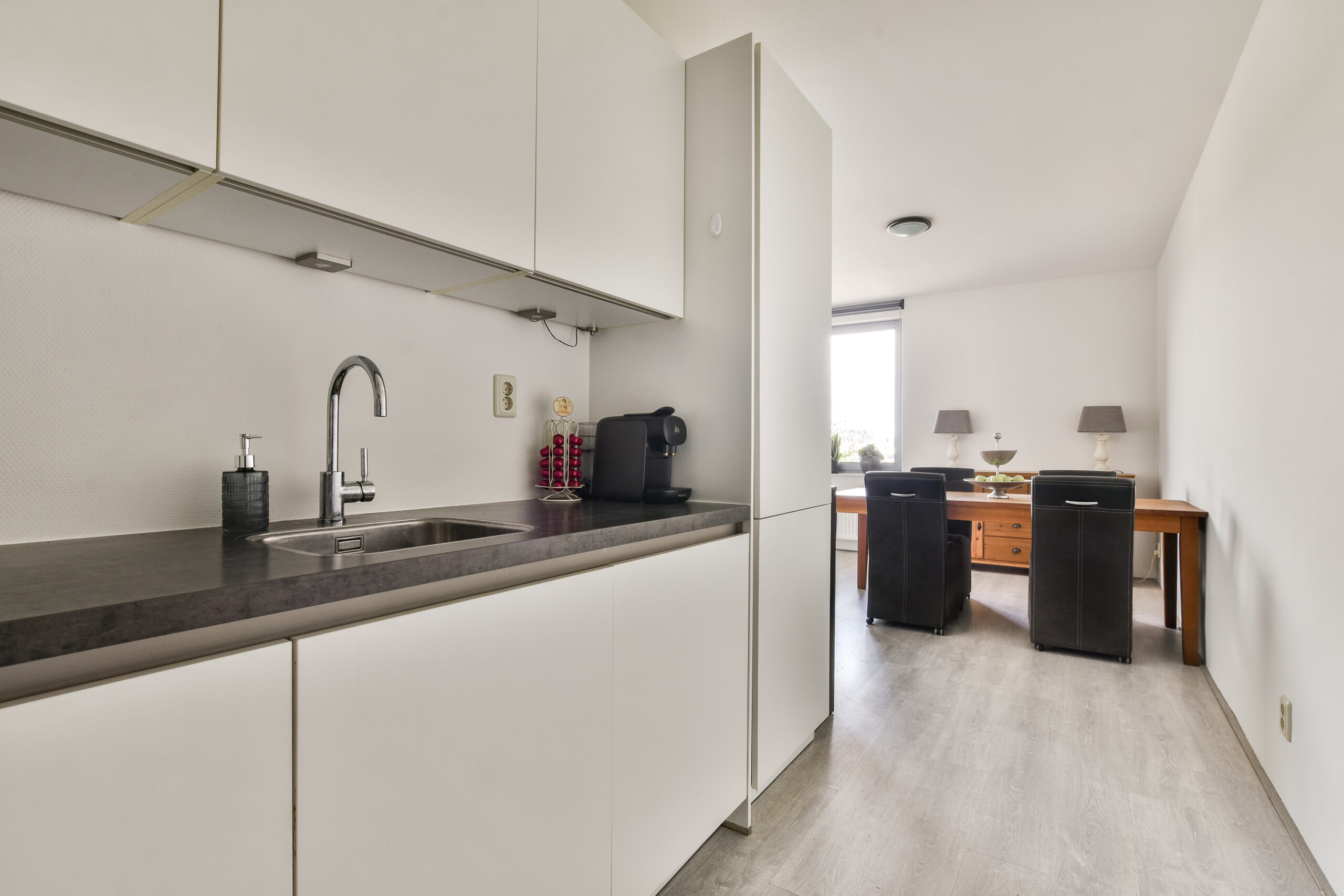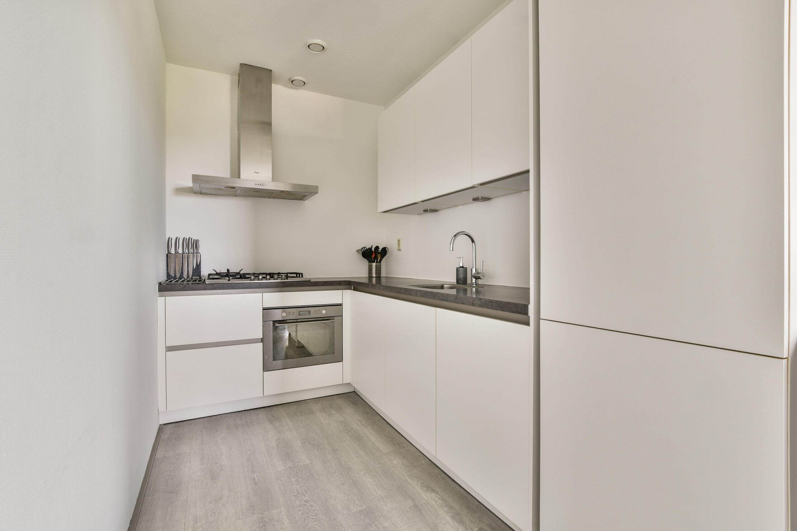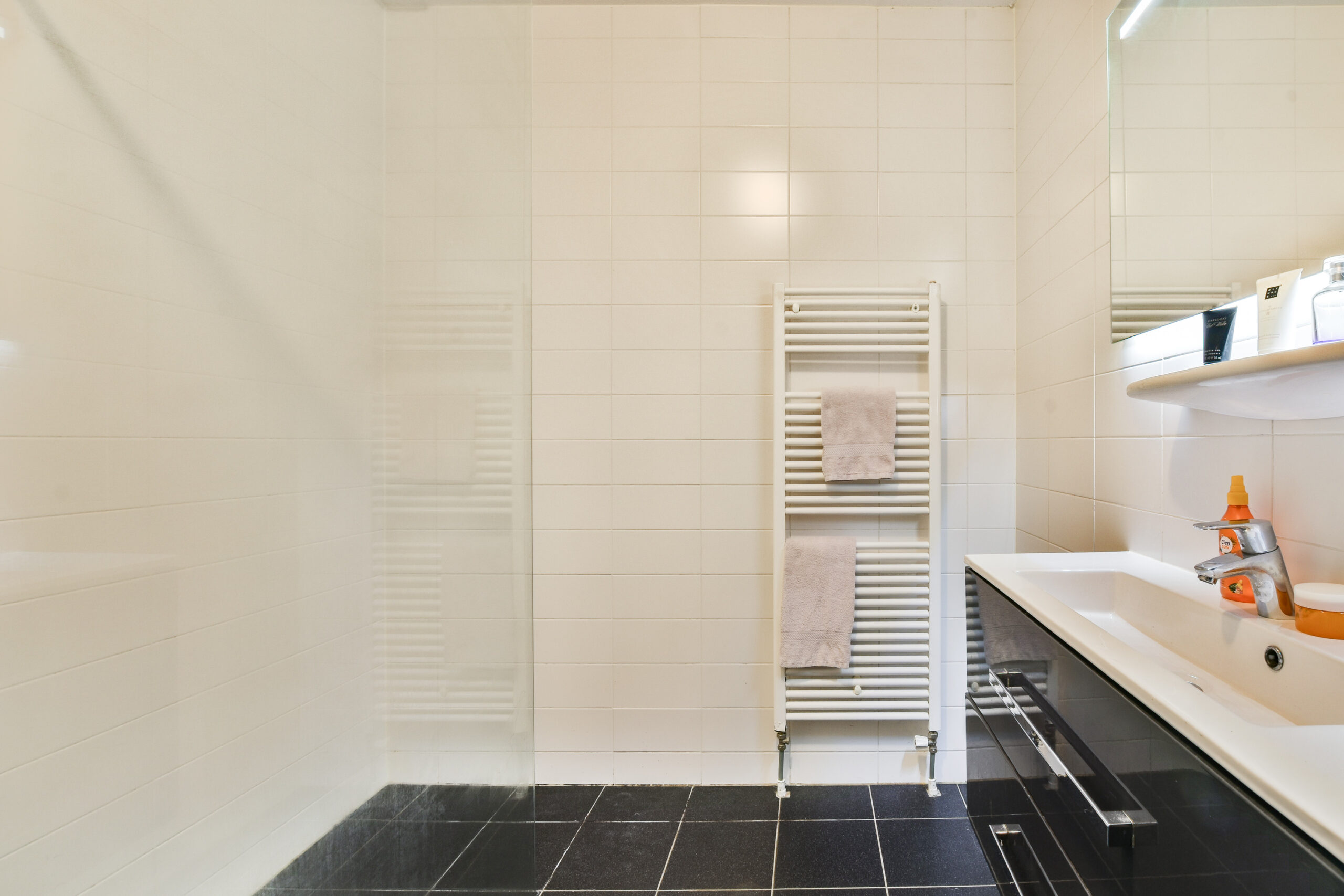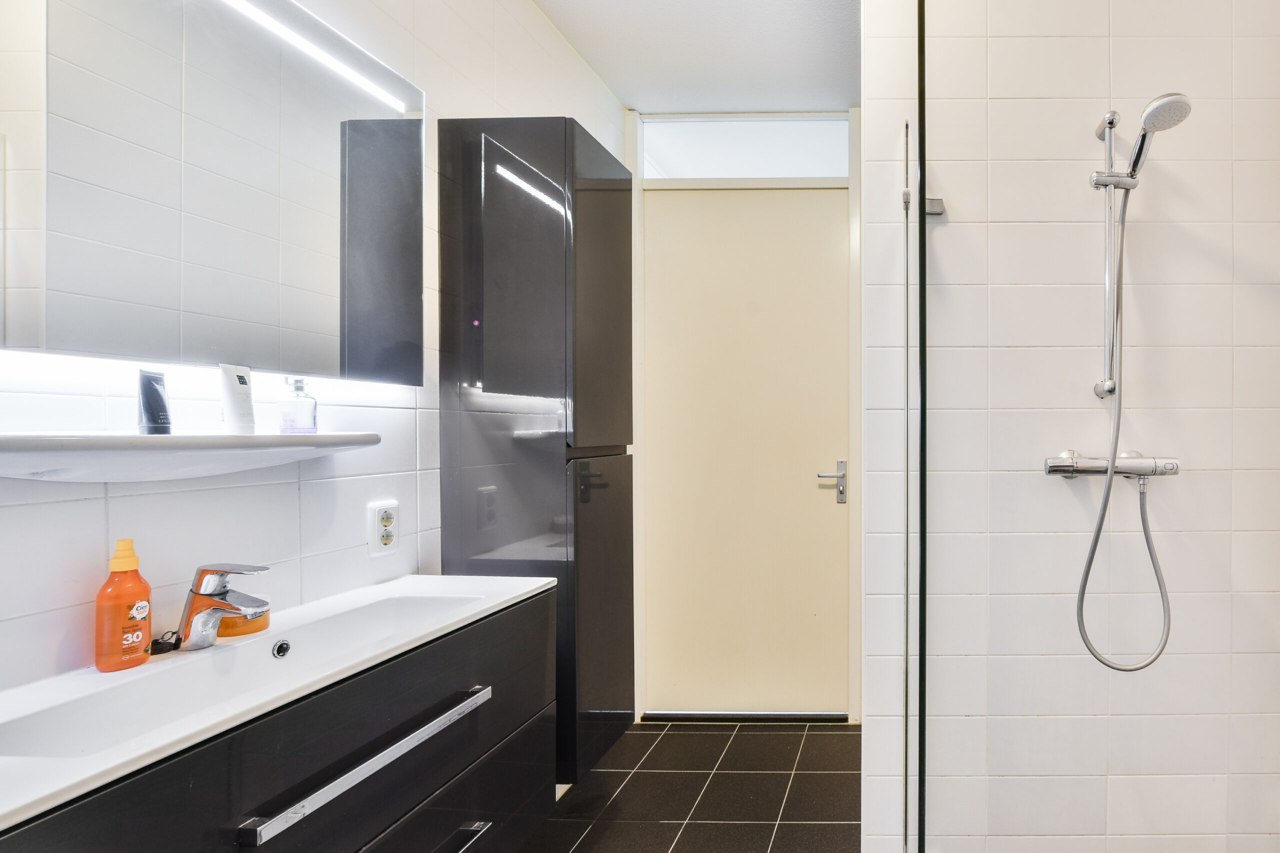 De open keuken is praktisch geplaatst in een hoekopstelling. De keuken beschikt over diverse inbouwapparatuur, waaronder een kookplaat, afzuigkap, combioven, vaatwasser en een koel-/vriescombinatie. De twee slaapkamers liggen aan de voorzijde van de woning en zijn beiden ruim opgezet. De badkamer is ingericht met een inloopdouche, designradiator en een wastafelmeubel. De badkamer is geheel betegeld met neutrale grijs-witte betegeling en voorzien van mechanische ventilatie. Tegenover de badkamer ligt een separate toiletruimte met toilet en fonteintje. In de hal bevinden zich daarnaast nog twee inbouwkasten, een met de cv-opstelling en de tweede met de opstelplaats voor de wasmachine.