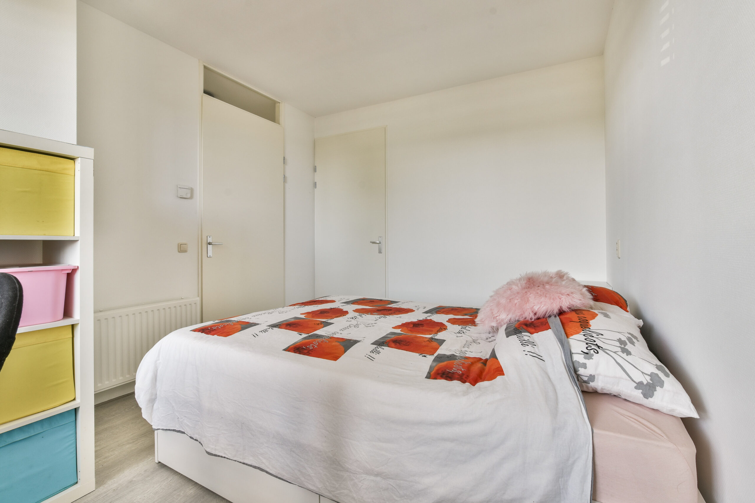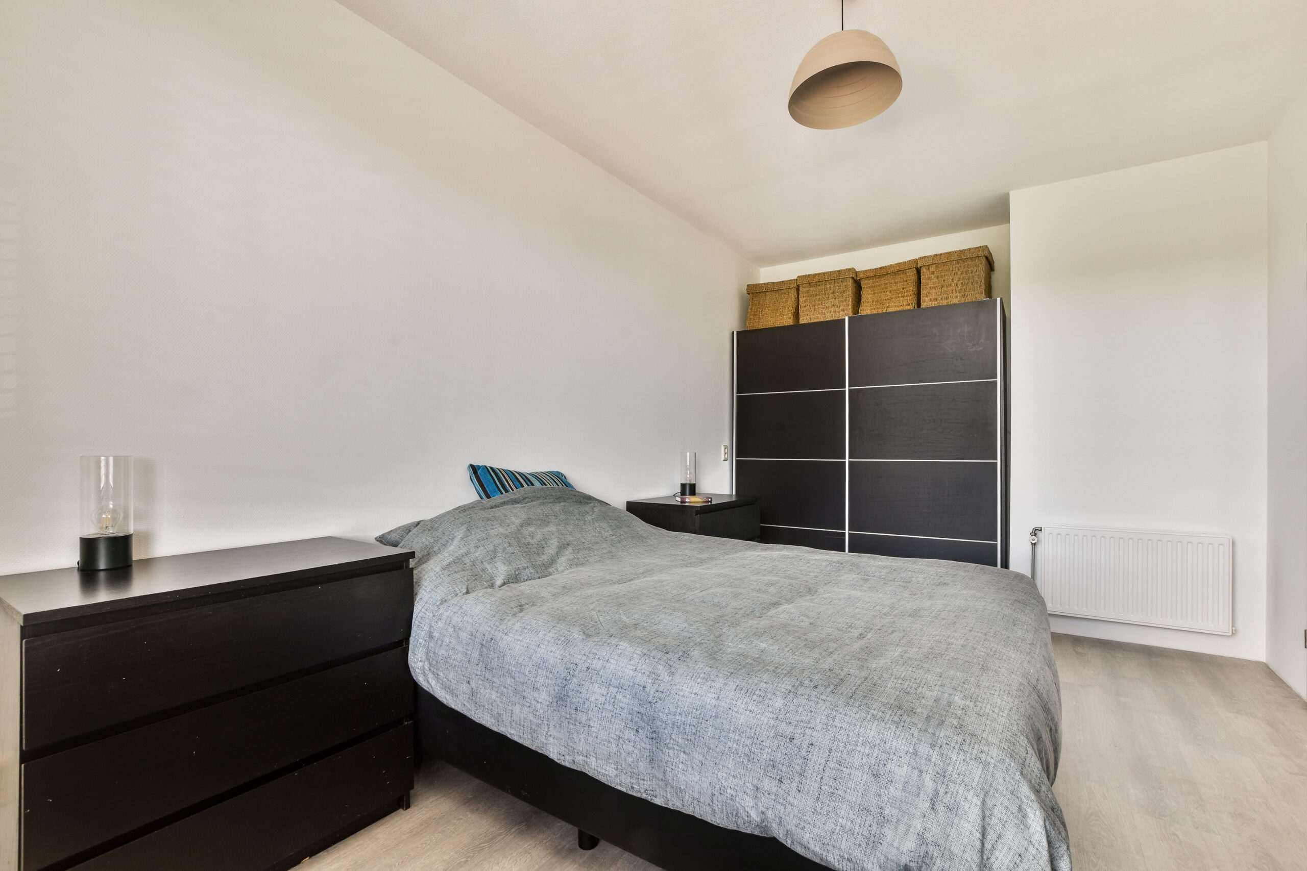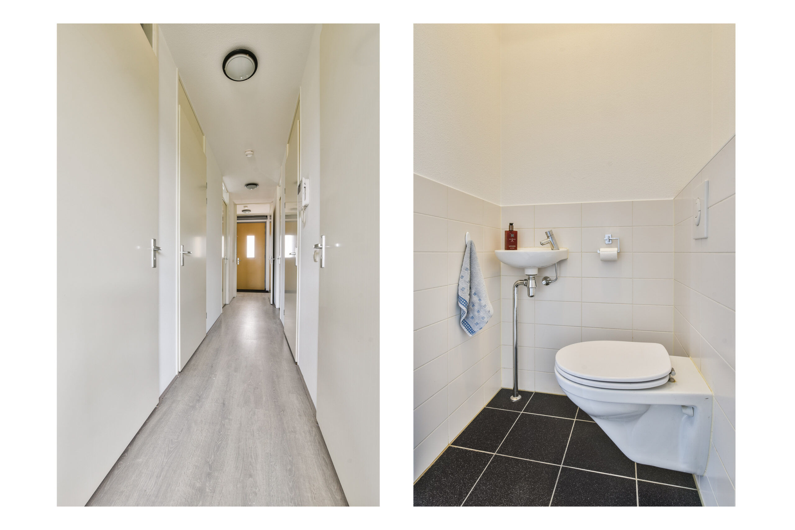 De open keuken is praktisch geplaatst in een hoekopstelling. De keuken beschikt over diverse inbouwapparatuur, waaronder een kookplaat, afzuigkap, combioven, vaatwasser en een koel-/vriescombinatie. De twee slaapkamers liggen aan de voorzijde van de woning en zijn beiden ruim opgezet. De badkamer is ingericht met een inloopdouche, designradiator en een wastafelmeubel. De badkamer is geheel betegeld met neutrale grijs-witte betegeling en voorzien van mechanische ventilatie. Tegenover de badkamer ligt een separate toiletruimte met toilet en fonteintje. In de hal bevinden zich daarnaast nog twee inbouwkasten, een met de cv-opstelling en de tweede met de opstelplaats voor de wasmachine.