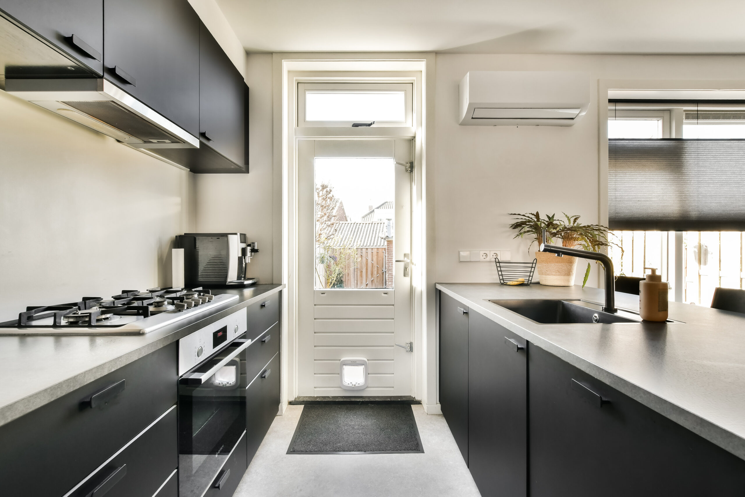 van diverse inbouwapparatuur, waaronder een vaatwasser, koel-/vriescombinatie, combioven, 5-pits gasfornuis, afzuigkap en zwarte spoelbak. Vanuit de keuken is er toegang tot de achtertuin.