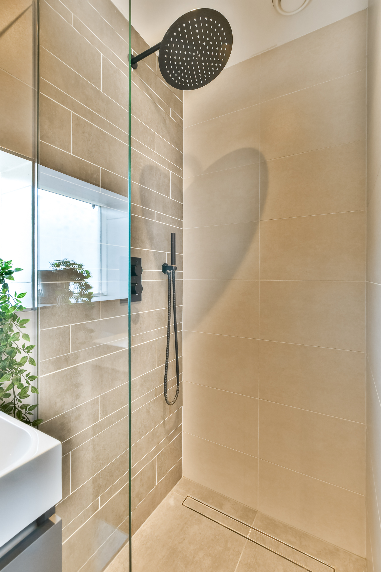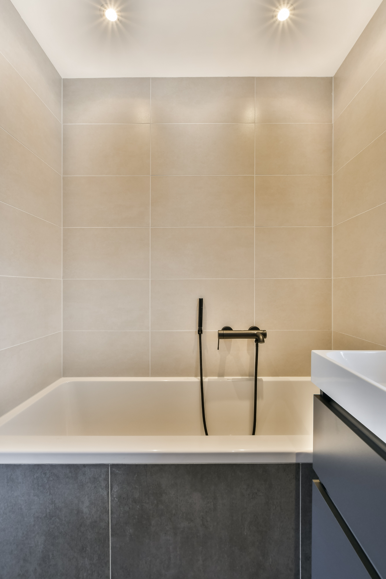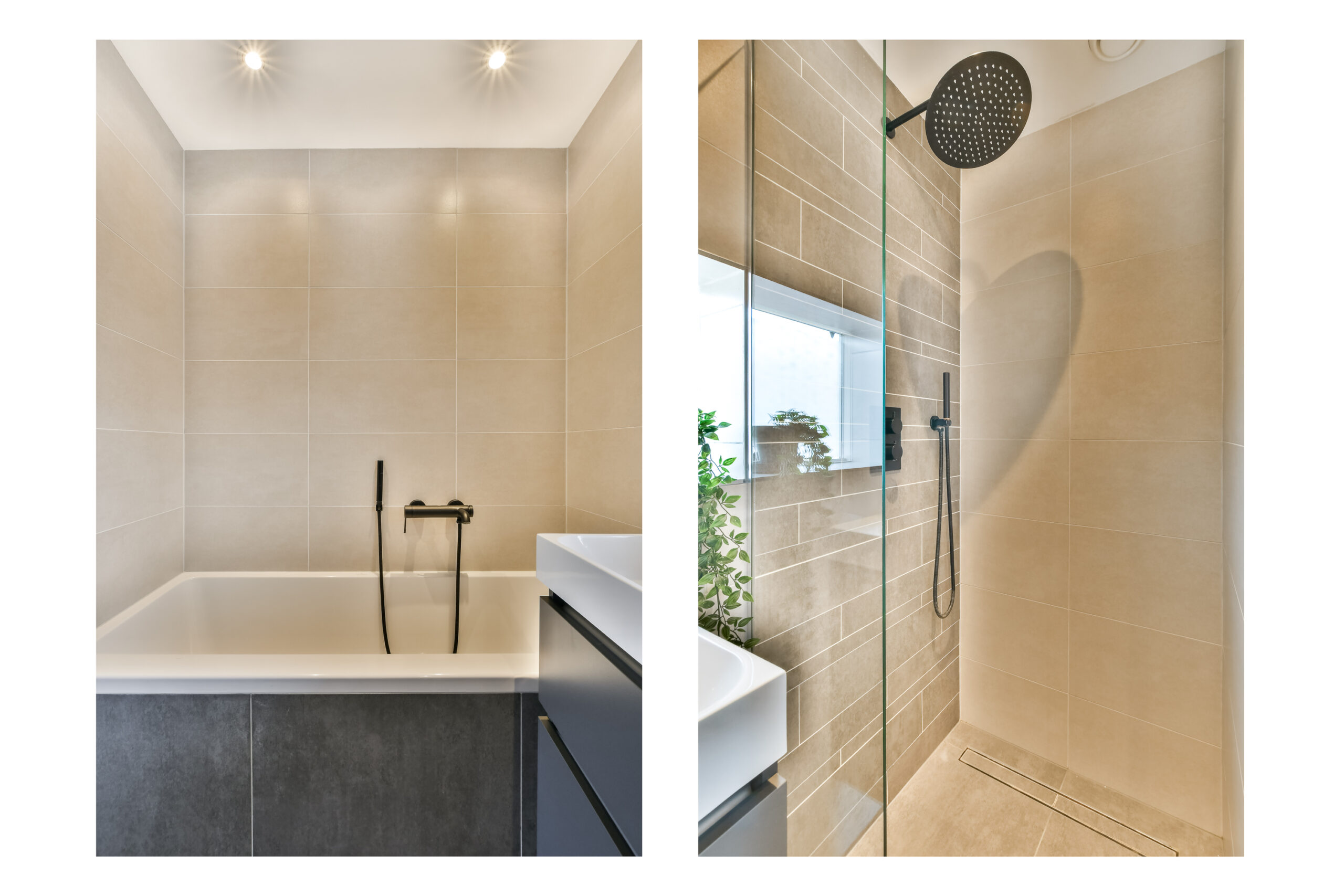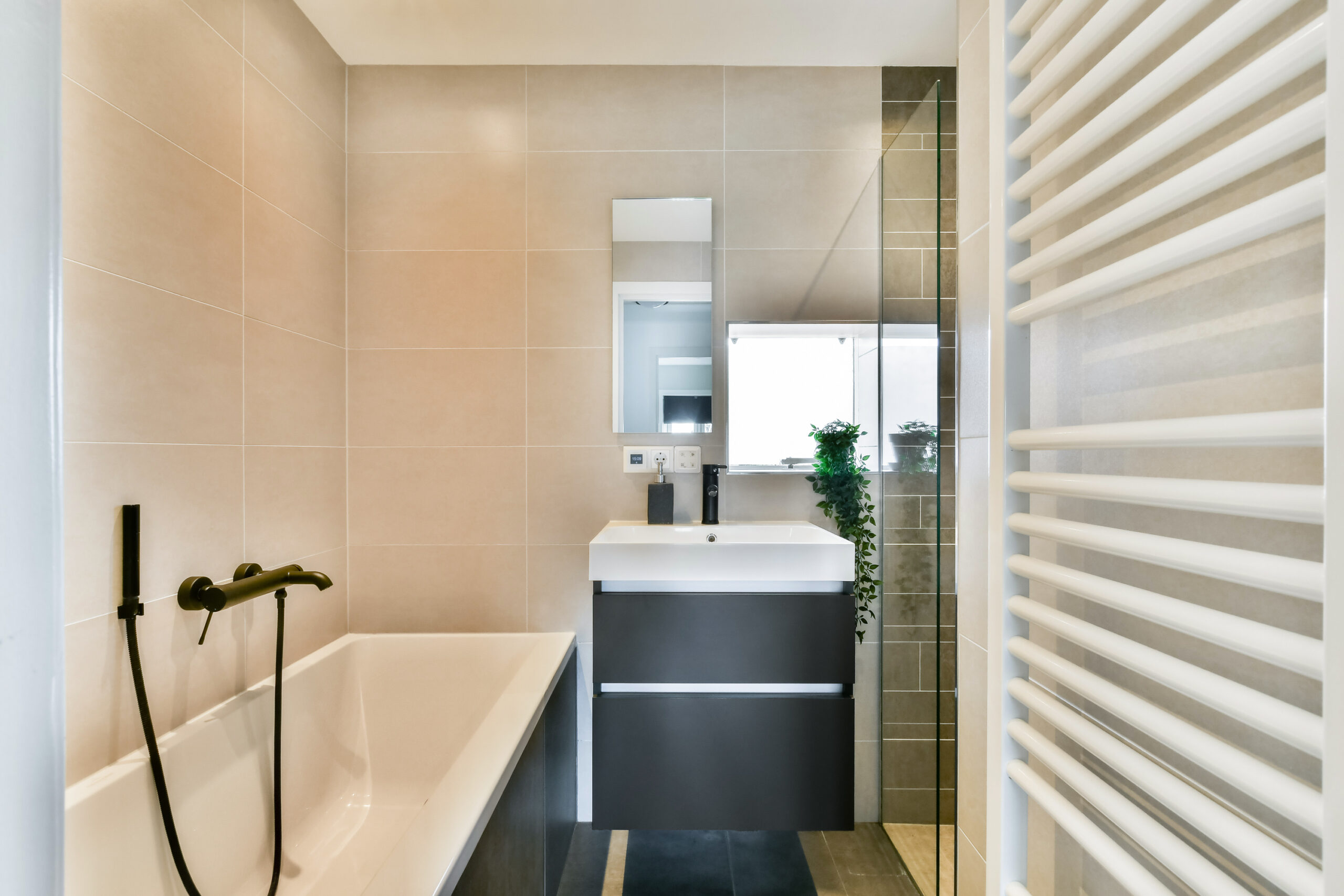 De badkamer is modern uitgevoerd en voorzien van een ligbad, douchecabine, designradiator en wastafelmeubel.