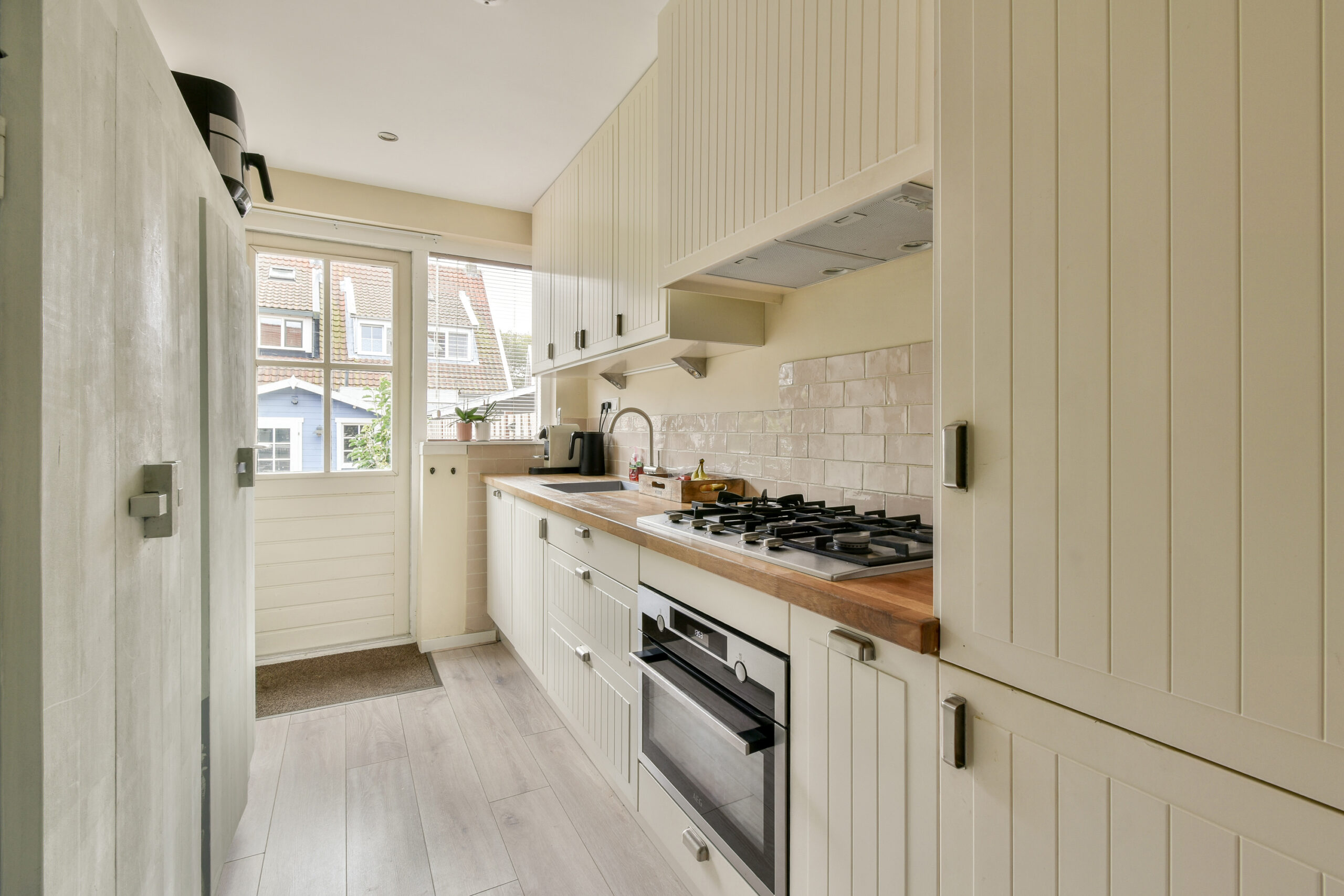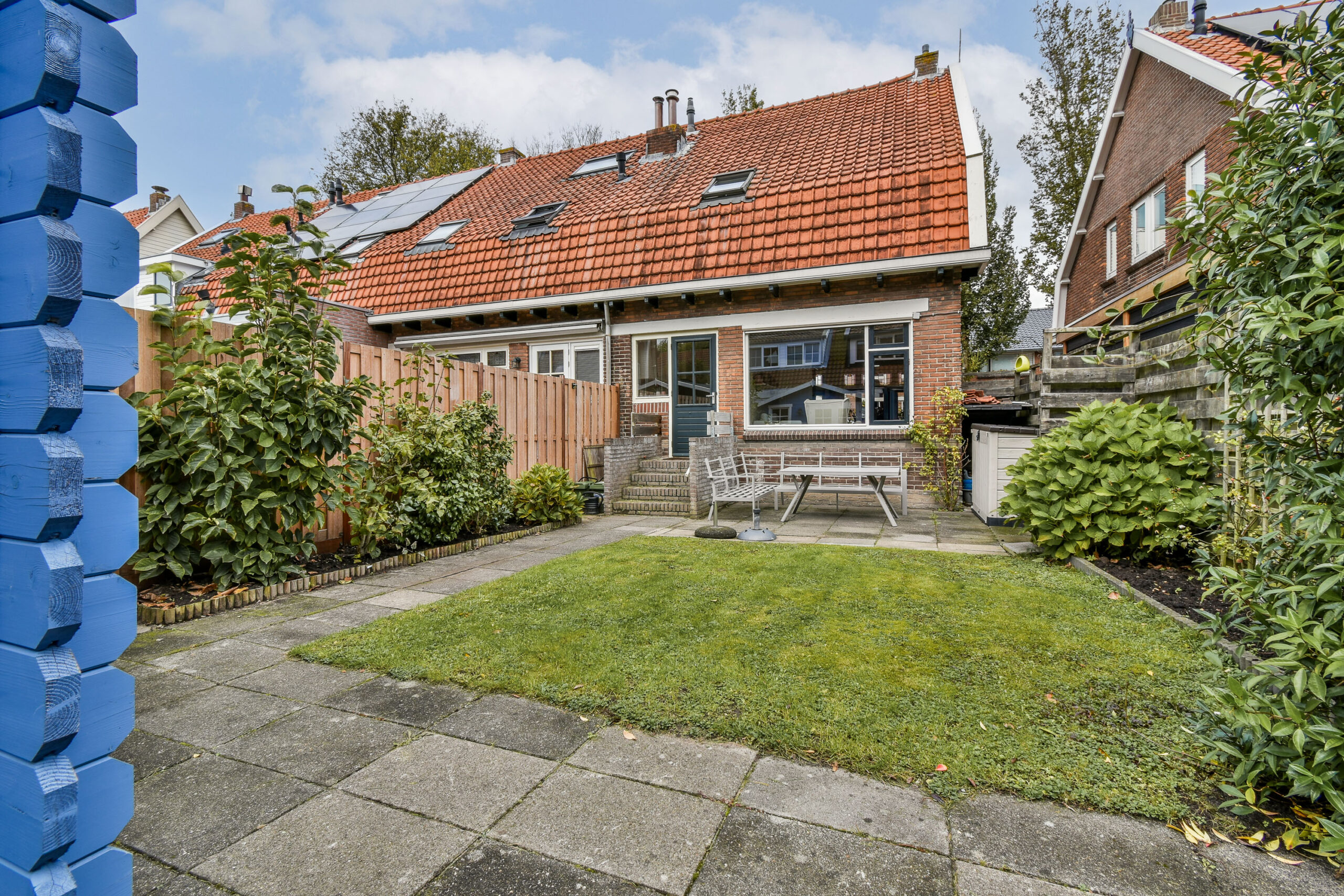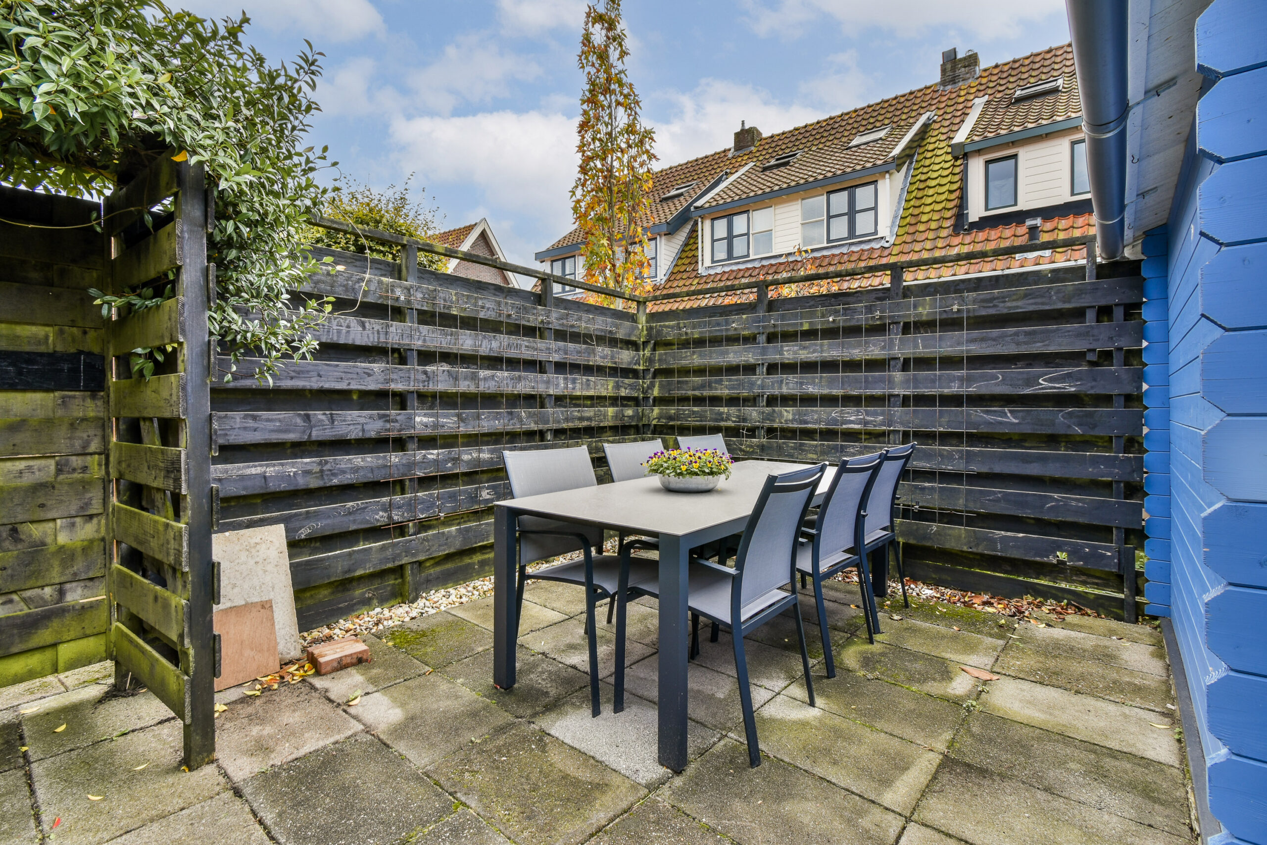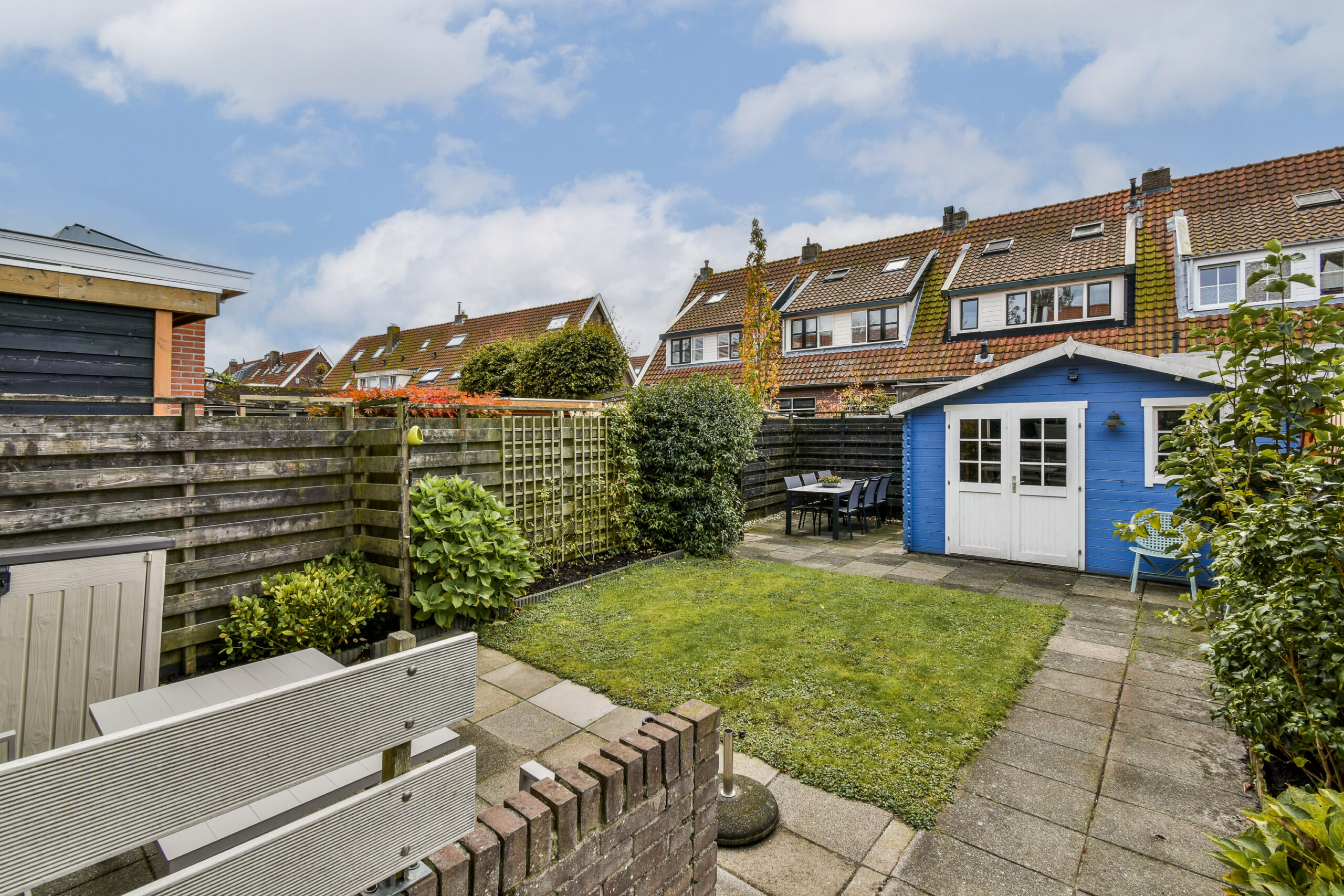 Vanuit de keuken loopt u de zonnige en royale achtertuin in welke op het zuidwesten is gelegen. Hier geniet u vrijwel de hele dag van de zon. De tuin beschikt over twee terrassen, een ruime vrijstaande houten berging (voorzien van elektra) en een achterom.