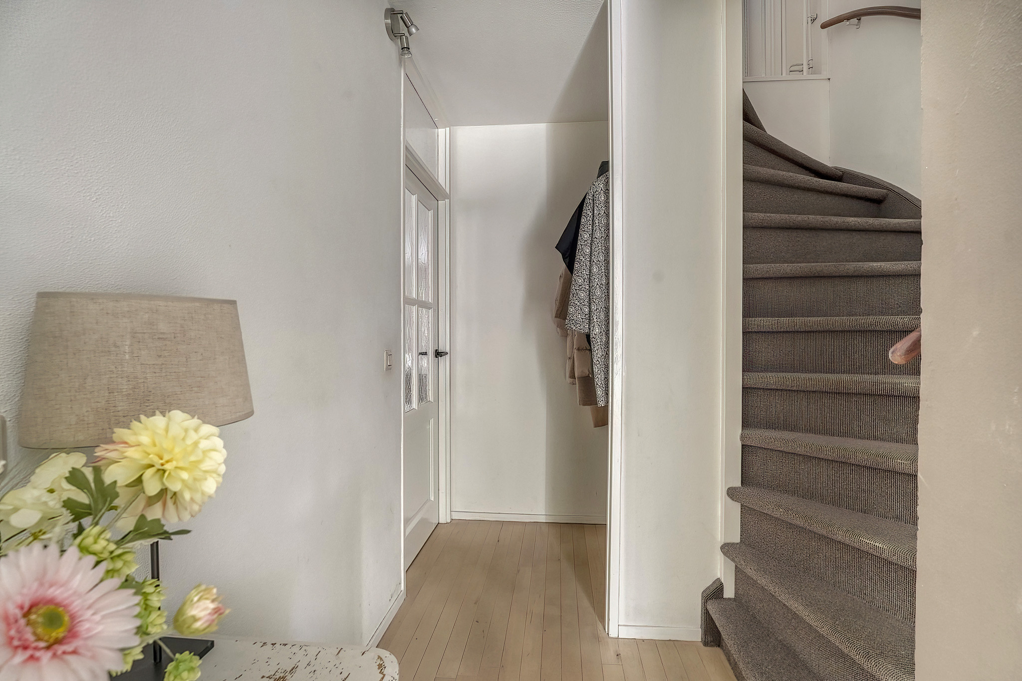 Aan de voorzijde ligt de ruime oprit met plaats voor twee auto’s en toegang tot de zijtuin langs het water met fietsenberging. Via de verzorgde entree komt u in de ruime hal met toilet, meterkast, garderoberuimte en praktische trapkast. Vanuit hier bereikt u tevens de extra kamer (voormalige garage), ideaal als werkkamer, hobbyruimte of slaapkamer op de begane grond, met de mogelijkheid om hier een douche te realiseren. Deze ruimte heeft een eigen entree.