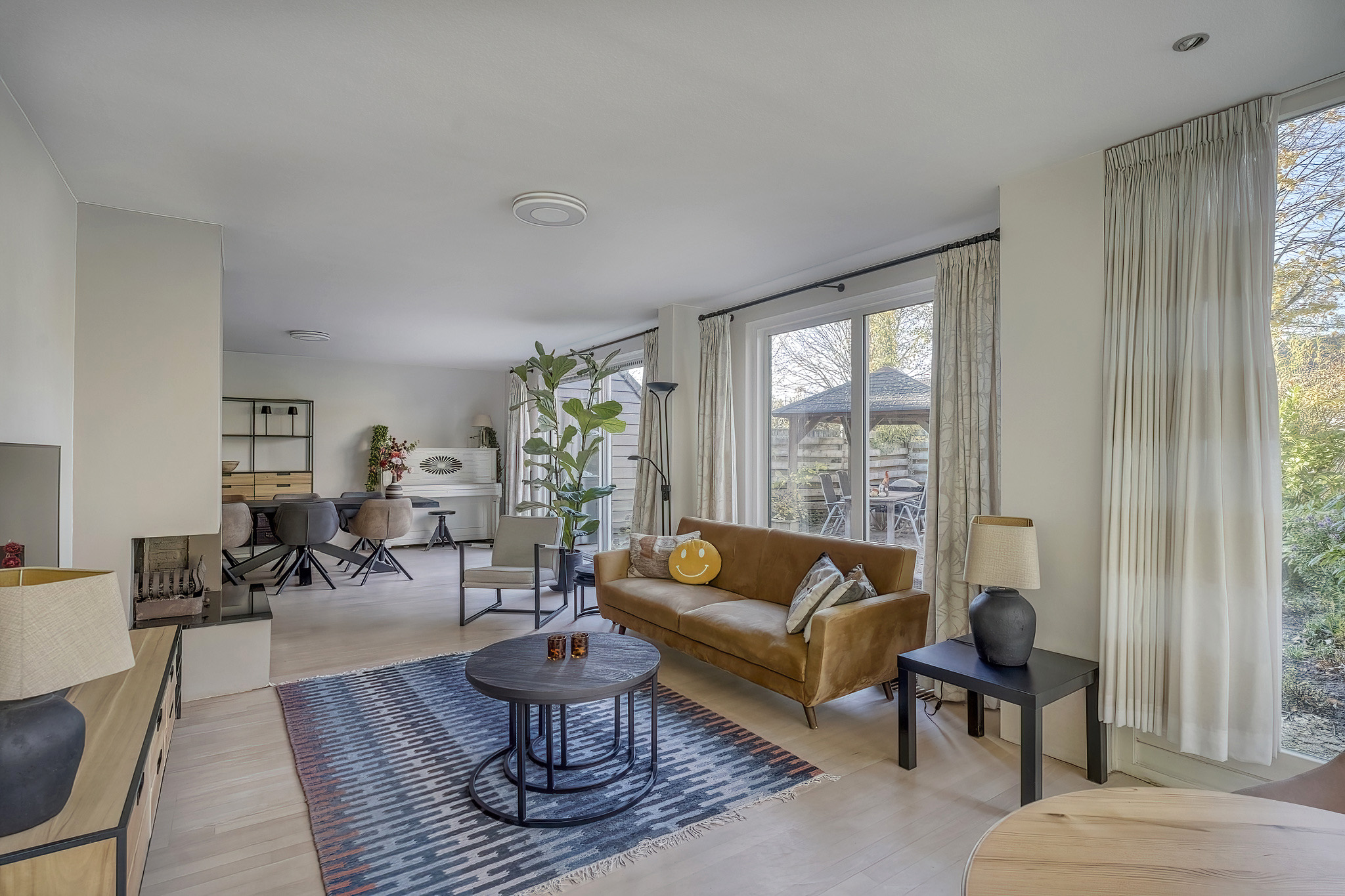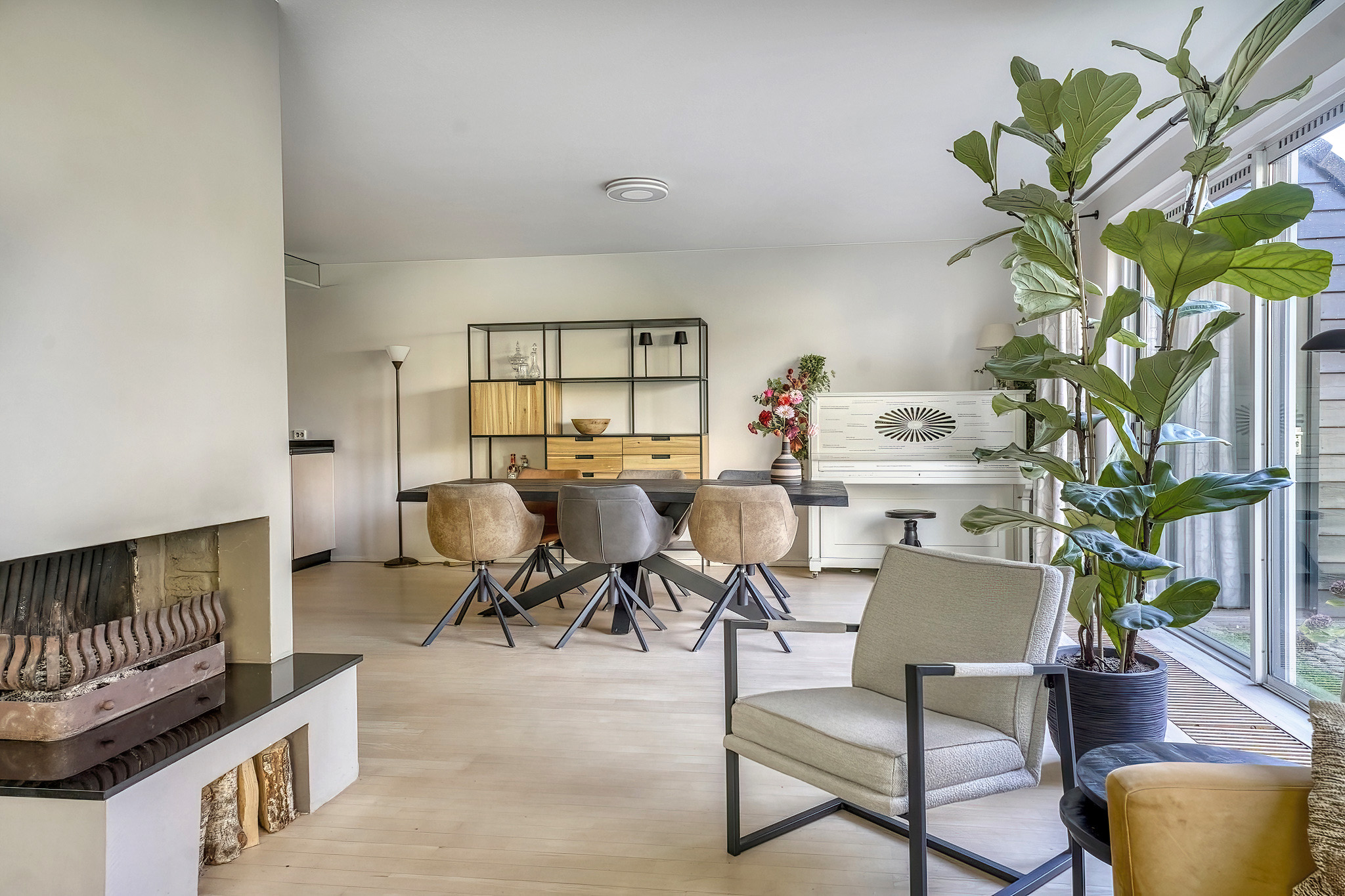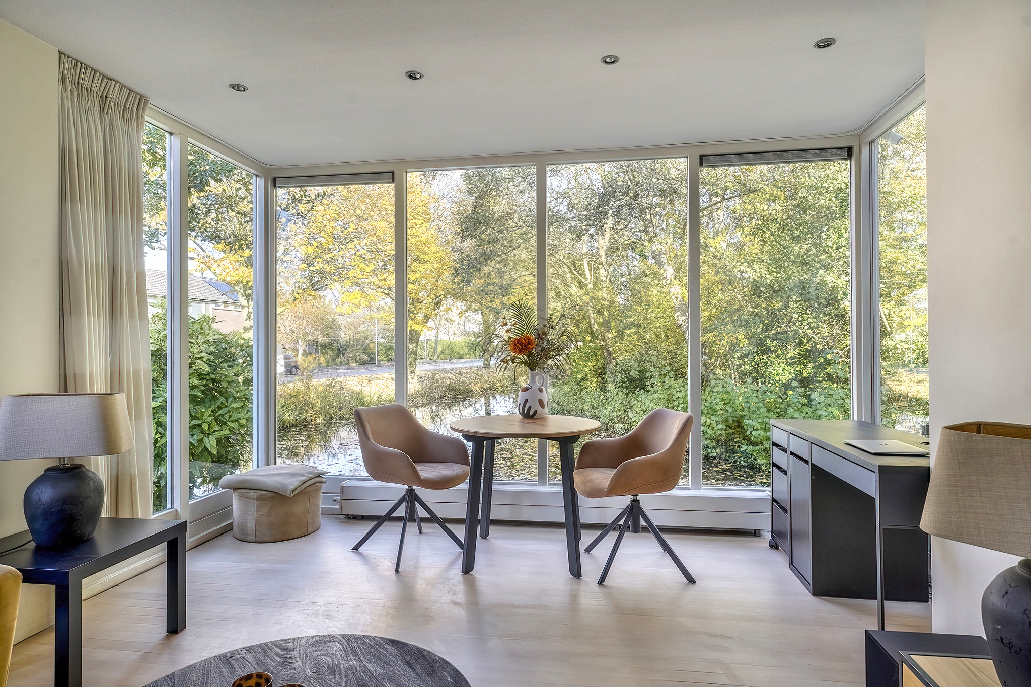 over het water. De open haard zorgt voor extra sfeer en maakt dit een warme, uitnodigende leefruimte.