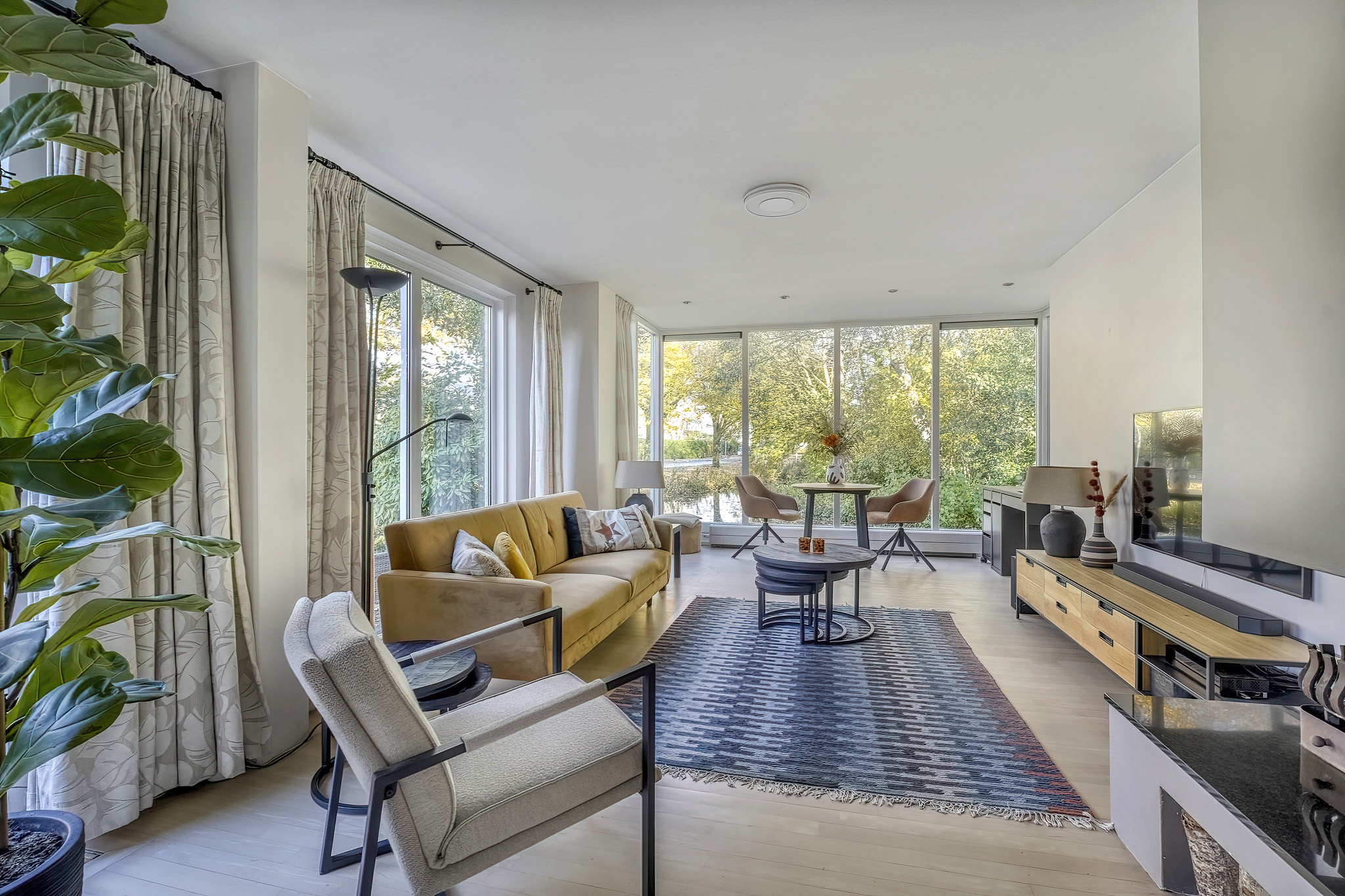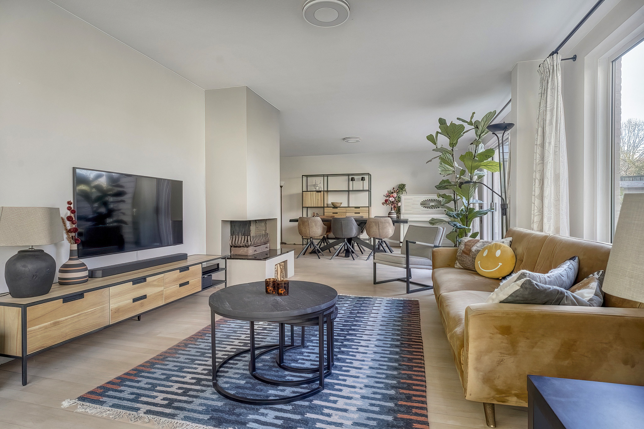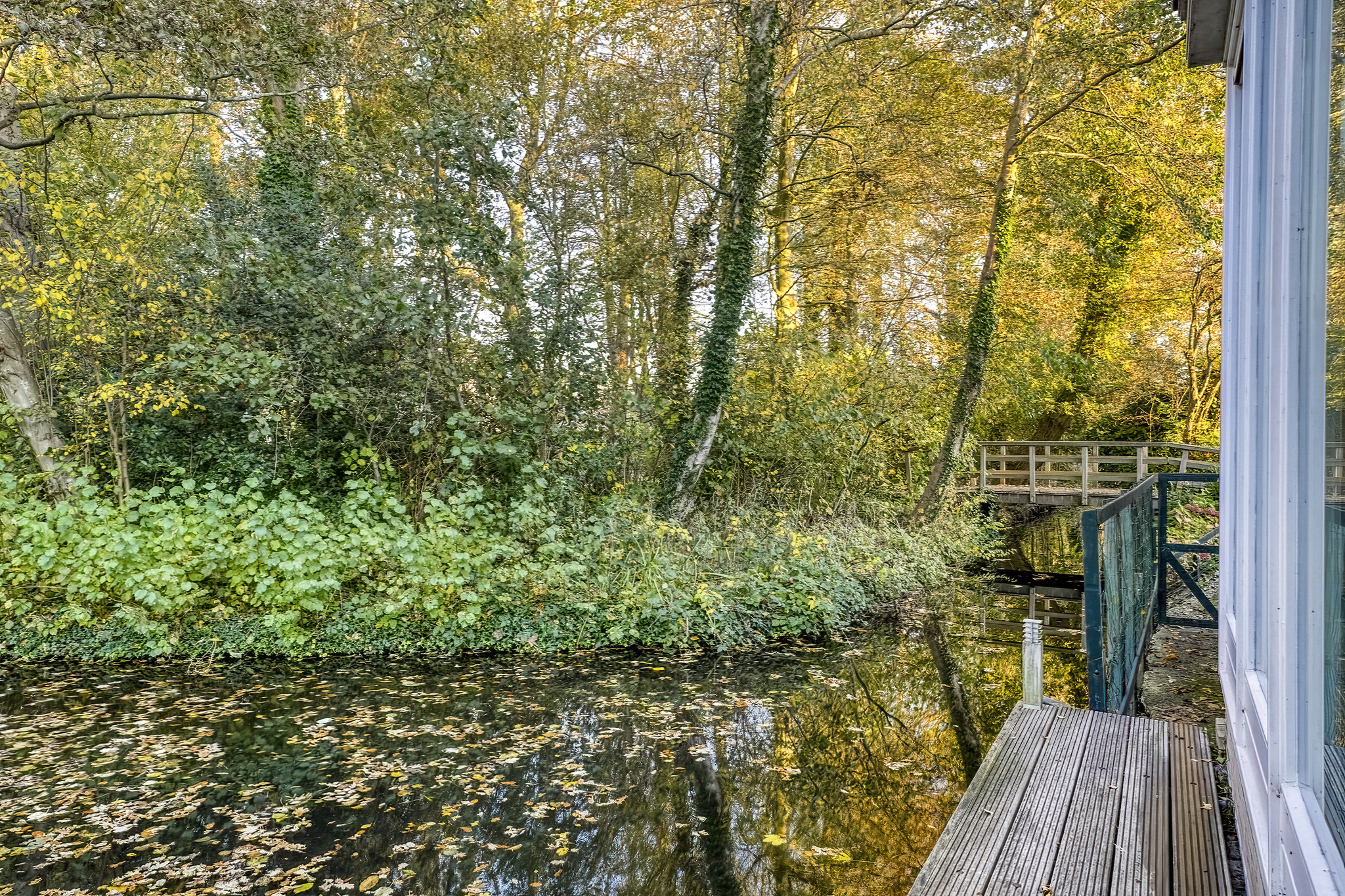 over het water. De open haard zorgt voor extra sfeer en maakt dit een warme, uitnodigende leefruimte.