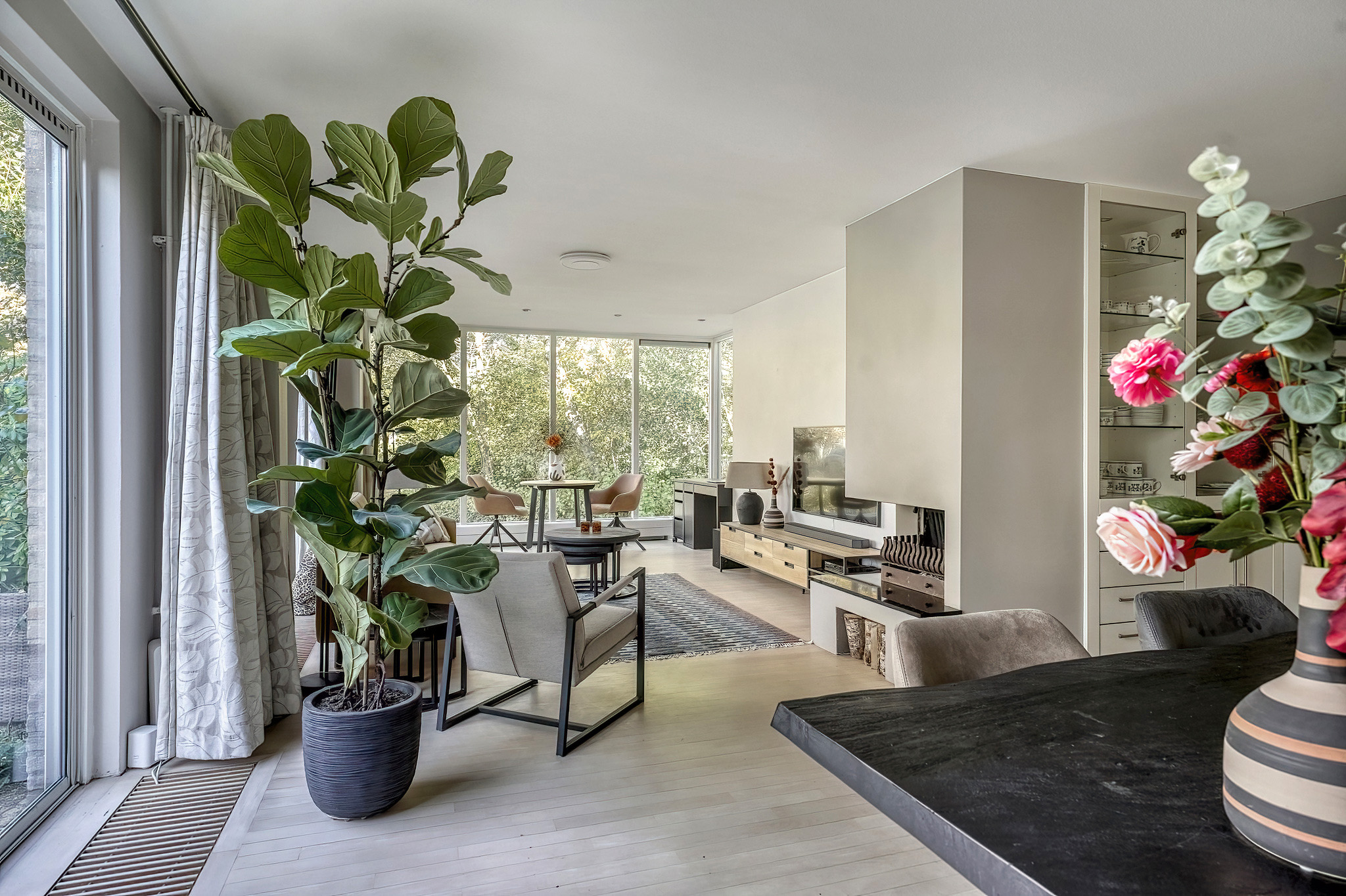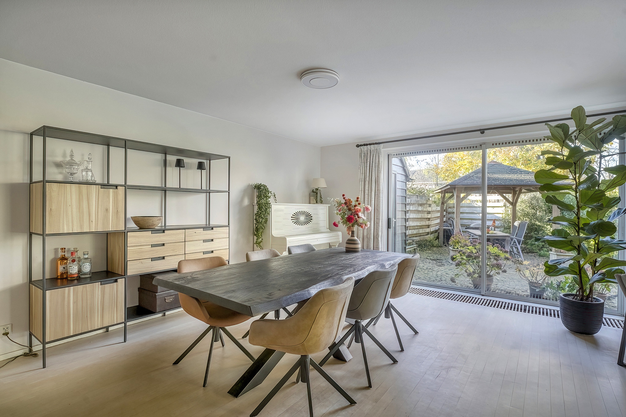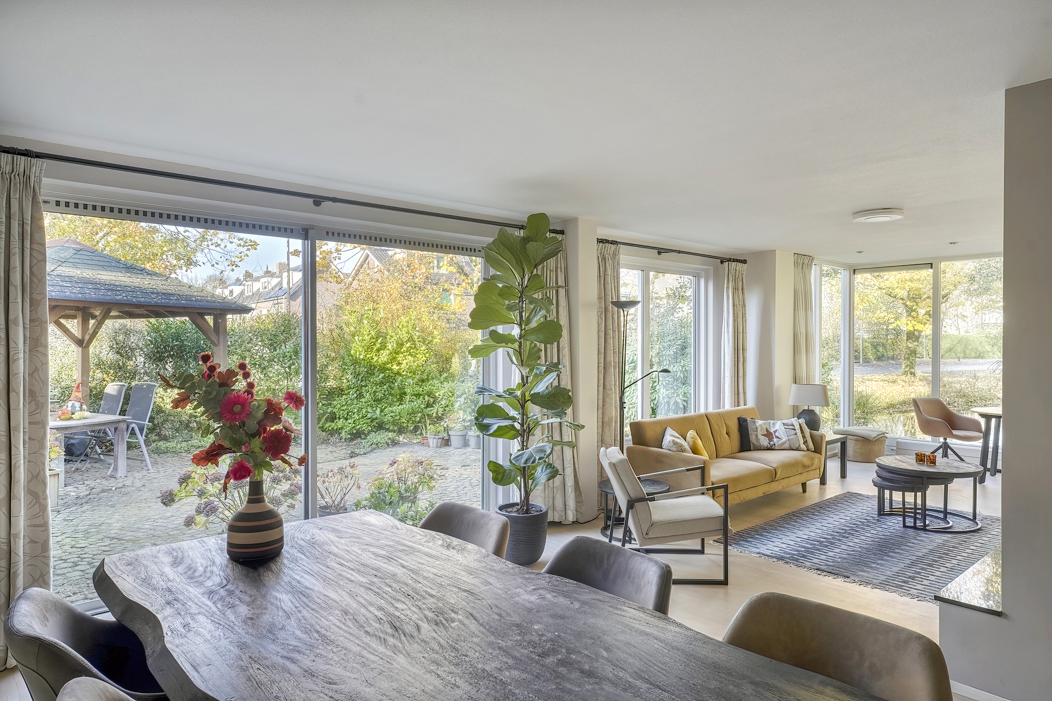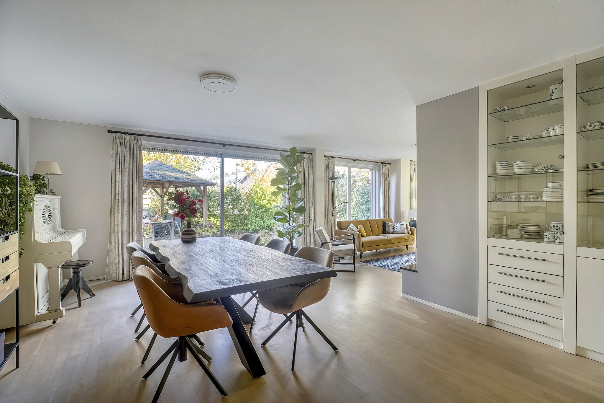 De eethoek biedt ruimte voor een grote tafel met uitzicht op de groene tuin. De aangrenzende woonkamer is bijzonder licht door de grote raampartijen en de aangebouwde serre met vrij uitzicht