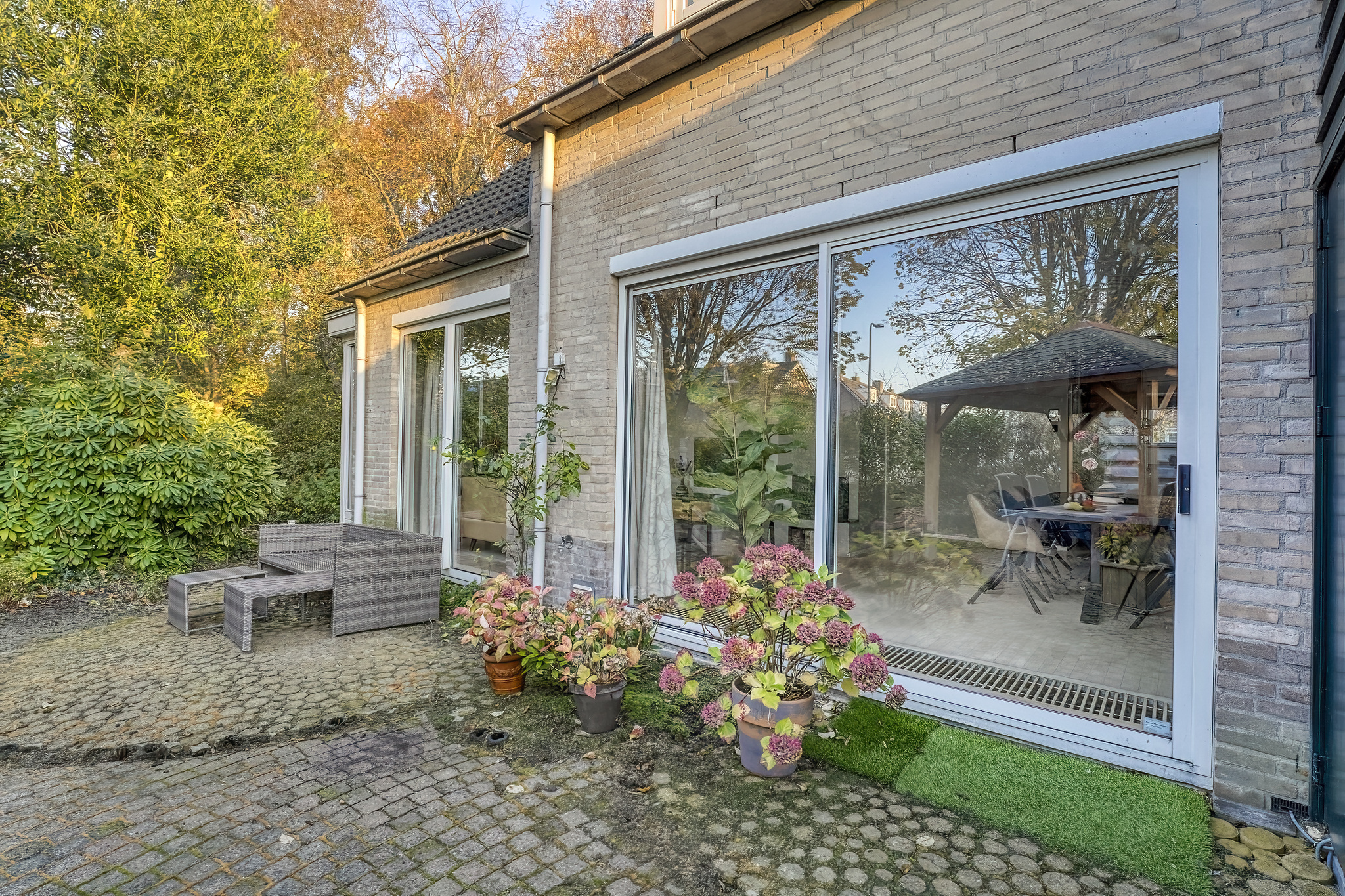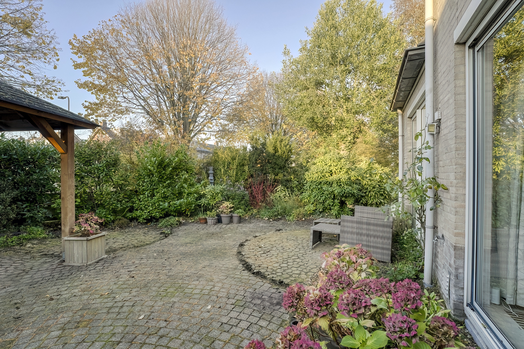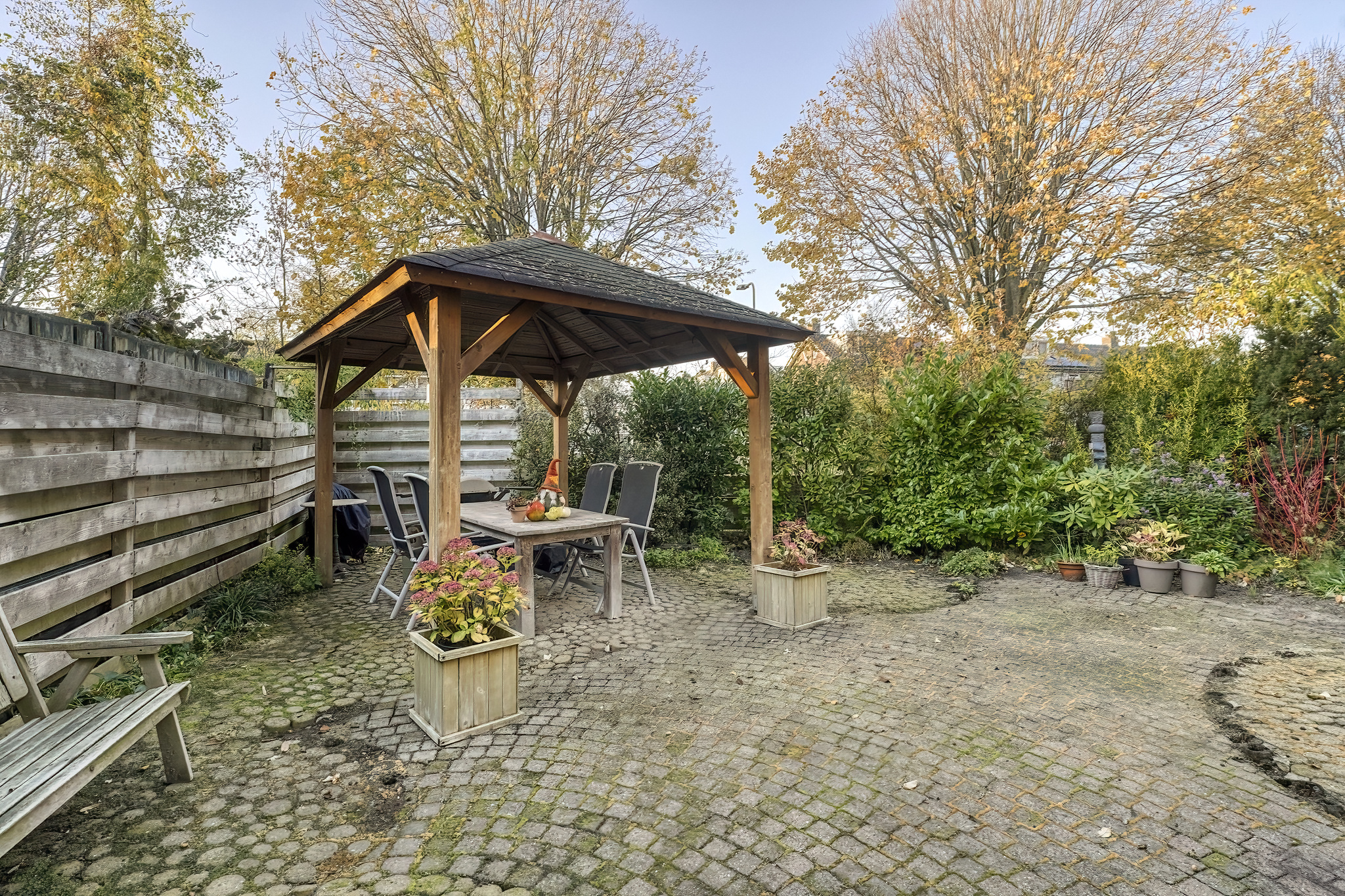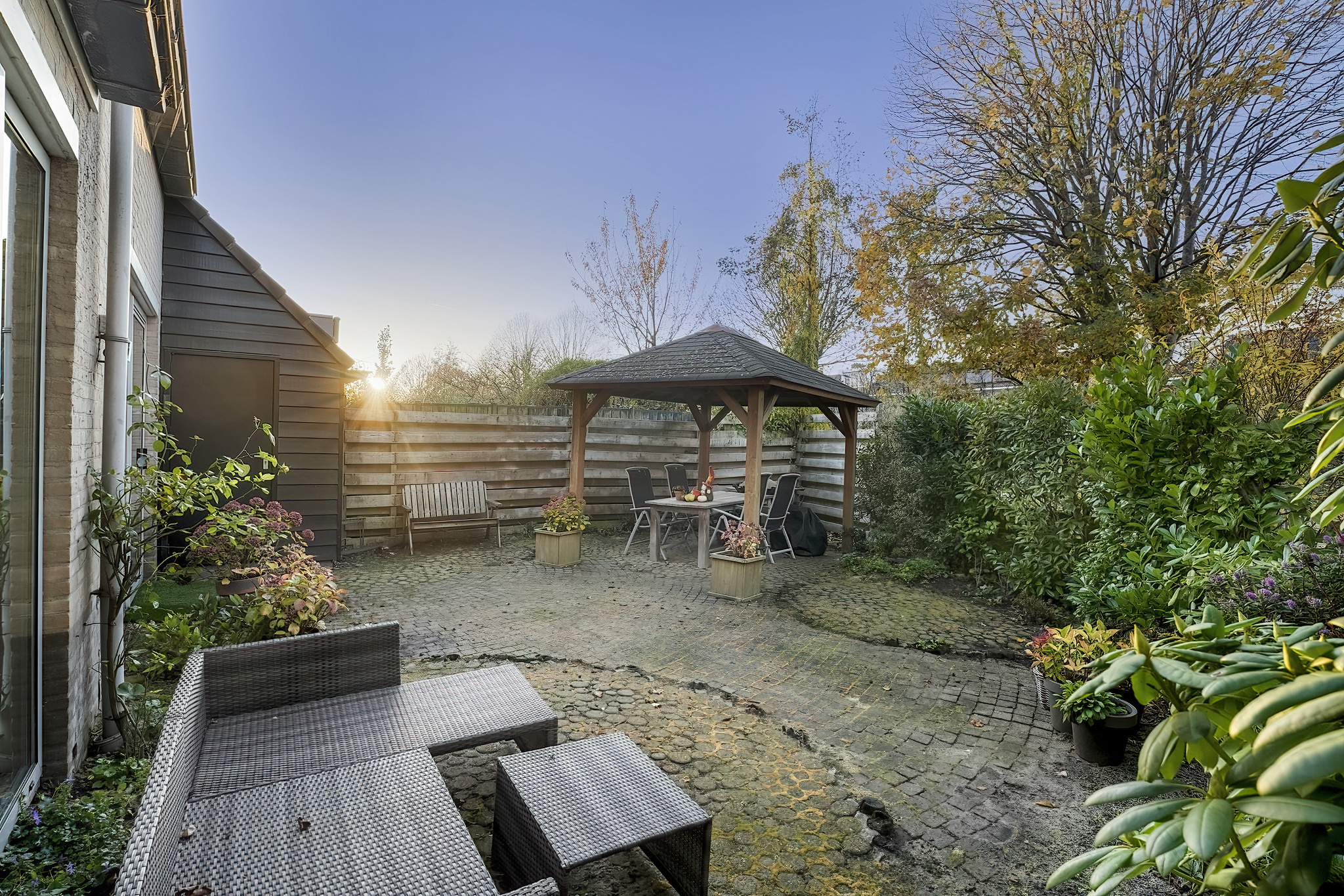 De verzorgde achtertuin ligt op het noordwesten en biedt volop zon en privacy. De tuin is netjes betegeld, voorzien van vaste beplanting en beschikt over een geïsoleerde berging. Onder het sfeervolle prieel met infraroodverwarming kunt u comfortabel buiten zitten. Via de zijtuin langs het water bereikt u de voortuin en fietsenberging.