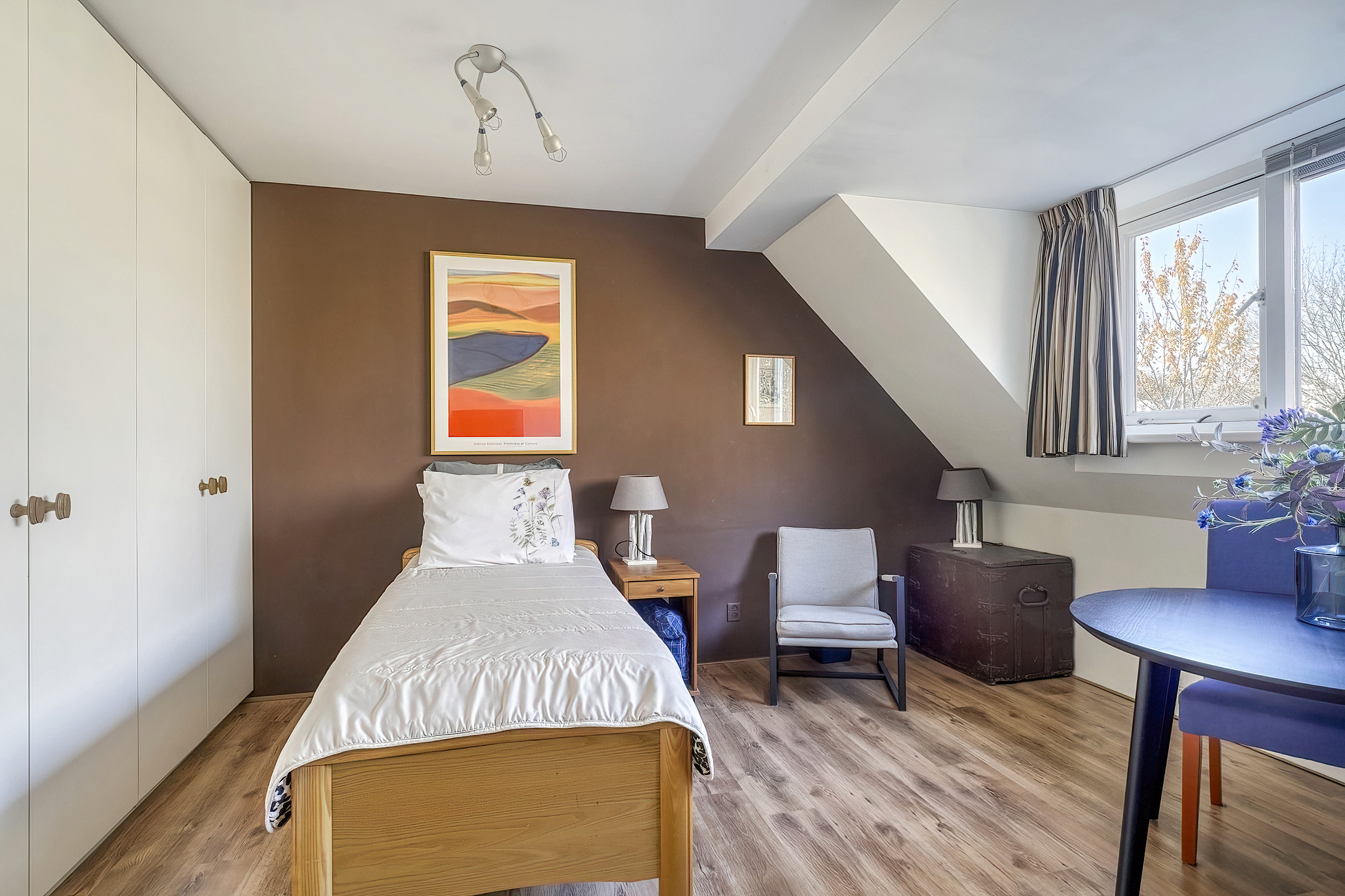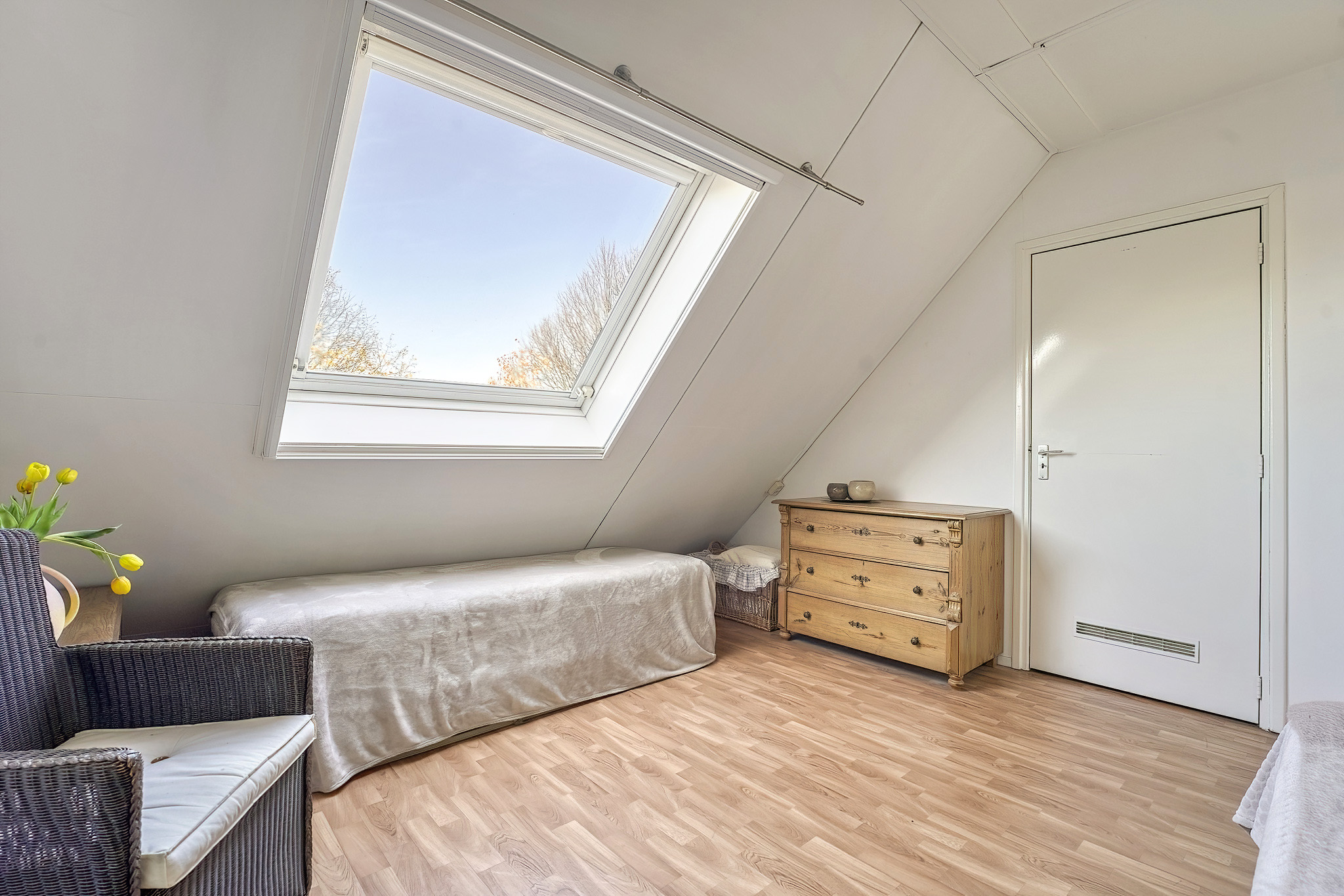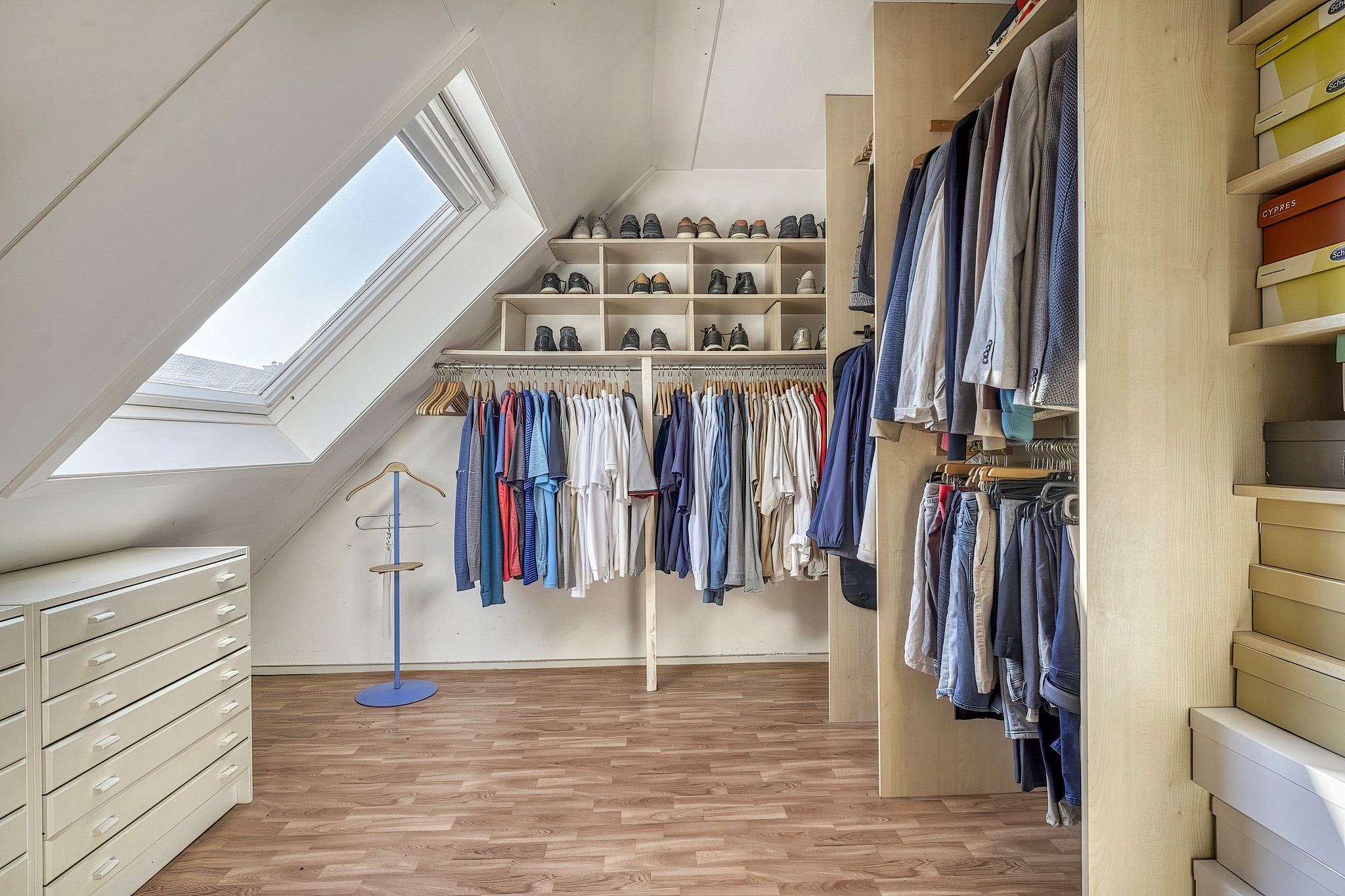 De ruime overloop biedt toegang tot drie slaapkamers en de badkamer. Aan de voorzijde bevindt zich een royale slaapkamer met een vaste kast en toegang tot het balkon. Een heerlijke plek om te genieten van de ochtendzon. De moderne badkamer (volledig vernieuwd in 2023) is uitgerust met een extra brede inloopdouche, tweede toilet, dubbele wastafel met meubel, vloerverwarming en designradiator. Aan de achterzijde ligt nog een ruime slaapkamer met dakkapel en een vaste kastenwand. De kamer boven de voormalige garage heeft eveneens toegang tot het balkon en extra bergruimte achter de verhoogde knieschotten.