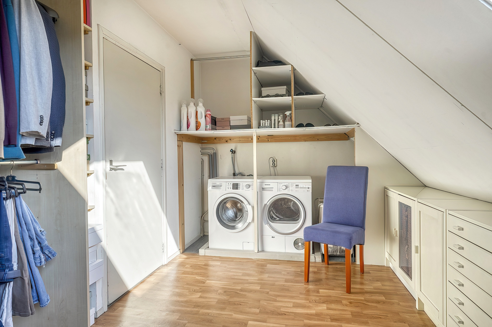 De overloop biedt toegang tot twee ruime kamers. Aan de voorzijde bevindt zich een kamer die momenteel in gebruik is als inloopkast en wasruimte met opstelplaats voor de wasmachine en droger. Tevens de mogelijkheid om hier een extra badkamer te maken. Aan de achterzijde ligt de zesde slaapkamer, met toegang tot de cv-ruimte (2021).