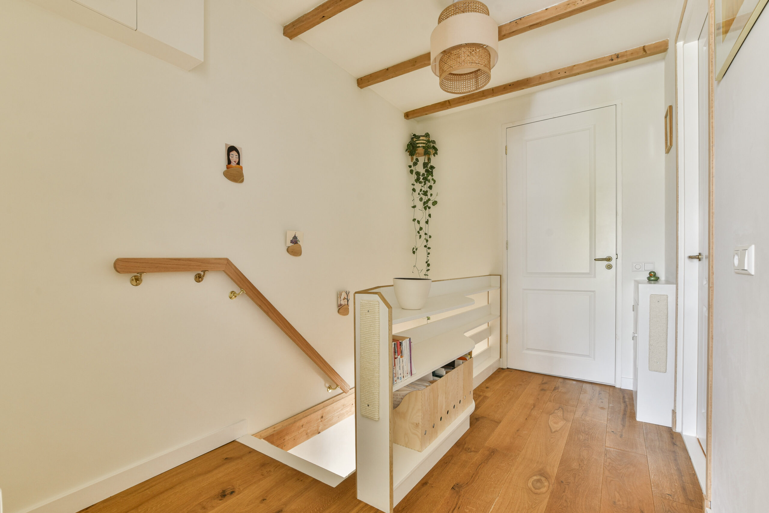 De royale overloop met boekenkast leidt naar drie slaapkamers en een luxe badkamer. De master bedroom en een tweede slaapkamer (met maatwerk bureau en kastenwand) liggen aan de voorzijde, terwijl de derde slaapkamer zich aan de achterzijde bevindt.