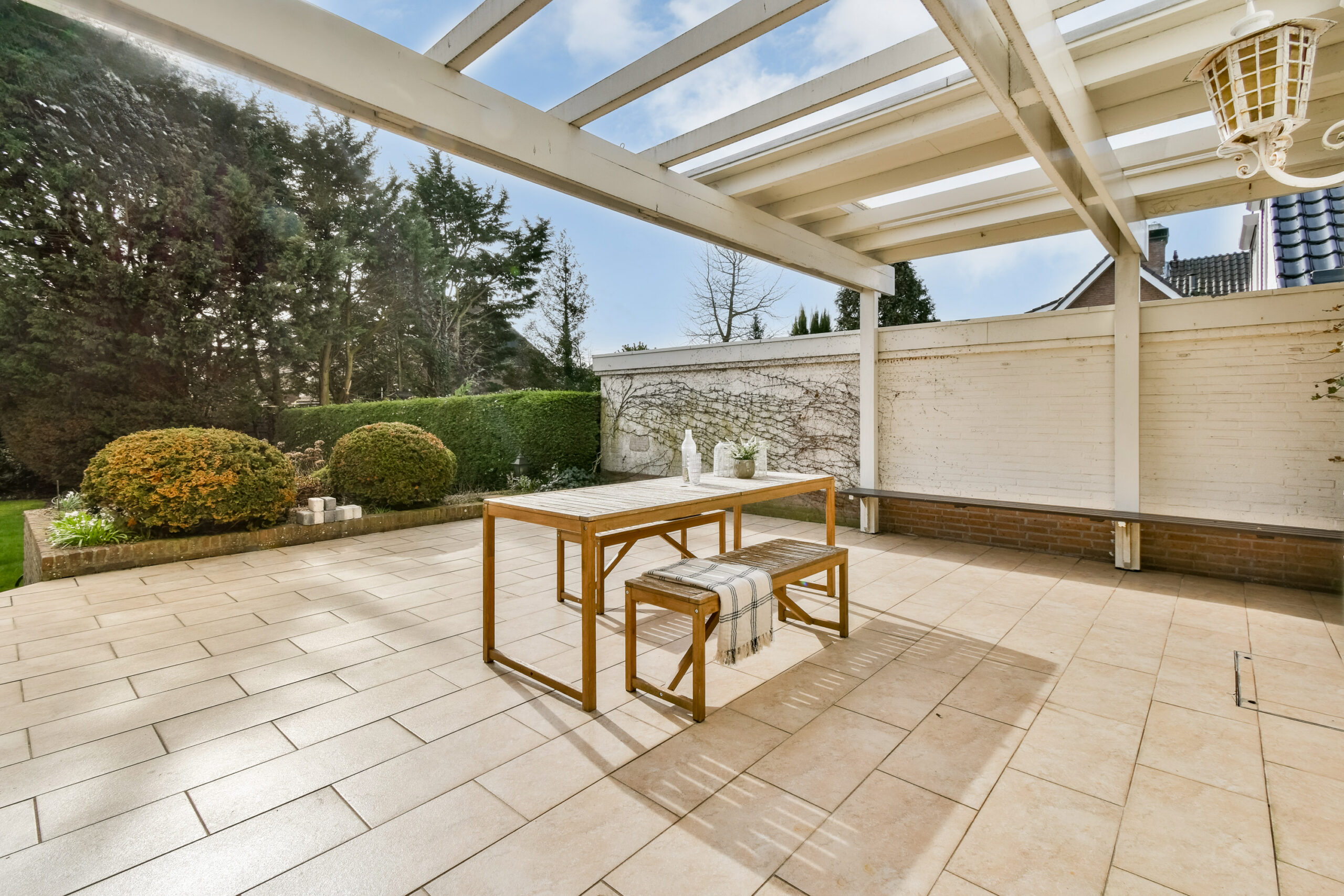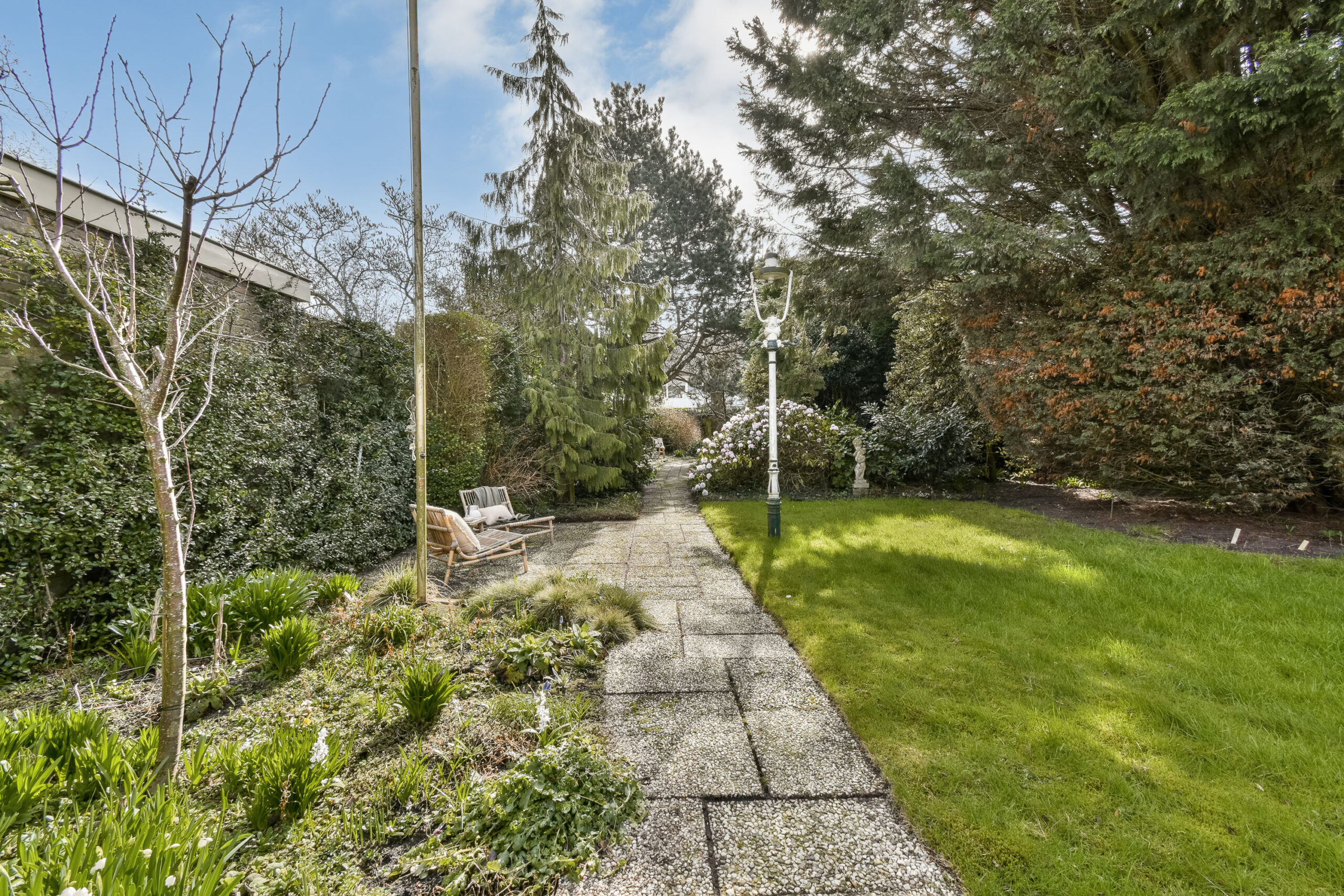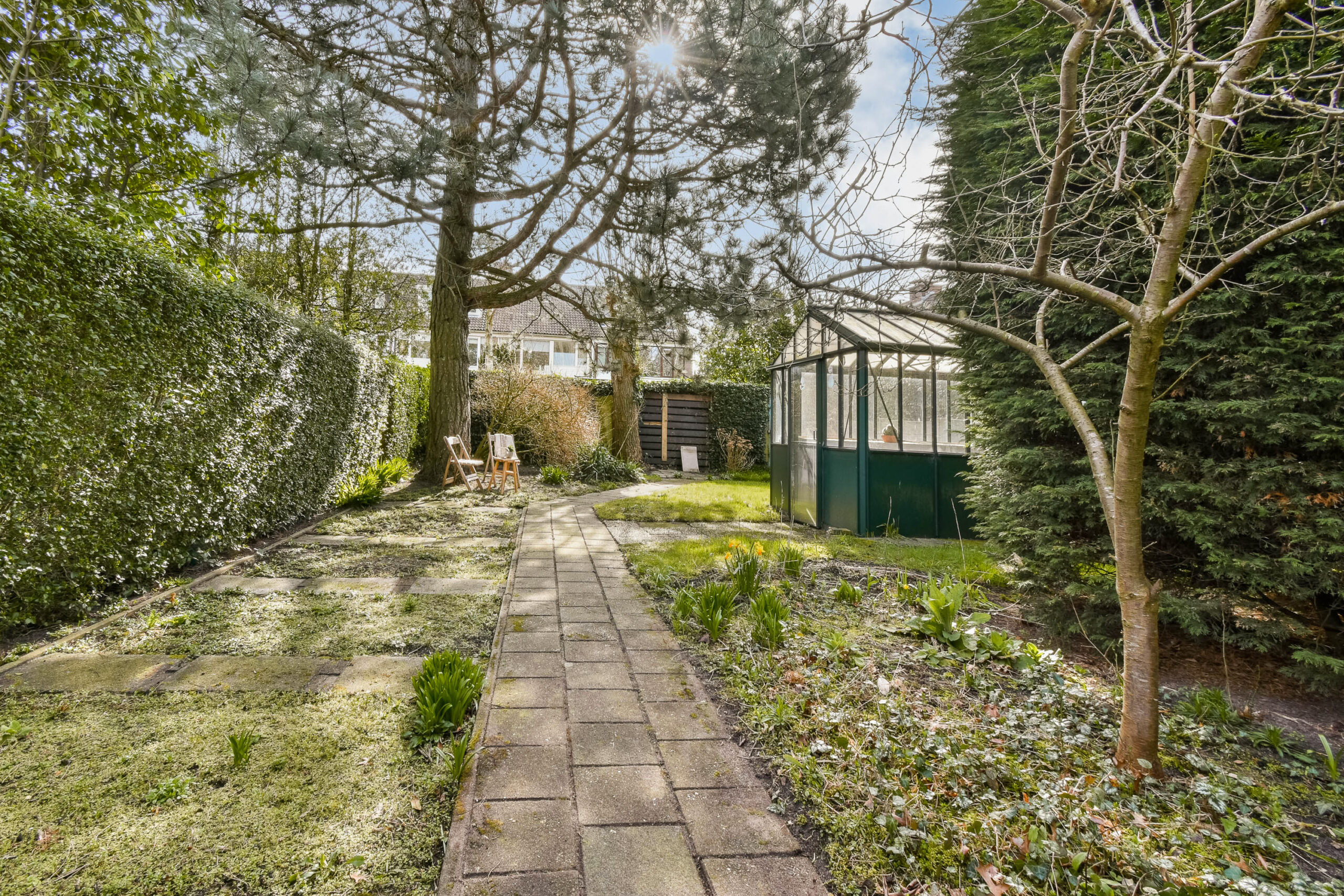 De riante tuin is met zorg aangelegd en biedt veel privacy. Een combinatie van groene borders, een ruim gazon en volwassen bomen zorgt voor een natuurlijke en rustige sfeer, terwijl de bomen op warme dagen voor aangename schaduw zorgen. Achter in de tuin staat een charmante plantenkas waar u naar hartenlust groenten of bloemen kunt kweken.