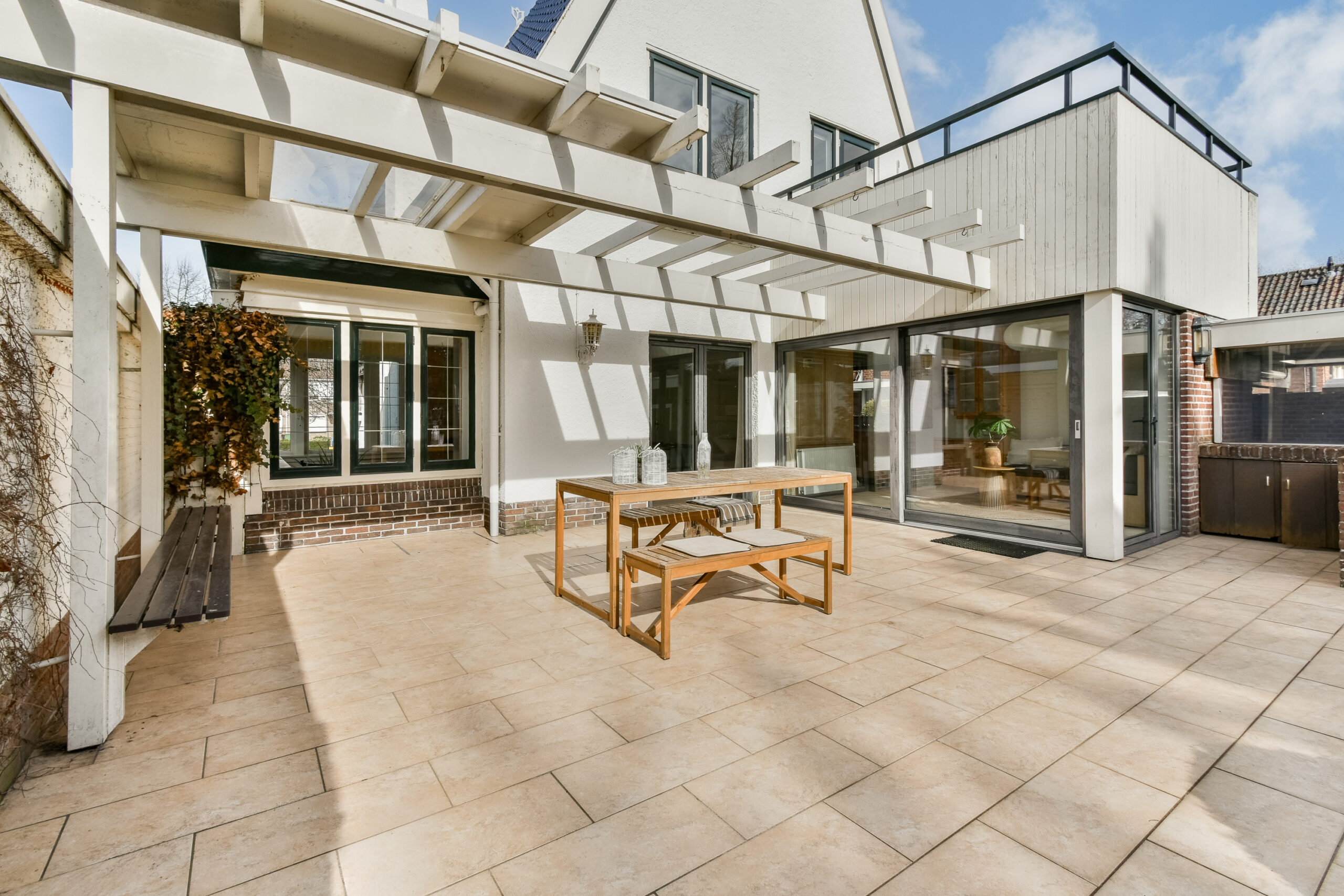 De tuin is bovendien praktisch ingericht met een achterom, een (fietsen)schuur met elektra en wateraansluiting en een garage met ruimte voor één auto. In de garage bevinden zich tevens aansluitingen voor wasmachine en droger. Dankzij meerdere terrassen is er altijd wel een fijne plek in de zon of juist in de schaduw te vinden.