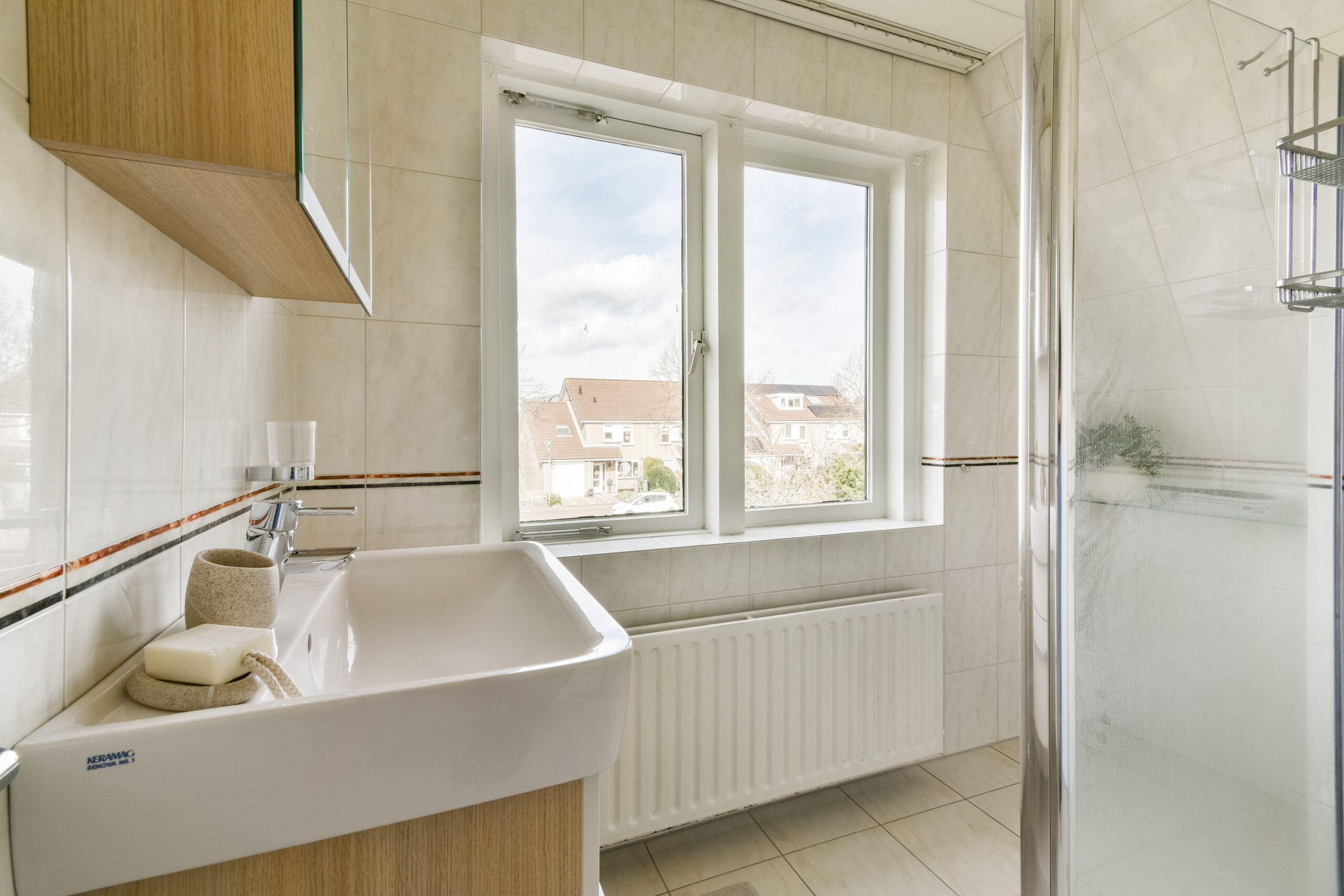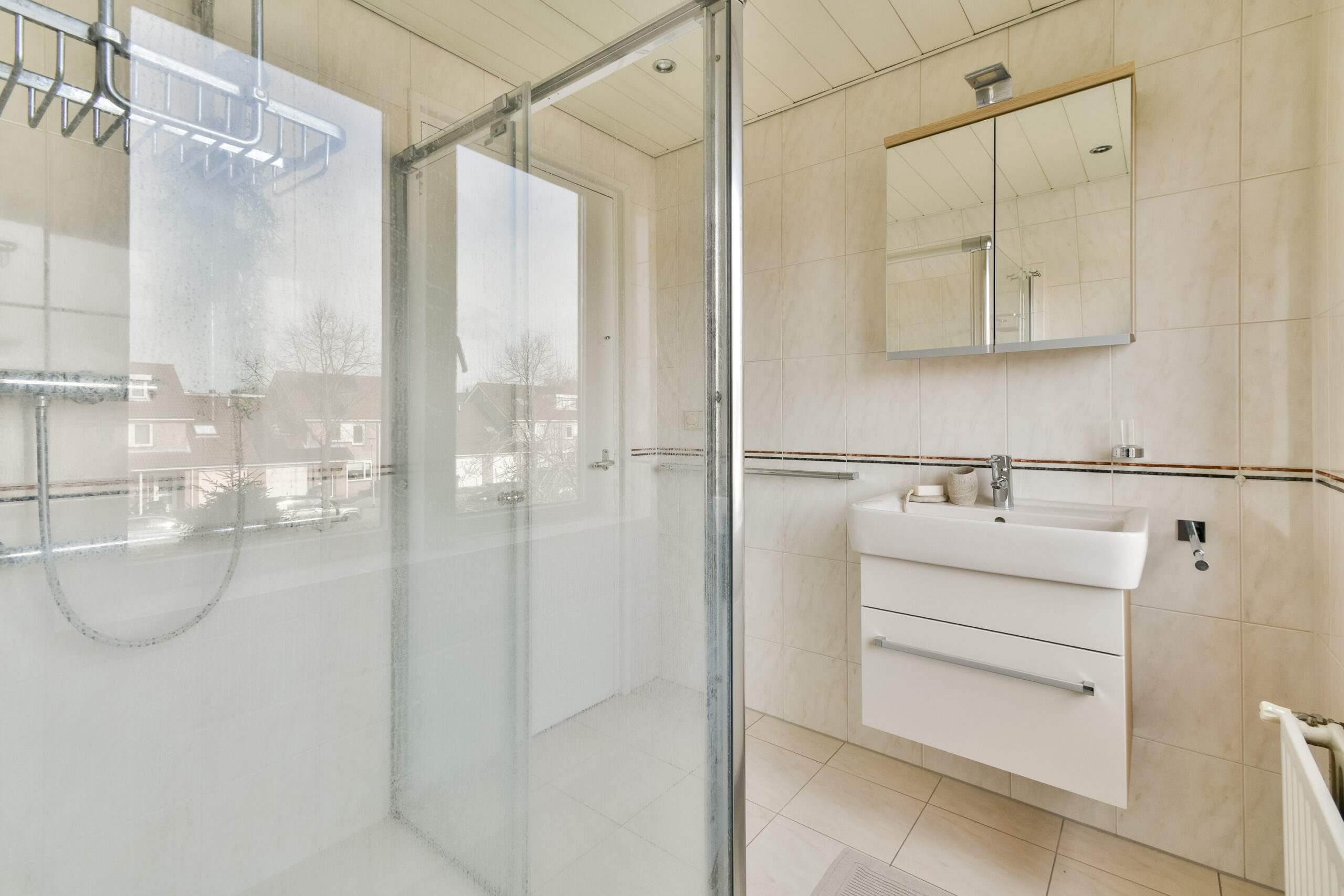 De badkamer is uitgevoerd in neutrale tinten en voorzien van een douchecabine, wastafelmeubel en radiator.