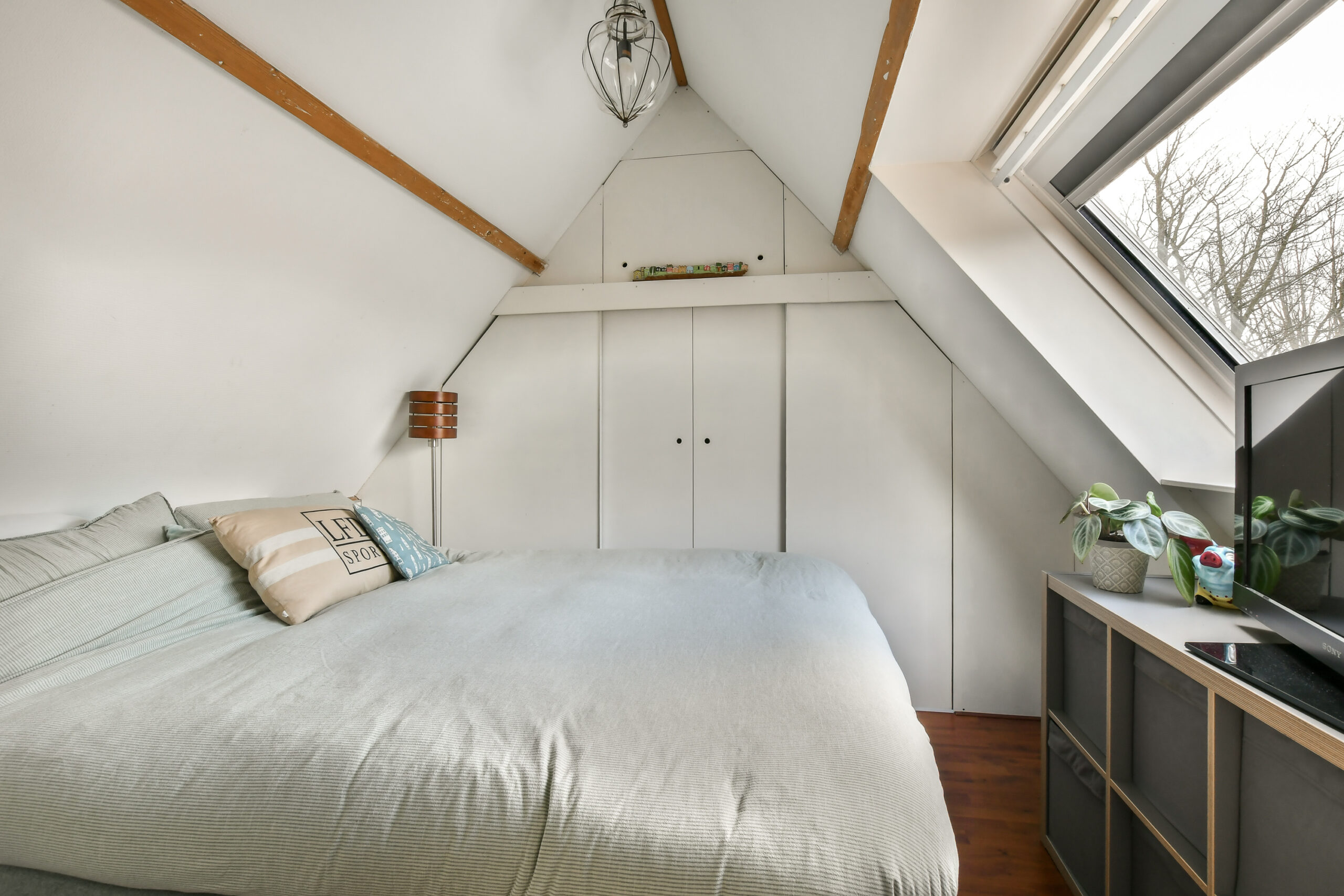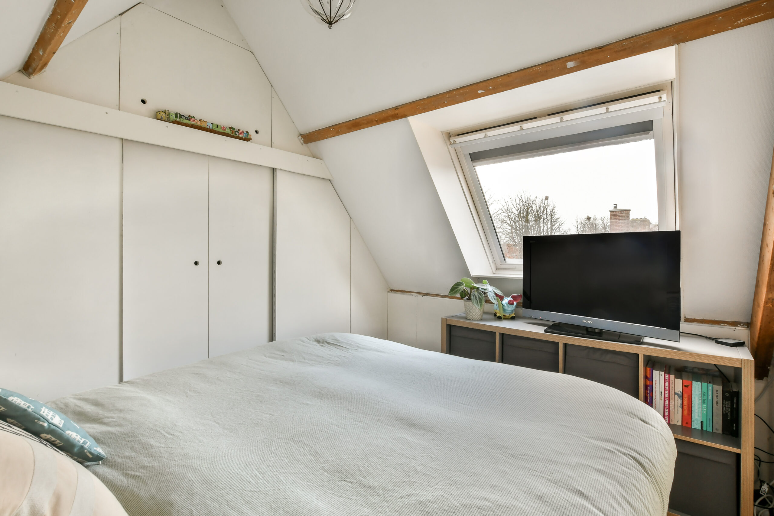 Middels een vaste trap bereikt u de zolderverdieping welke is voorzien van een voorzolder met opbergruimte en aansluitpunten was-/droogmachine en CV-ketel. De derde slaapkamer heeft een dakraam en ontzettend veel bergruimte in de vaste kasten.