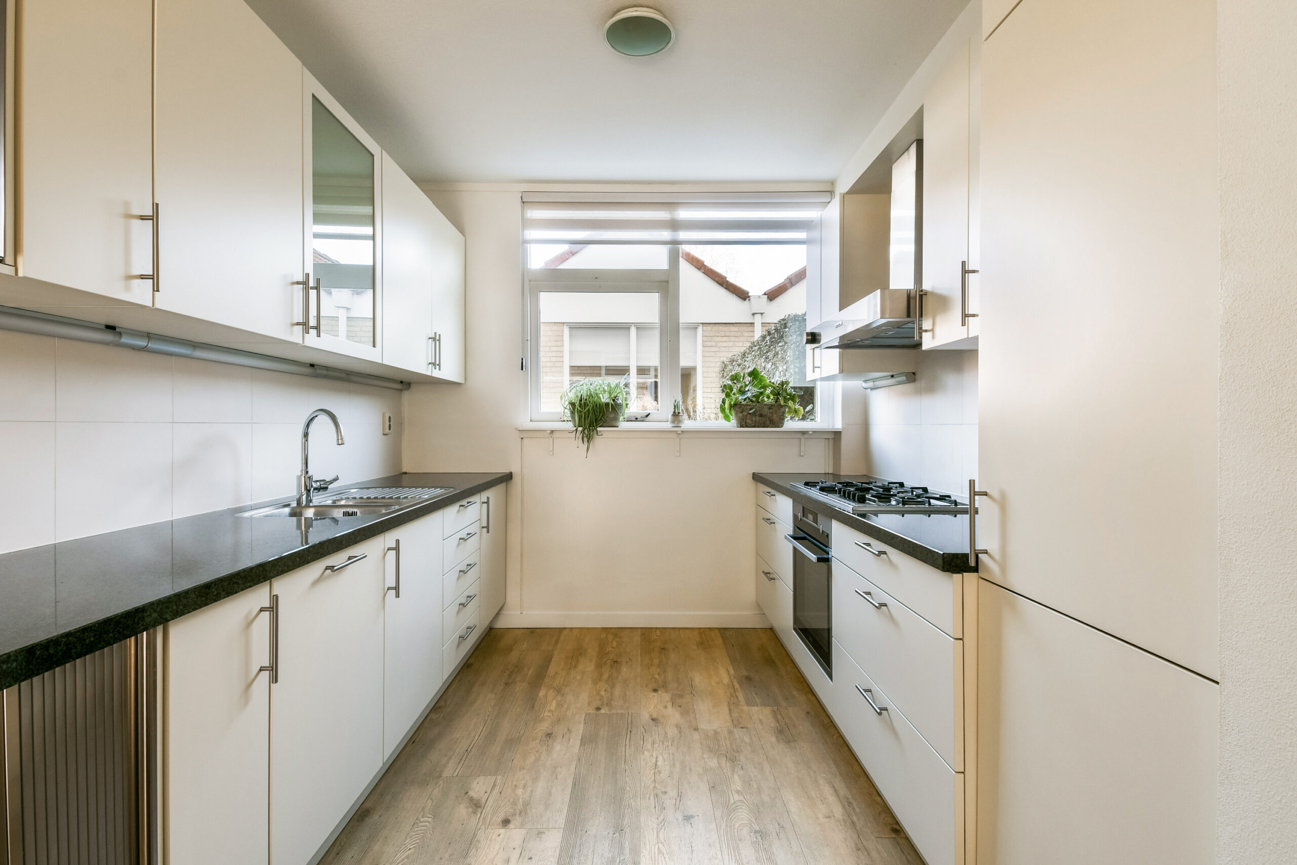 Qua inbouwapparatuur heeft u het volgende tot uw beschikking: vaatwasser (2012), koelkast met vriescompartiment, afzuigkap, 5-pits gasfornuis (incl. wokbrander) en oven.