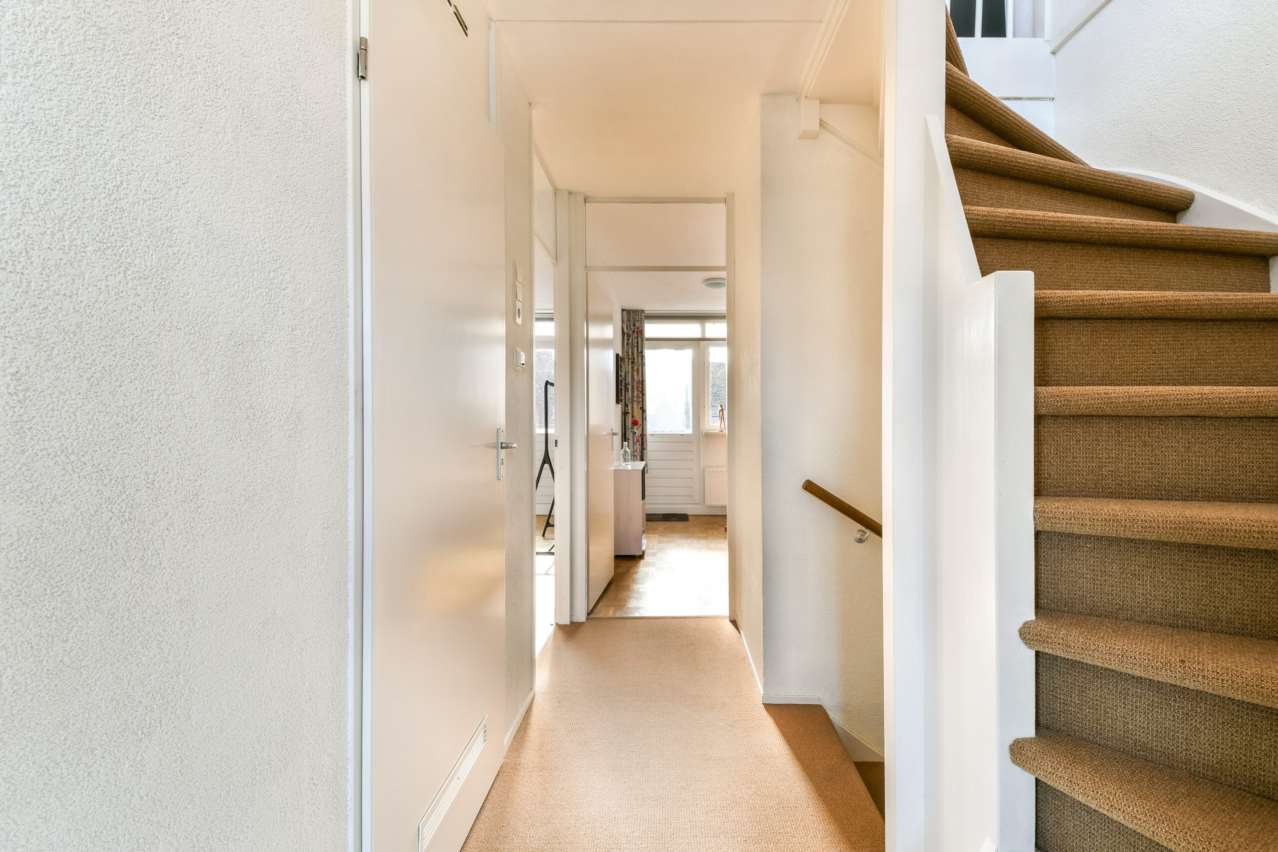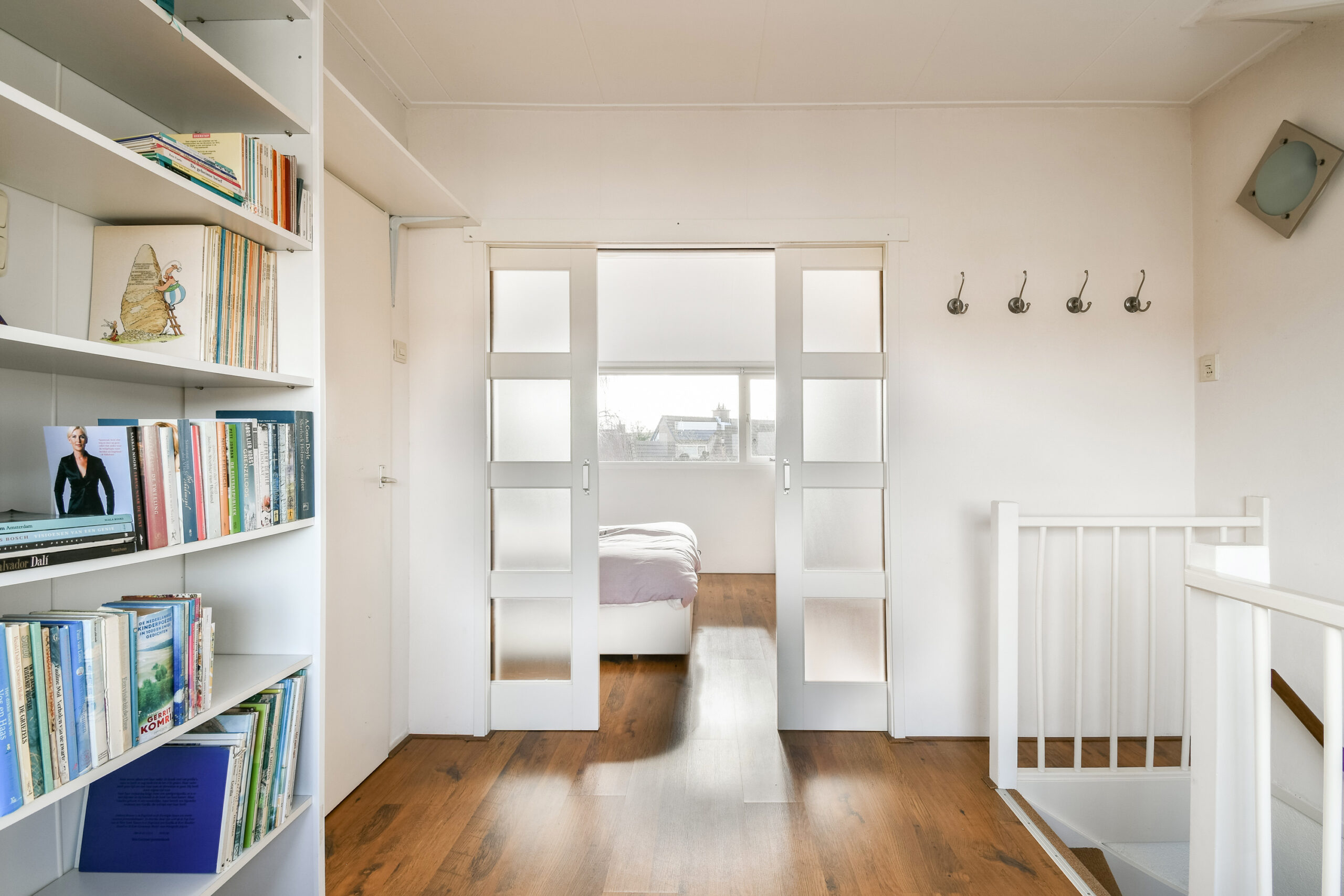 1e verdieping: overloop welke toegang geeft tot de drie slaapkamers en badkamer. Er zijn twee slaapkamers aan de achterzijde gelegen welke beide toegang hebben tot het balkon. De ruime slaapkamer over de gehele breedte van de woning is aan de voorzijde gesitueerd. Twee van de drie slaapkamers hebben inbouwkasten.