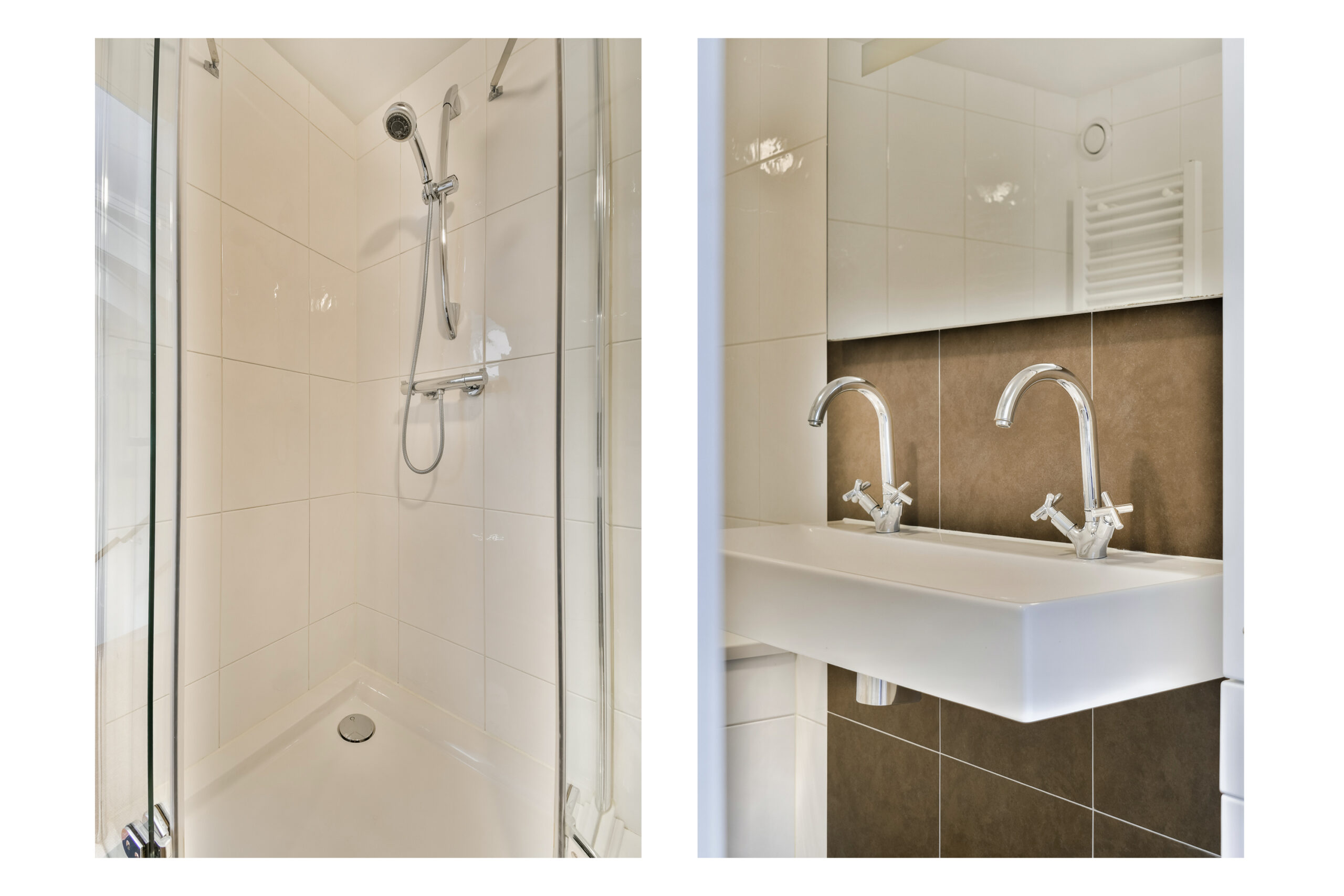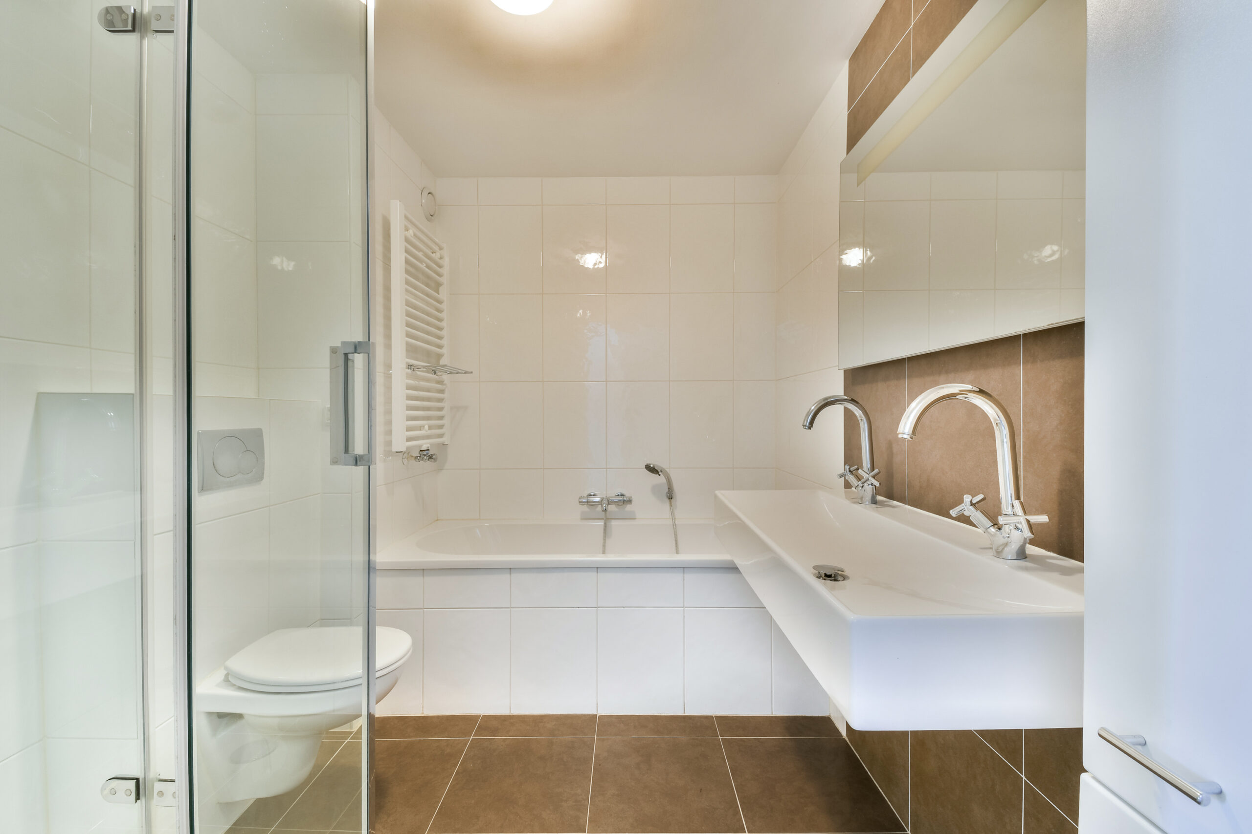 De badkamer is voorzien van een douchecabine, toilet, elektrische vloerverwarming, duo wastafelmeubel met een grote spiegel, ligbad, badkamerkasten en een design radiator.