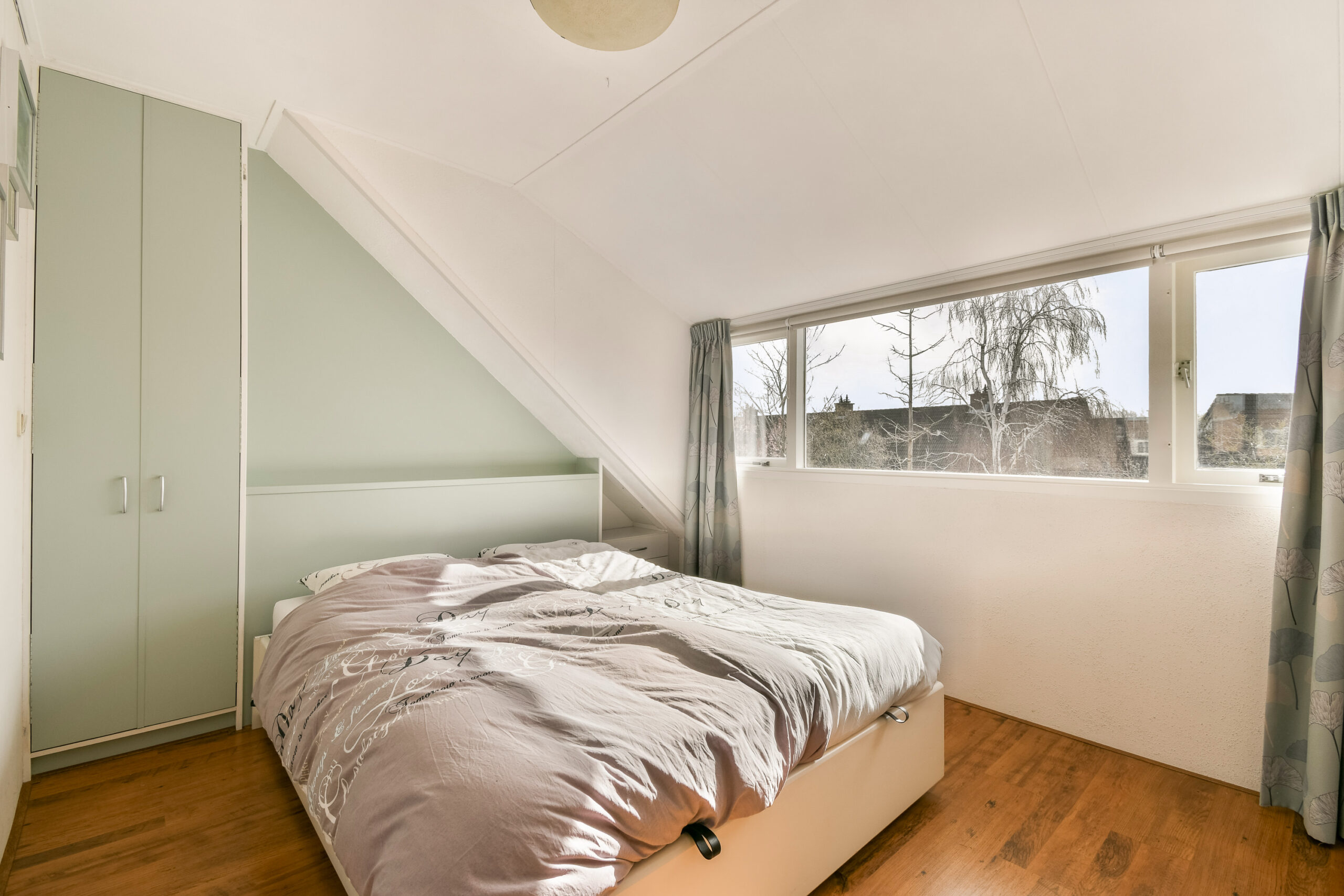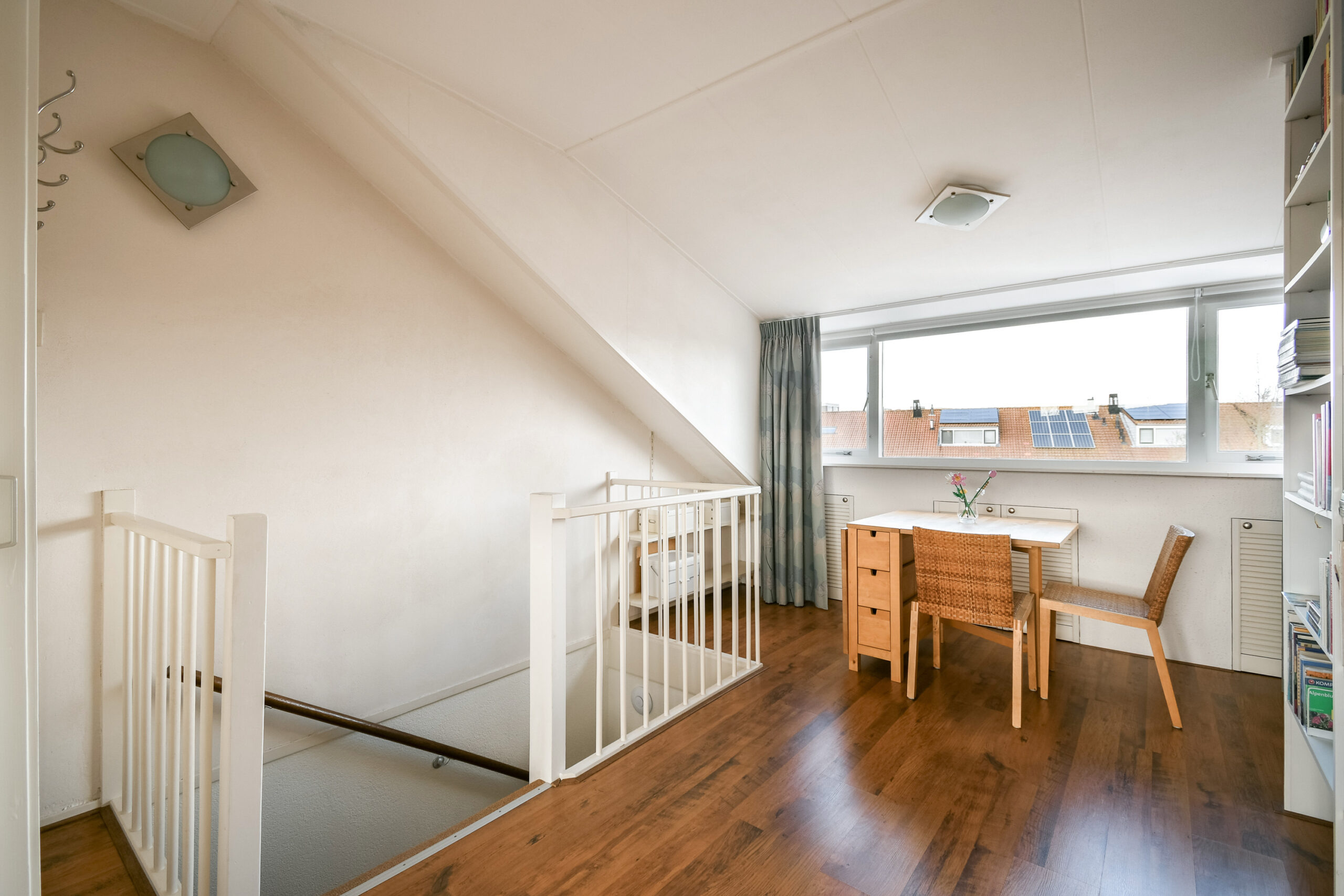 Middels een vaste trap bereikt u de zolderverdieping. Dit is een bijzonder ruime kamer en is nu middels een schuifdeur gesplitst in een slaapkamer en werkkamer. Door het geplaatste dakkapel is er extra ruimte ontstaan. Achter de knieschotten is er bergruimte alsmede in een inbouwkast. Een aparte technische ruimte met de opstelling voor de wasmachine, droger, mechanische ventilatie en cv-ketel. Ook hier is nog ruimte aanwezig voor het opbergen van uw spullen. Deze verdieping is voorzien van een laminaatvloer.