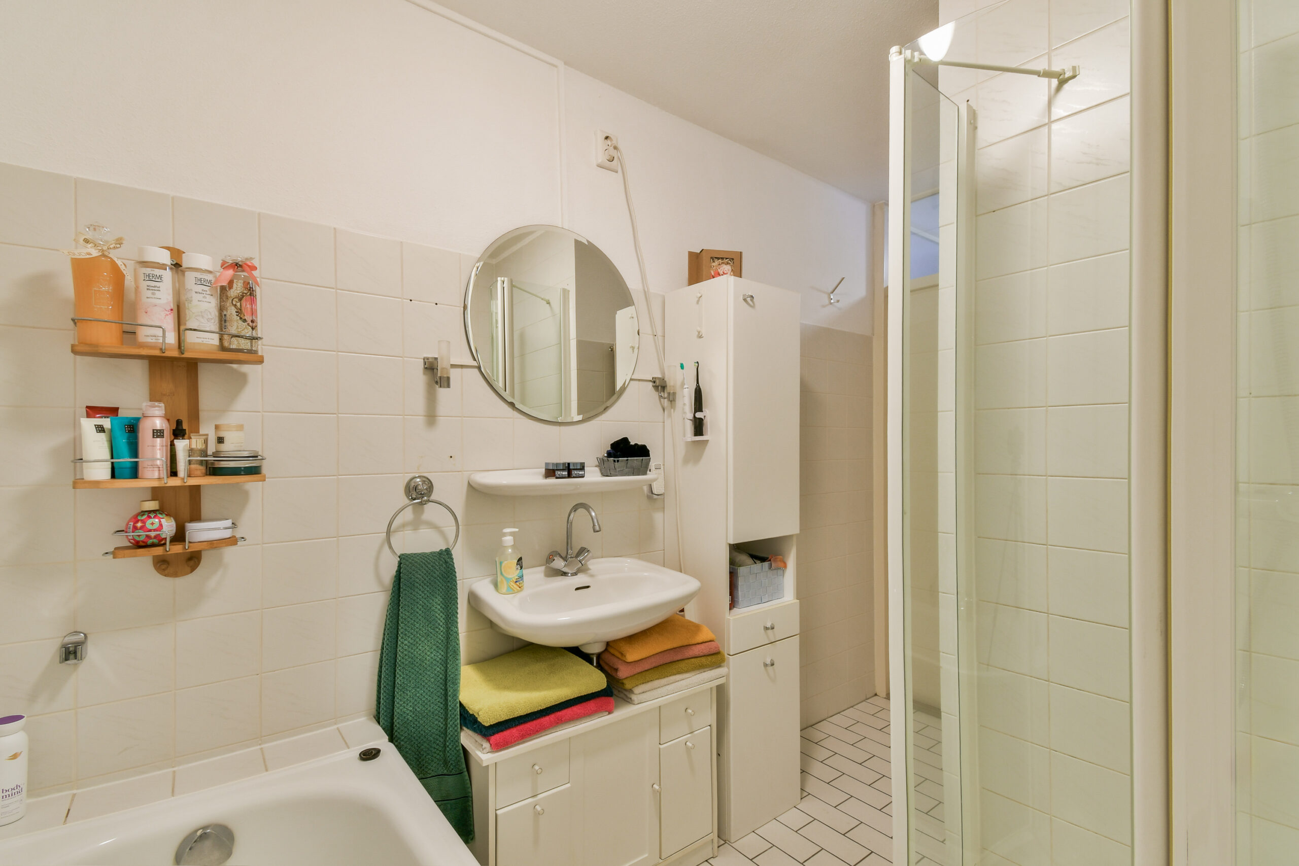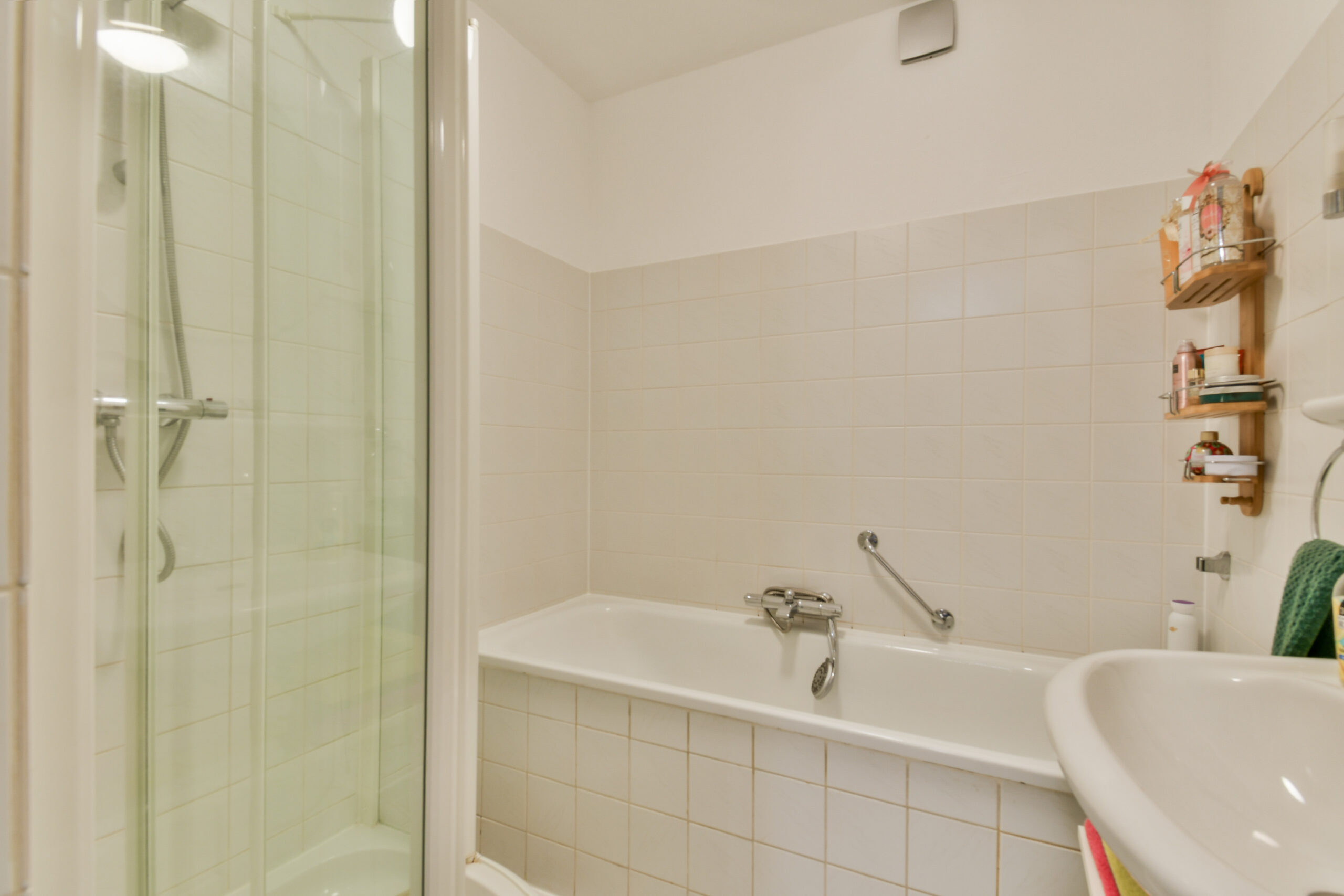 De ruime badkamer is praktisch ingedeeld en beschikt over een douche, bad, wastafel en handdoekradiator. Hiernaast vind u een apart toilet met fonteintje.