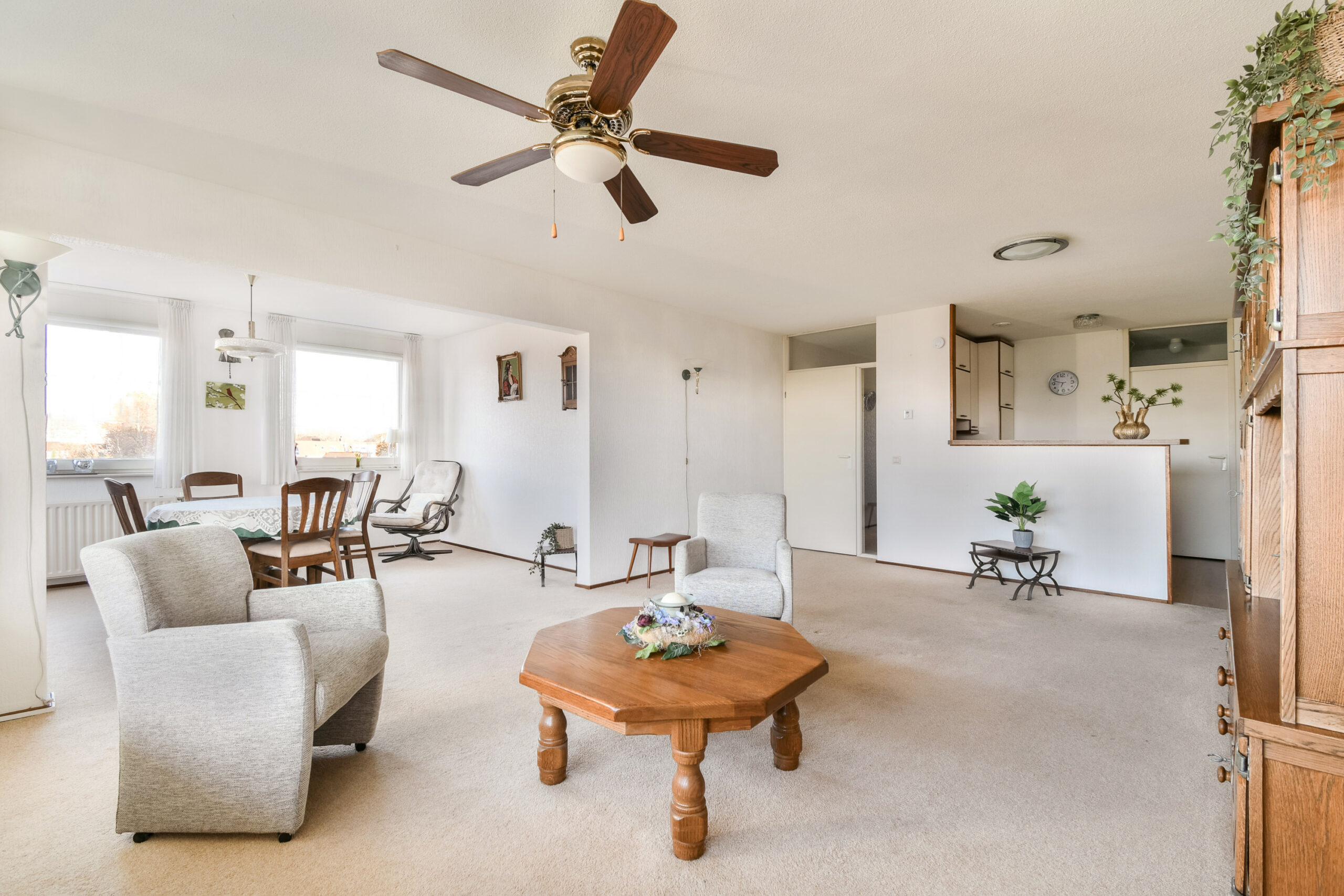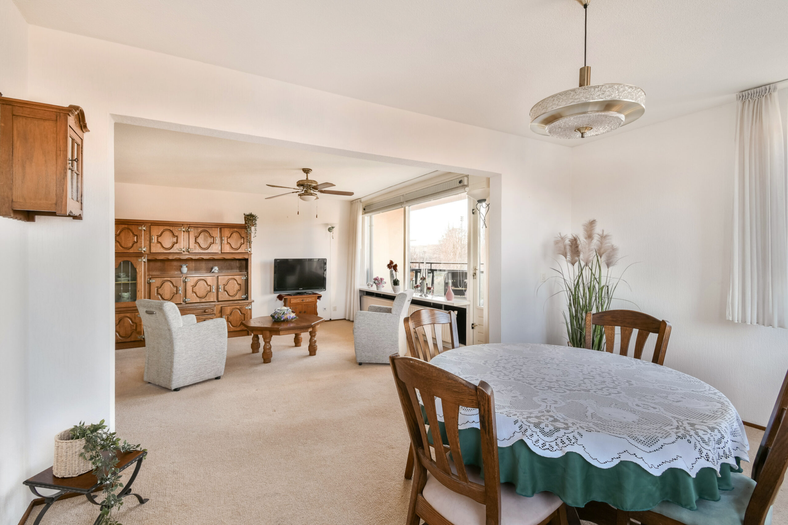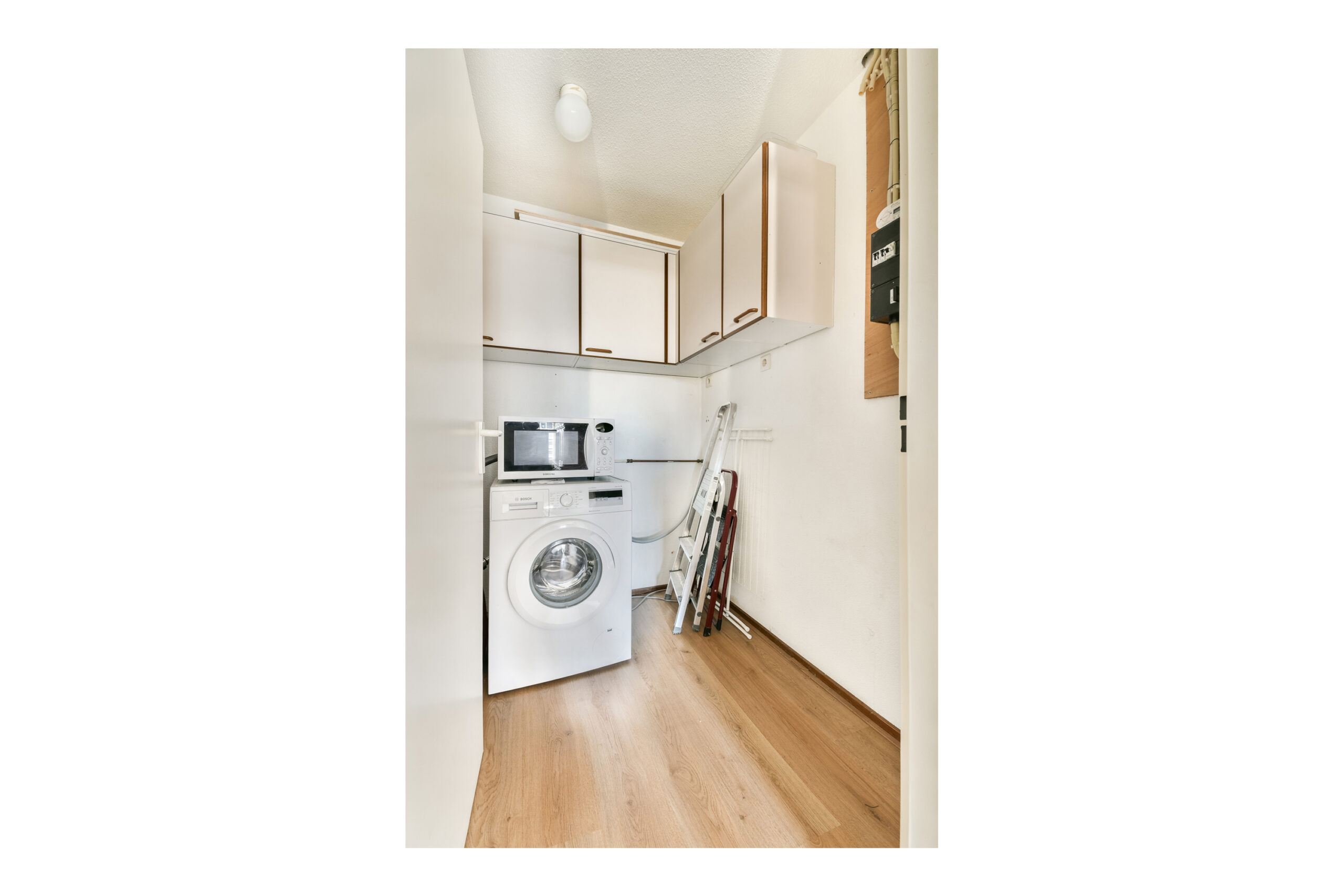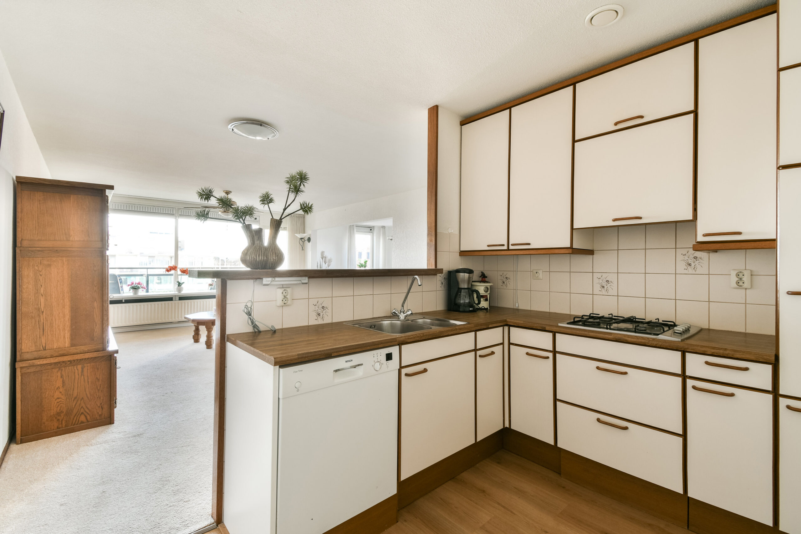 De ruime woonkamer heeft een zithoek met deur naar het balkon (middag- en avondzon) en een ruime zijkamer/ eetkamer. De halfopen keuken in L-vormige keukenopstelling is uitgevoerd met een 4-pits gaskookplaat, koelkast, afzuigkap, vaatwasmachine en doorgang naar de bijkeuken met technische ruimte v.v. wasmachine/drogeraansluiting en opstelling CV-combiketel (Nefit, 2021).