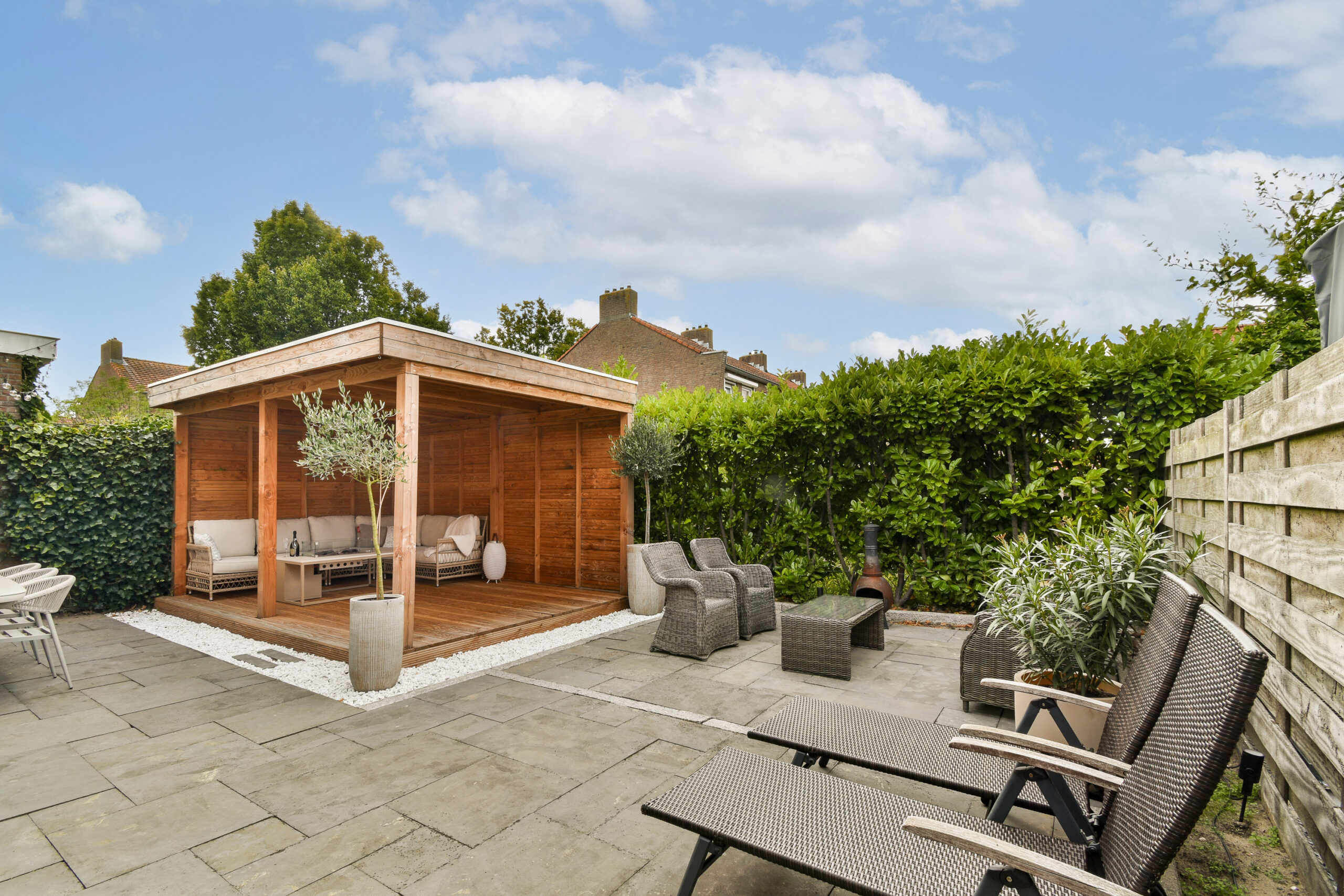 De voor- en achtertuin zijn fraai aangelegd met terrassen, hagen en bloemperken. In de voortuin is parkeergelegenheid voor twee auto’s op eigen terrein. De achtertuin grenzend aan het water biedt een gezellige veranda, ideaal voor lange zomeravonden. Zowel op de begane grond als de eerste verdieping is zonwering aanwezig en de achterom bevindt zich aan de zijkant van de woning.