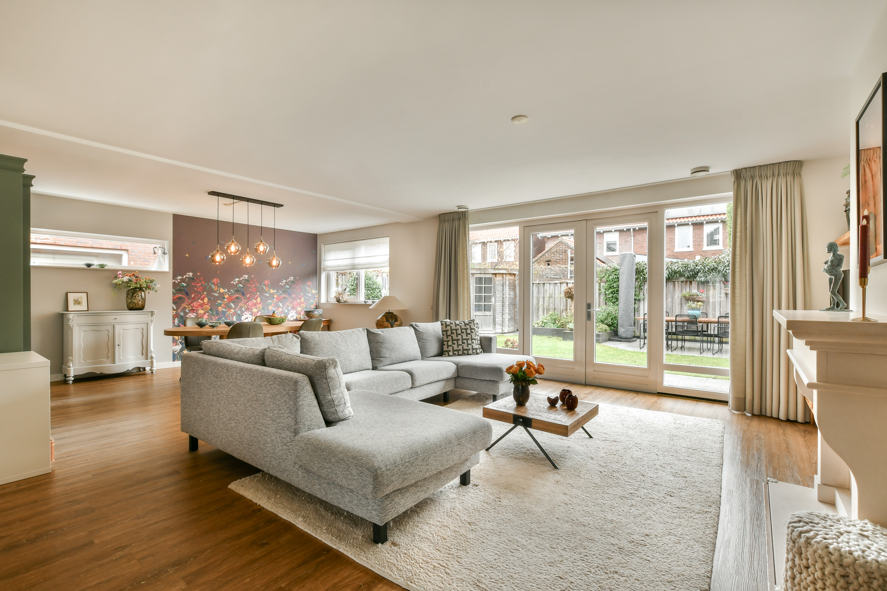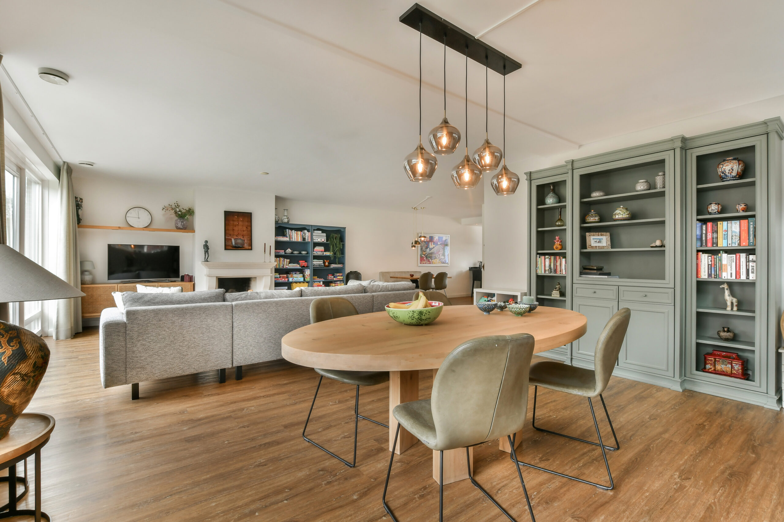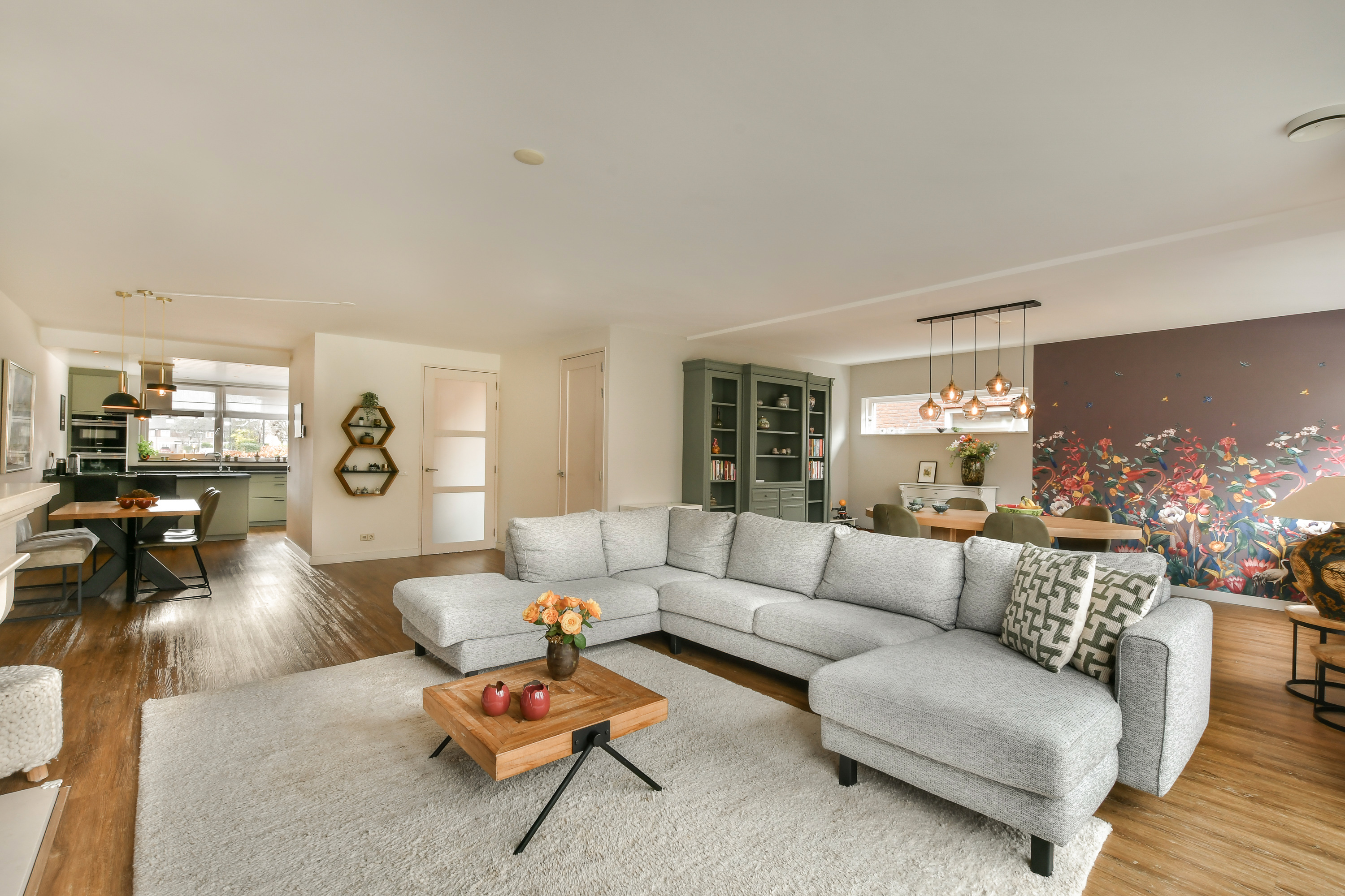 Riante woonkamer met ruimte voor twee eethoeken en een groot zitgedeelte