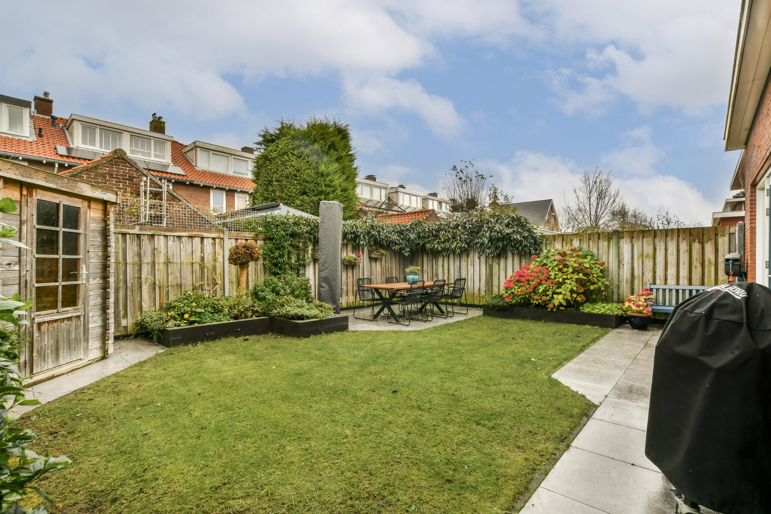 In de voortuin ligt, naast de oprit, een gezellig terras. De fraai aangelegde achtertuin heeft een berging en een achterom.